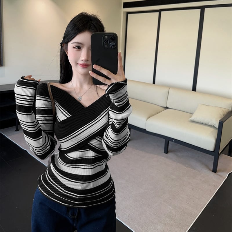 【tops】クロスネックニットトップス Q7117