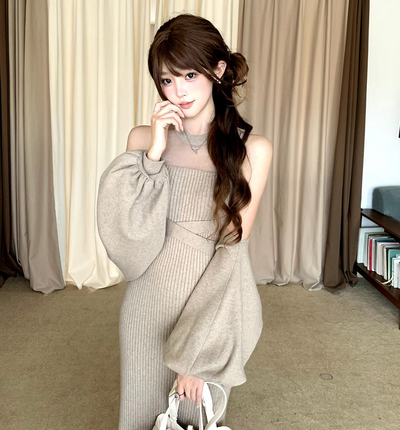 レイヤードしたオープンショルダーや、羽織風なスタイリングなど、様々な着こなしのアレンジが可能。