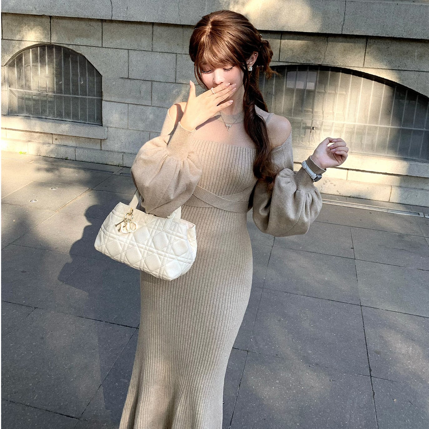 トップスはぽわんとしたボリューム袖がフェミニンなポイントです。