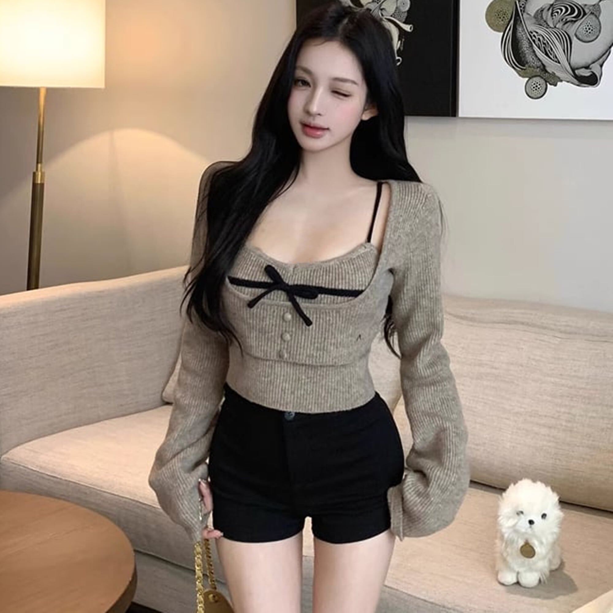 【set】スクエアネックニットトップス×リボンキャミソールセット Q7132