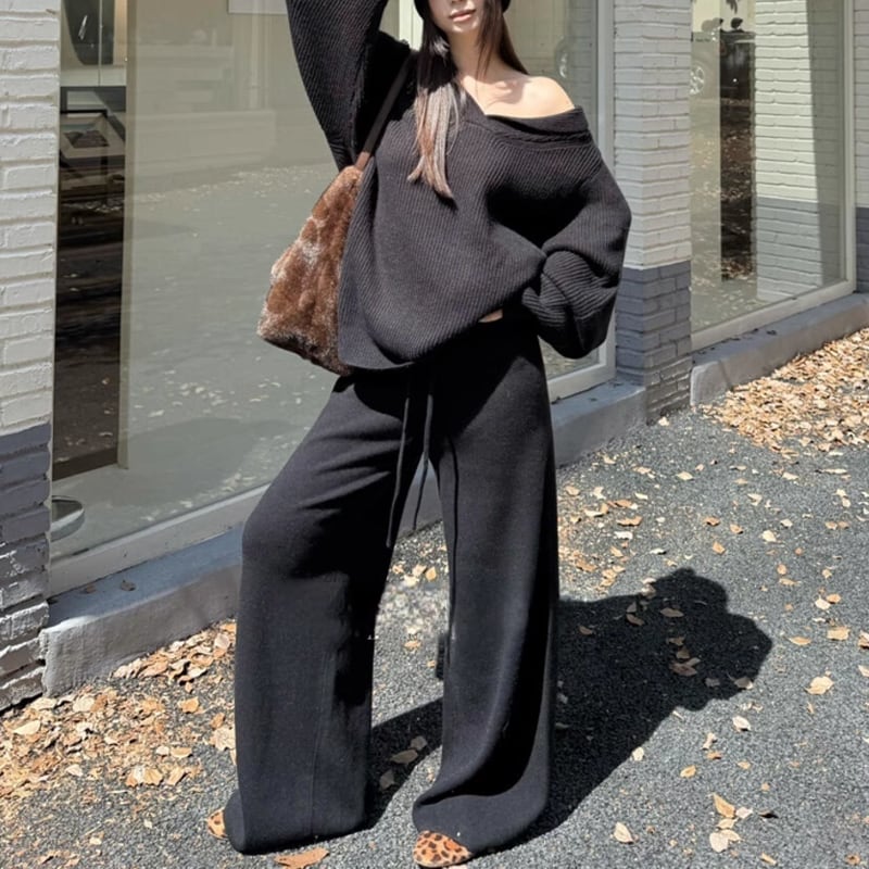 【set】Vネックニットトップス×ワイドパンツセット Q7156