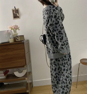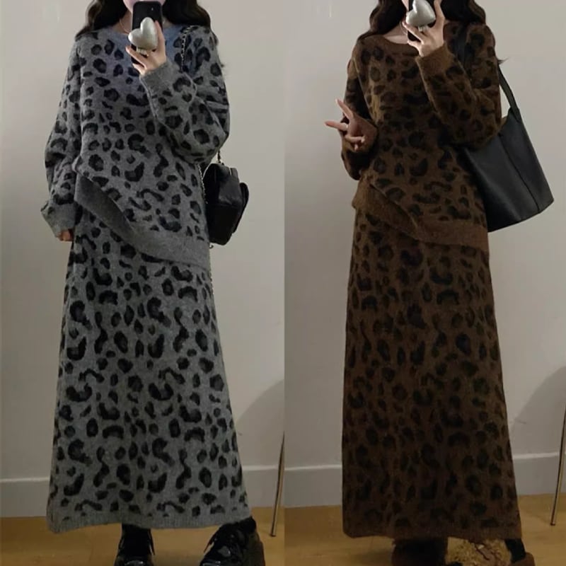 【set】ヒョウ柄ニットトップス×ロングスカートセット Q7167