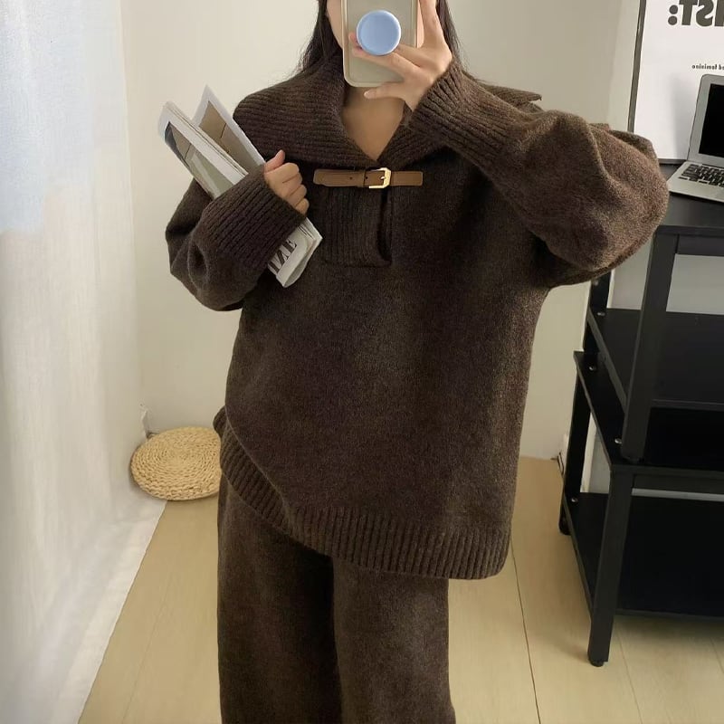 【set】ベルトデザインニットトップス×ワイドパンツセット Q7174