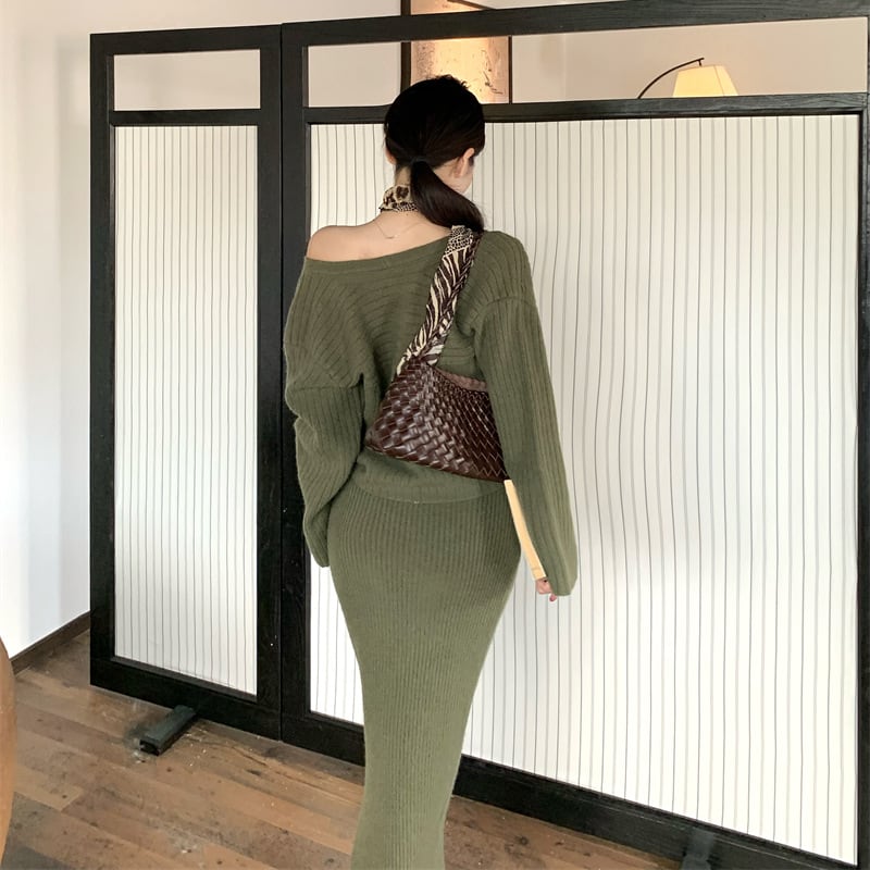 【set】Vネックニットトップス×ロングスカートセット Q7178