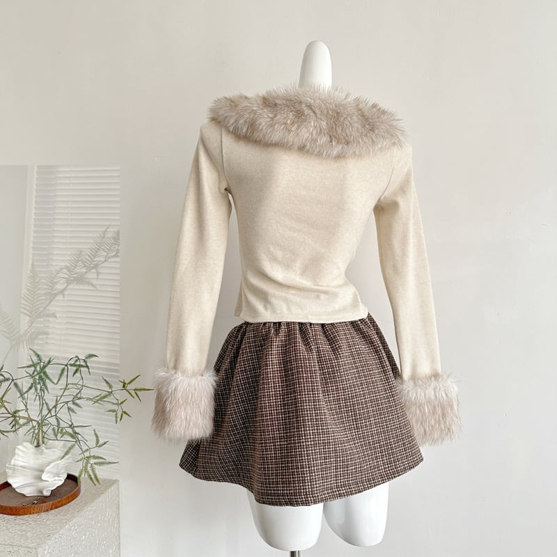 【set】ネックファーニットカーディガン×チェック柄スカートセット Q7189