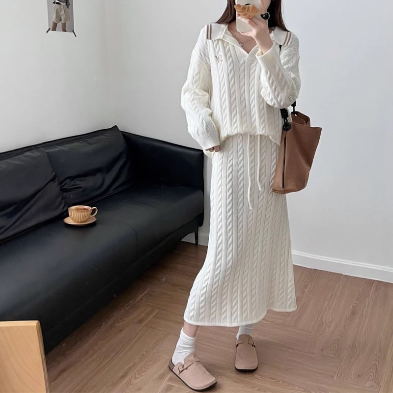 【set】Vネックニットトップス×ロングスカートセット Q7217