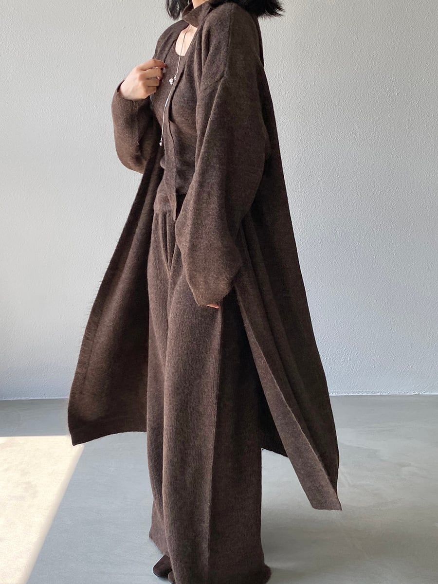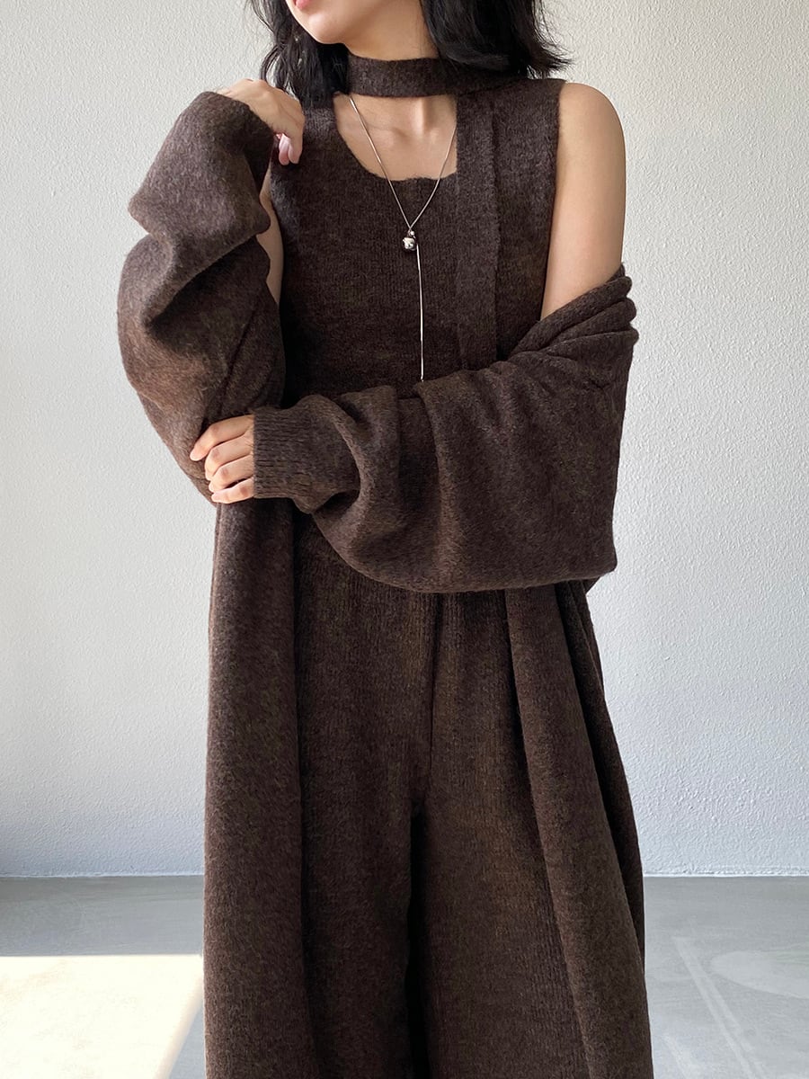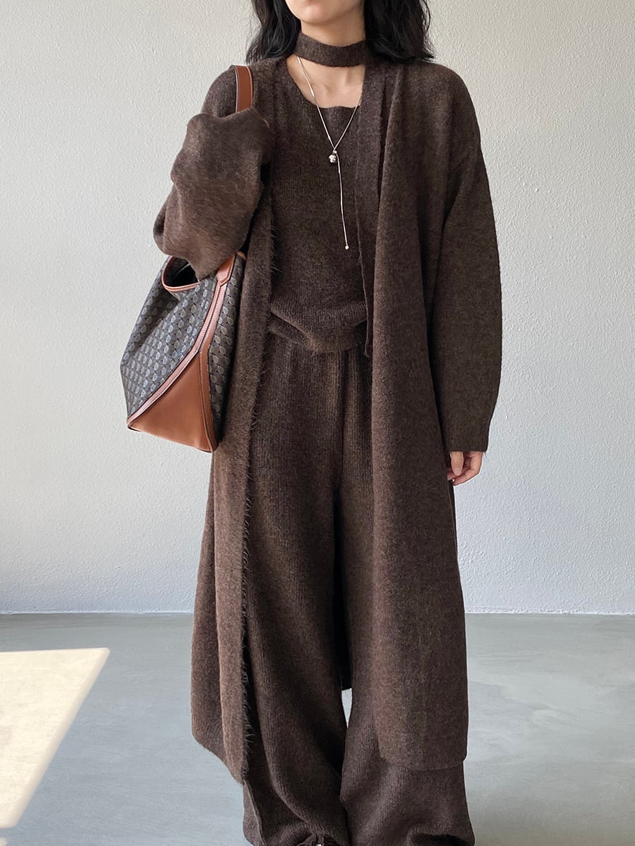 【set】ロングカーディガン×スカーフ付きベスト×ワイドパンツ3点セット Q7235