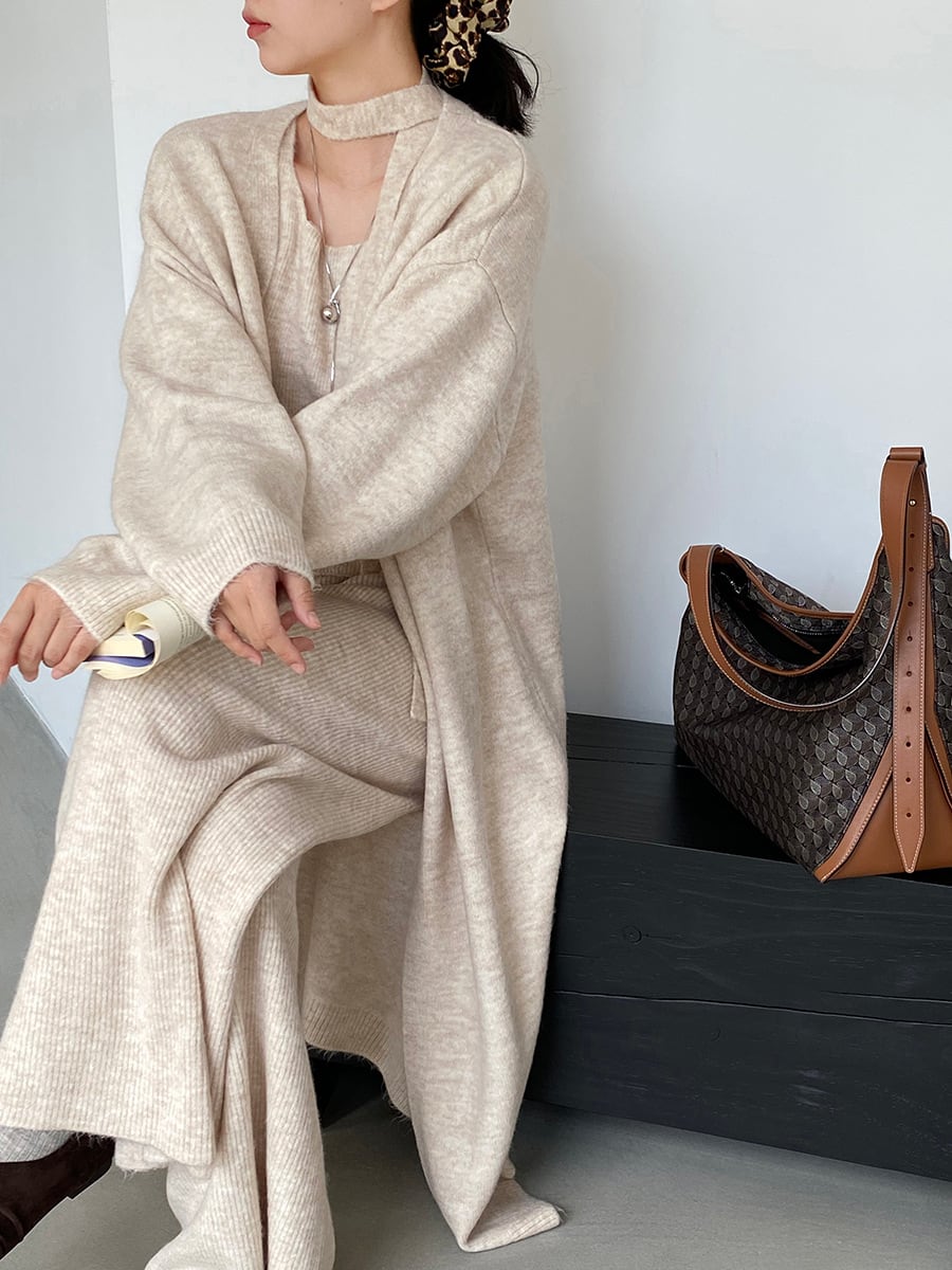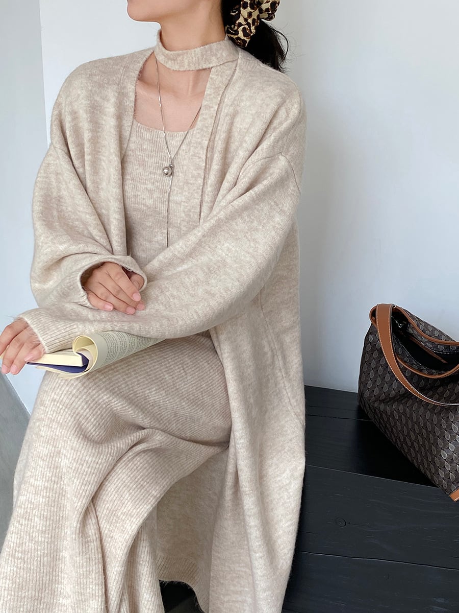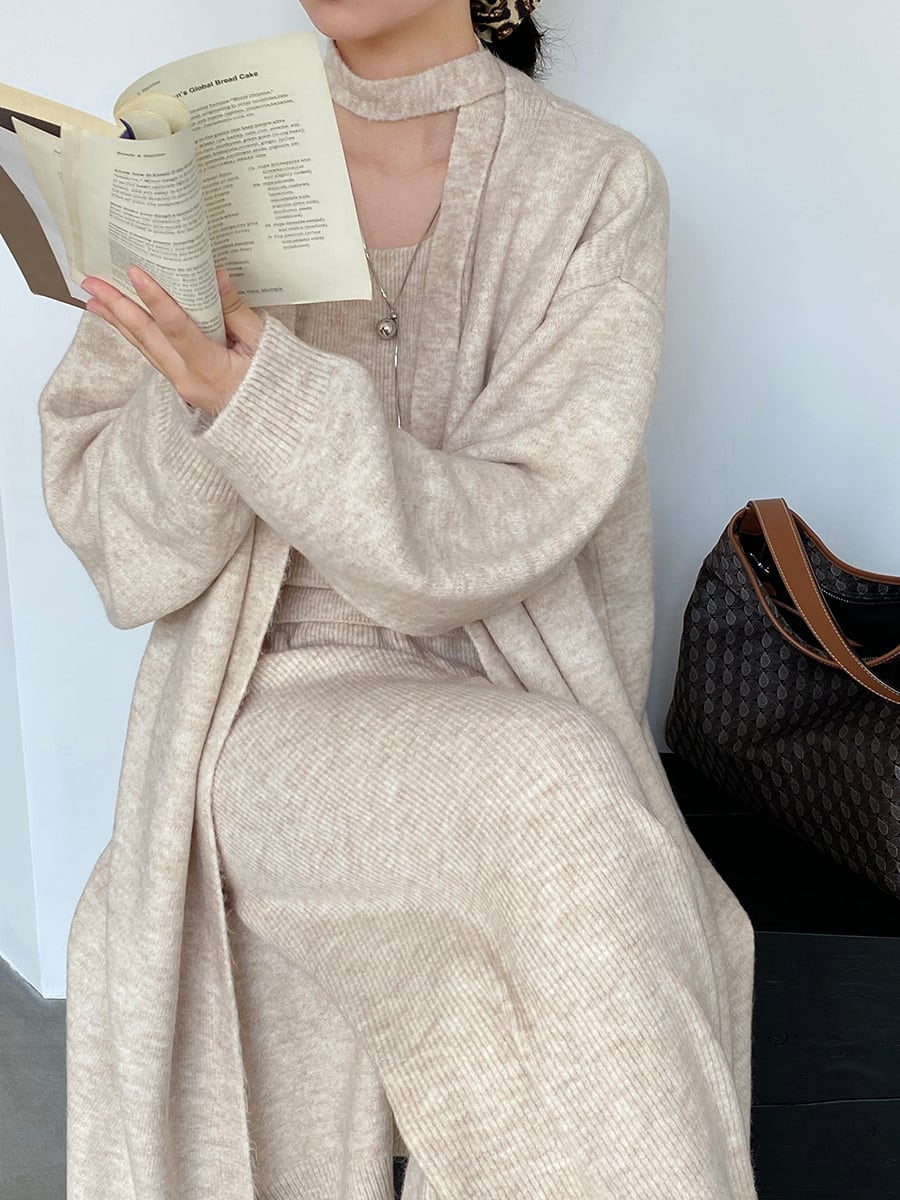 【set】ロングカーディガン×スカーフ付きベスト×ワイドパンツ3点セット Q7235