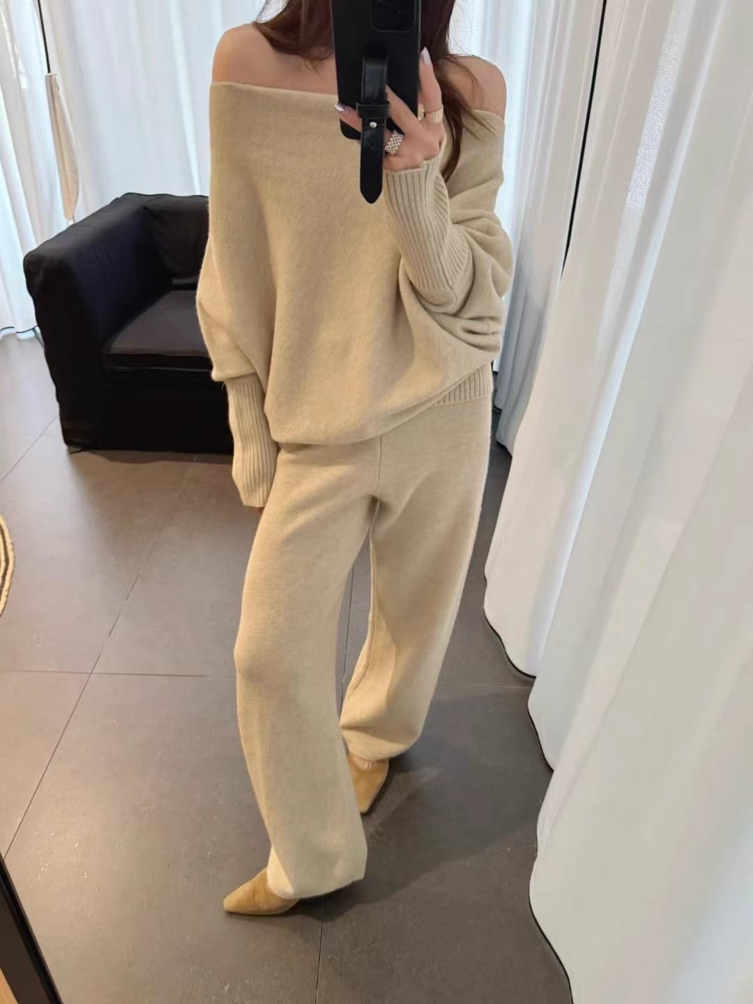 【set】オフショルダーニットトップス×ワイドパンツセット Q7245