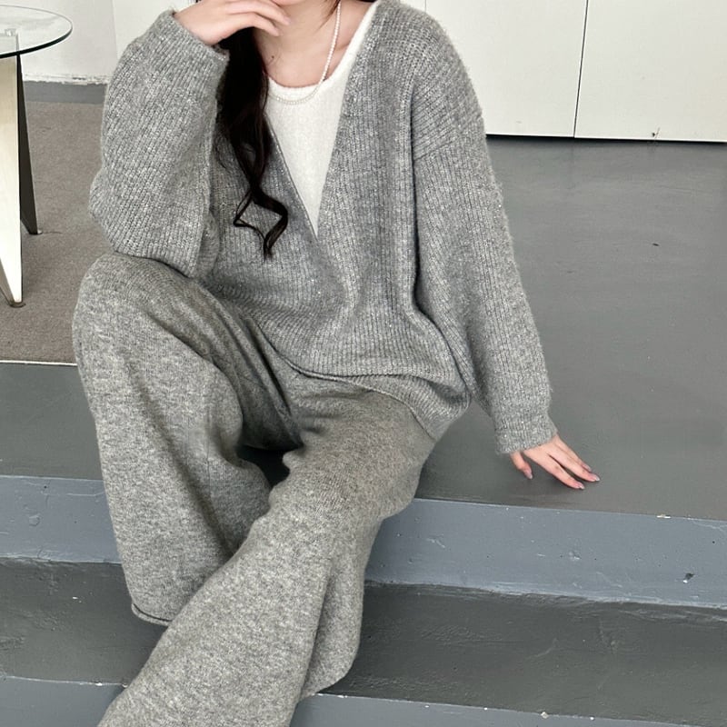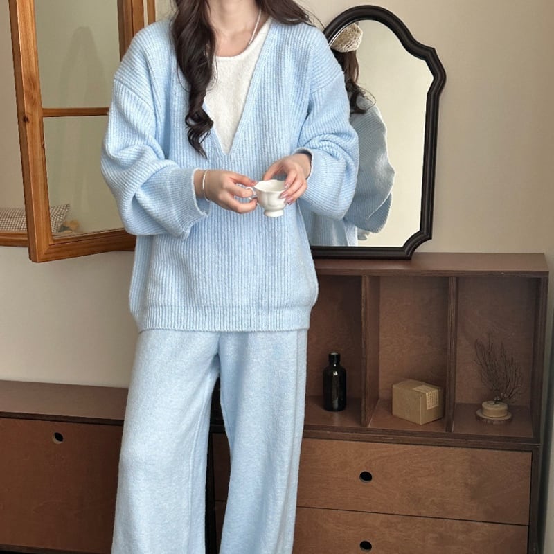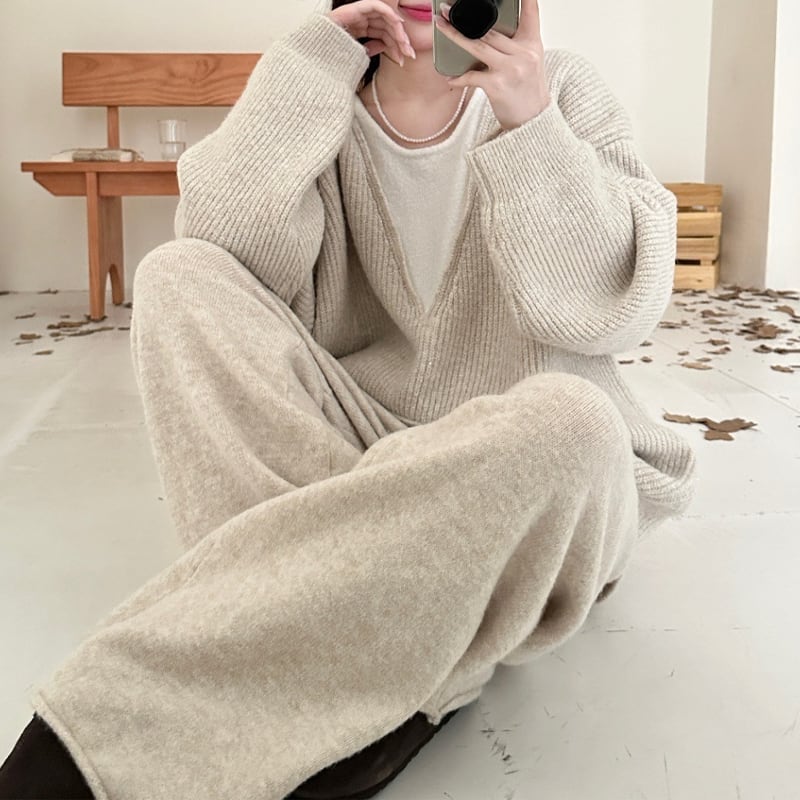 【set】フェイクレイヤードニットトップス×ワイドパンツセット Q7247