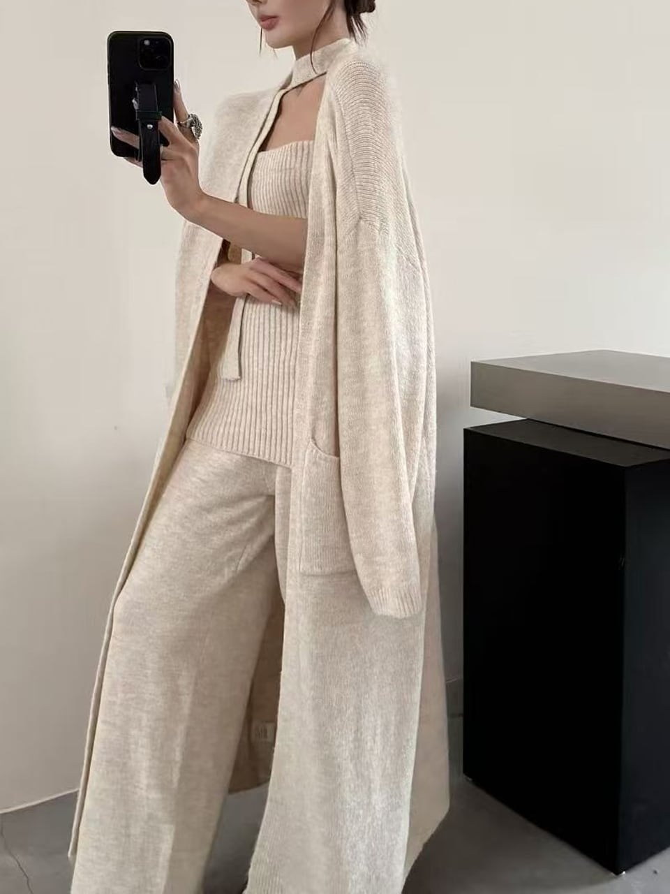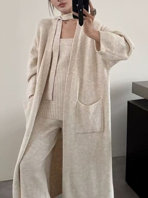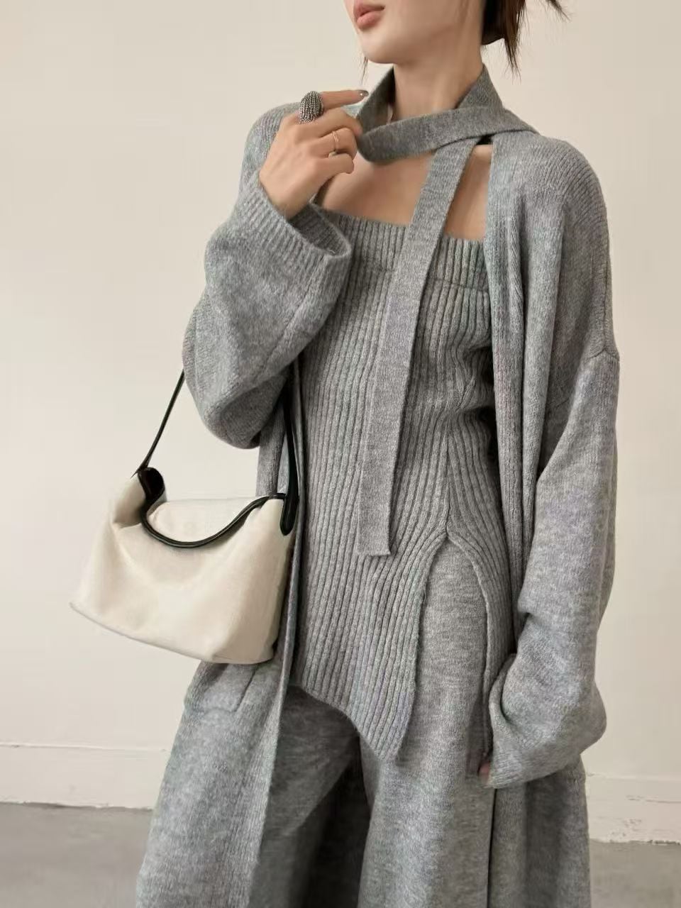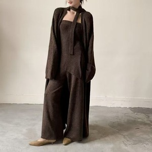 【set】スカーフ付きニットチューブトップ×カーディガン×ワイドパンツ3点セット Q7250