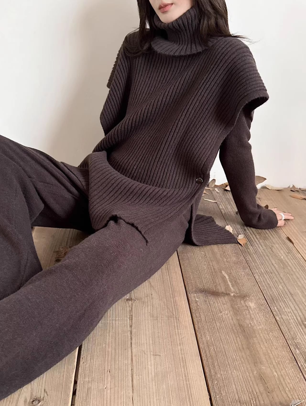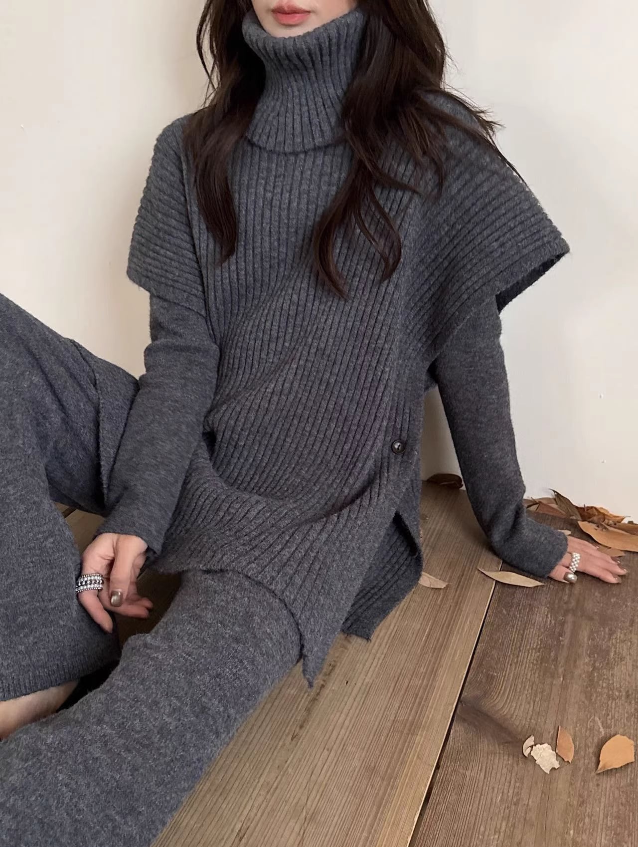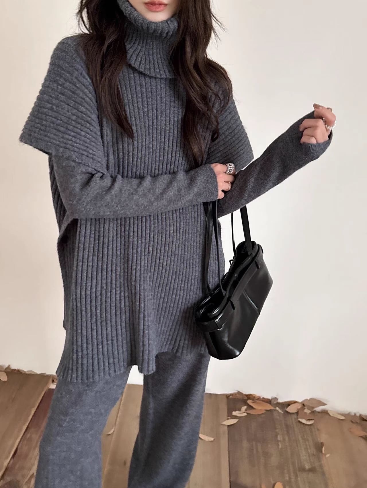 【set】ハイネックケープ×ニットトップス×ワイドパンツ3点セット Q7271