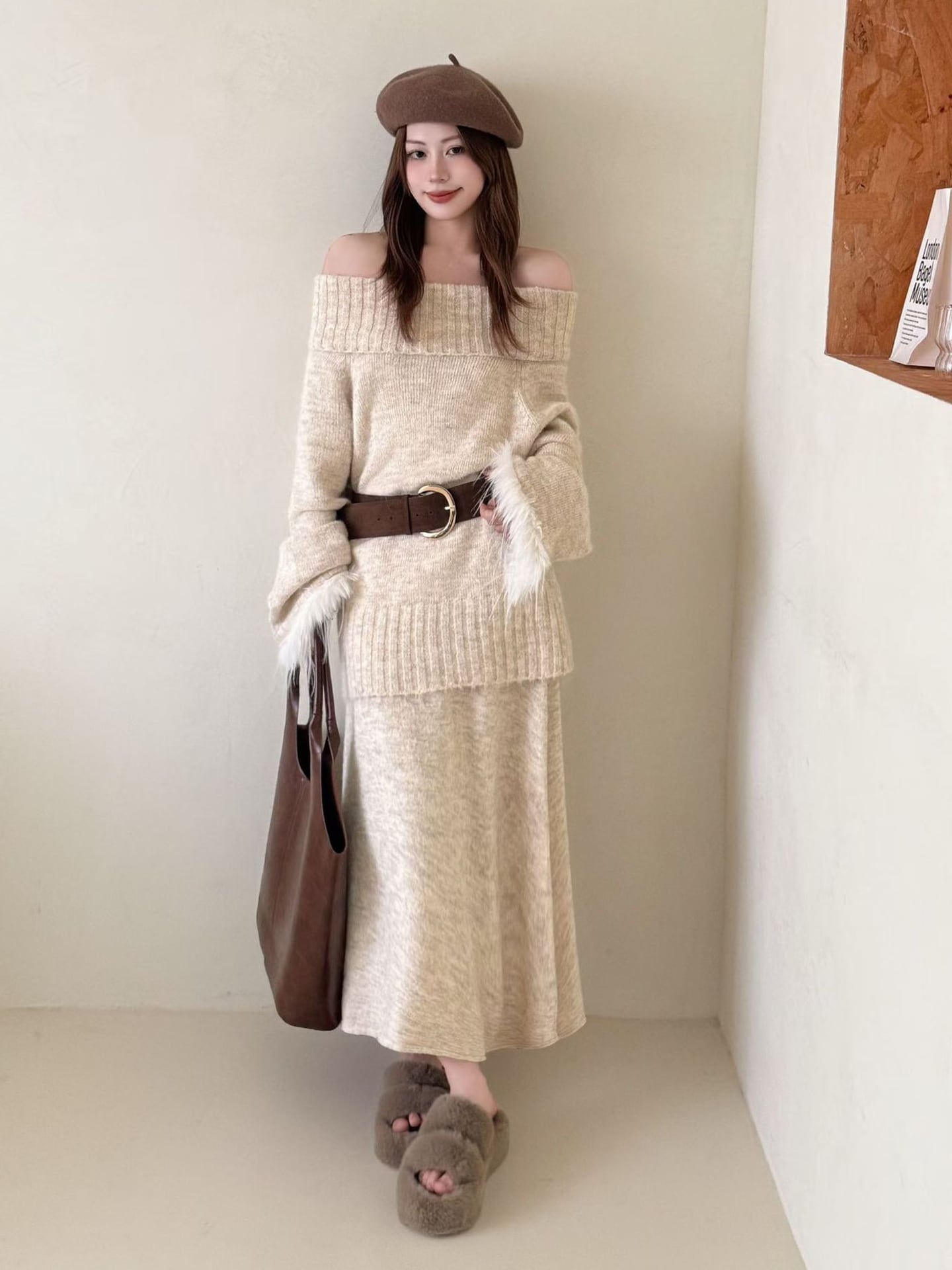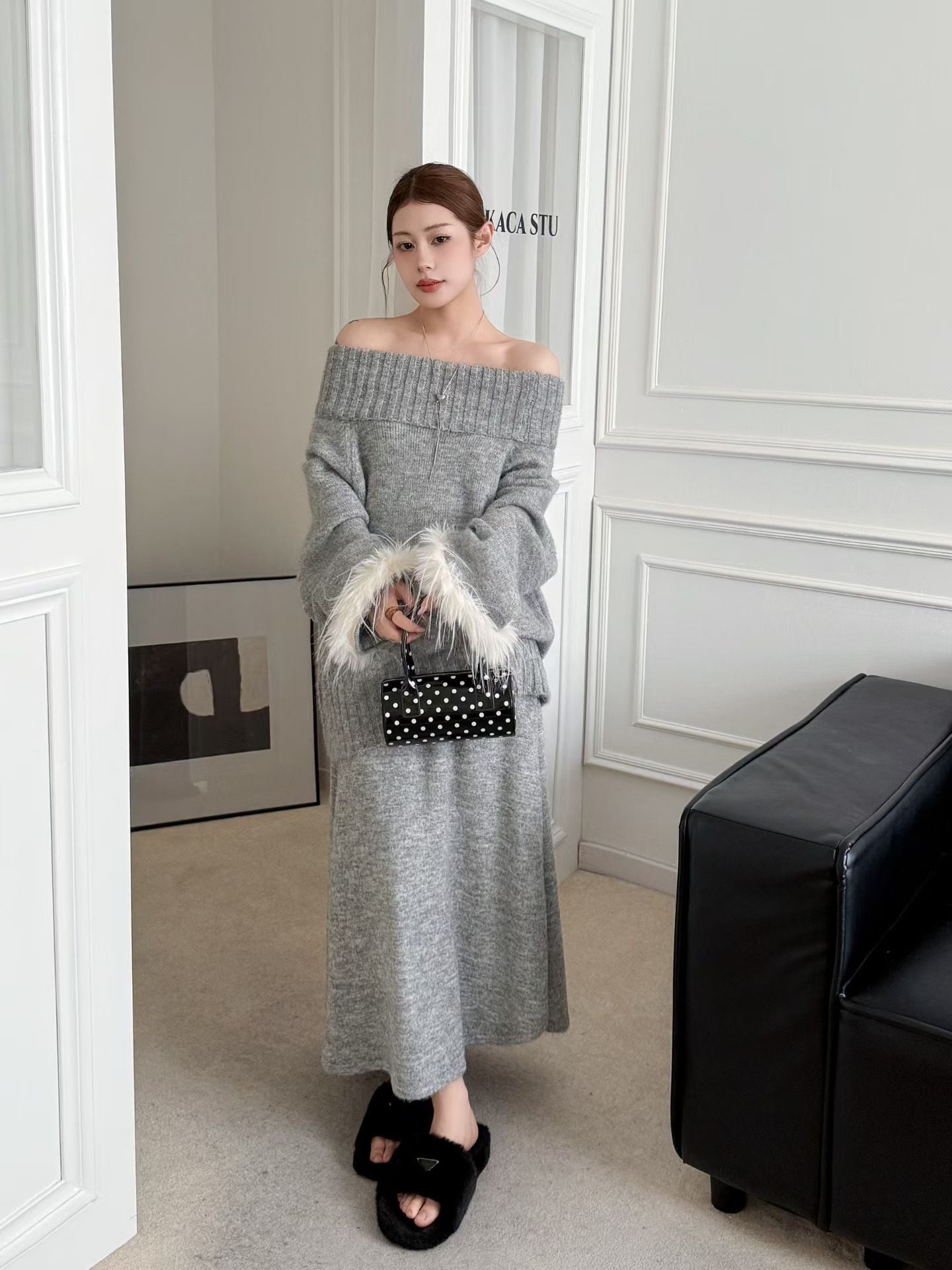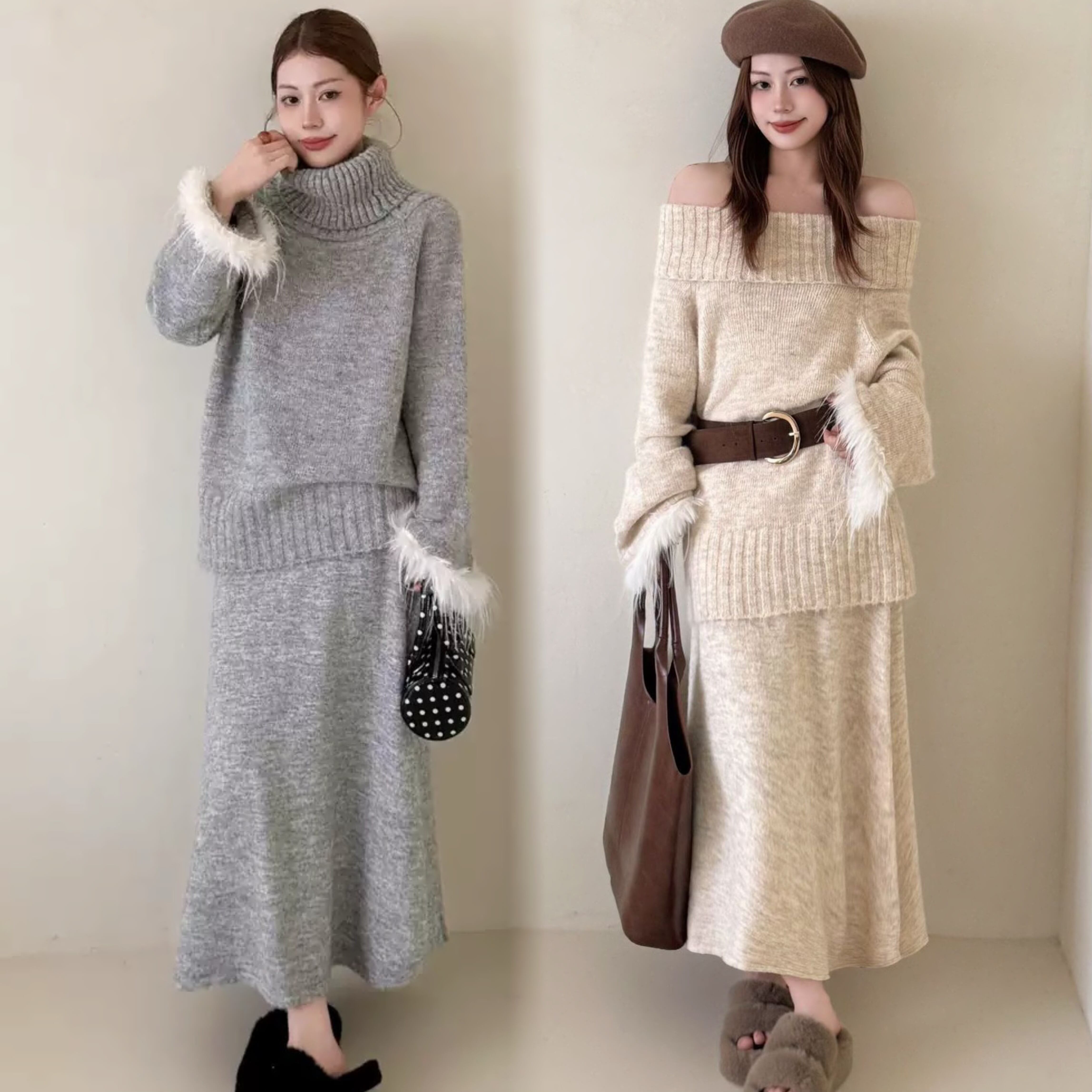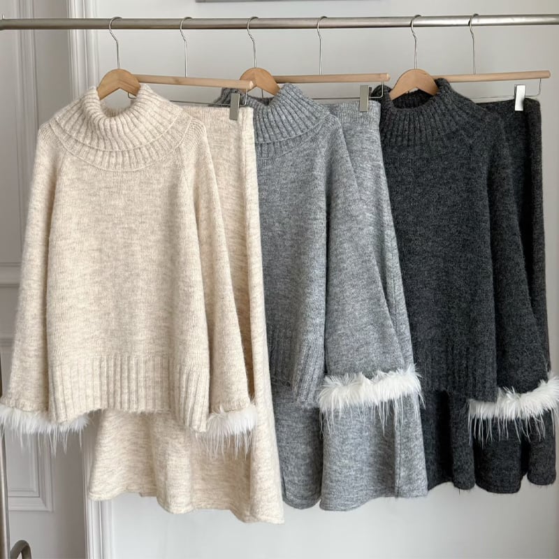 【set】2WAY袖ファーニットトップス×ロングスカートセット Q7279