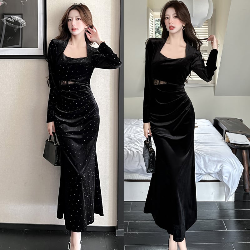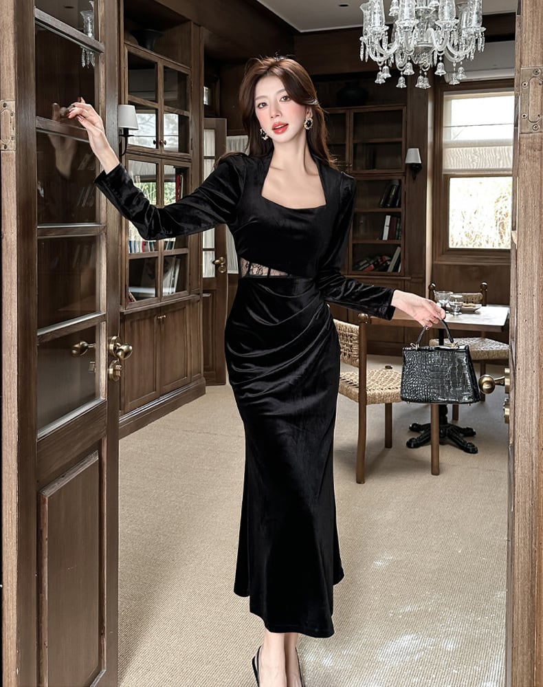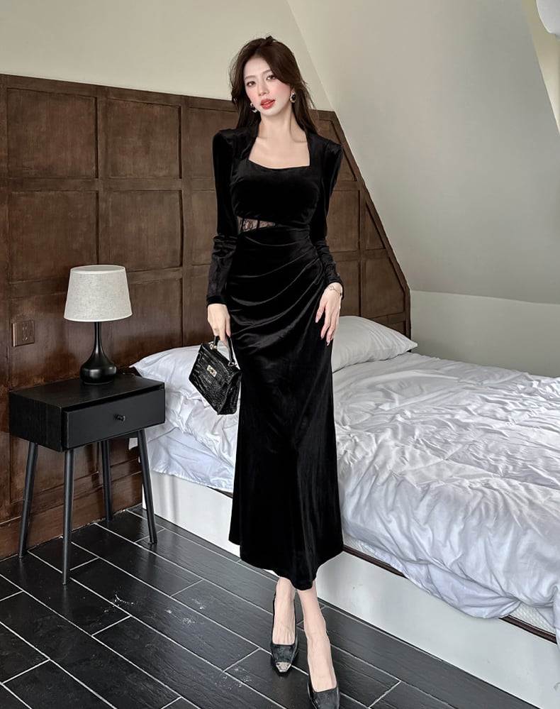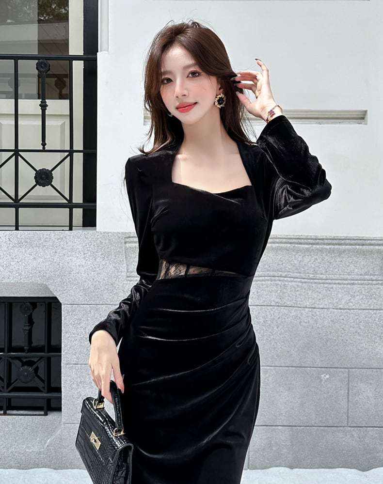 【dress】スクエアネックレースドッキングロングワンピース Q7286