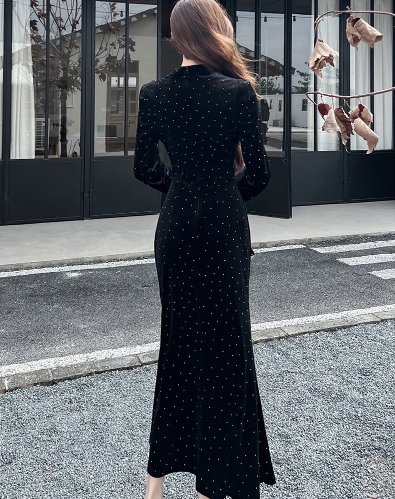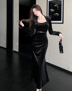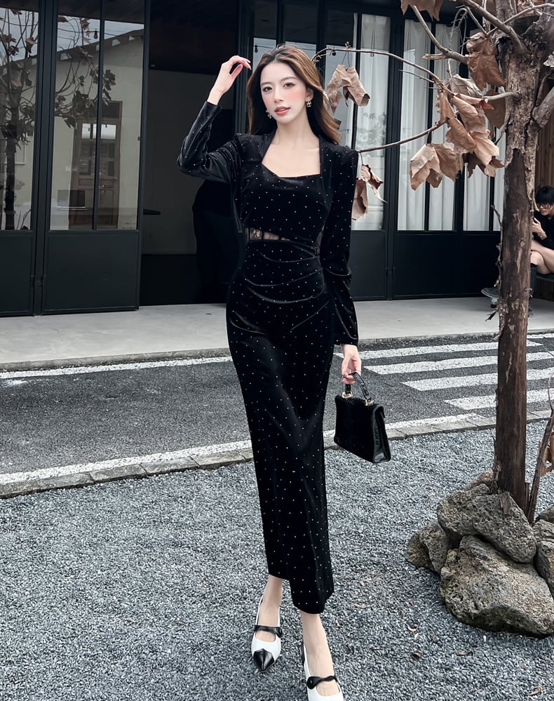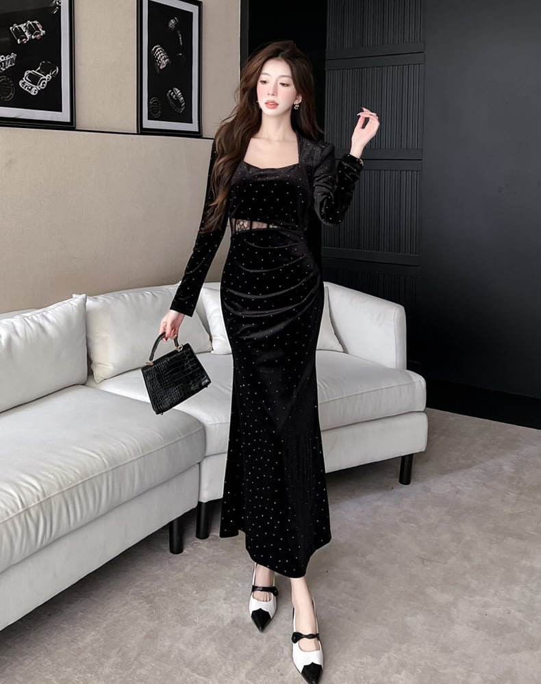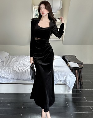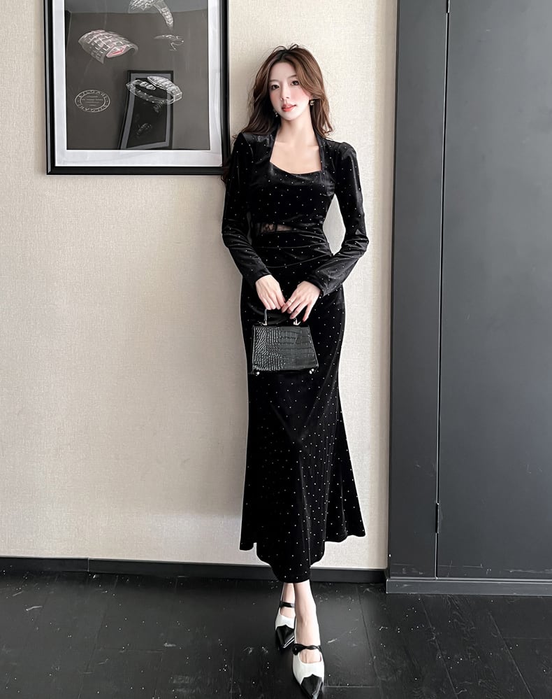 【dress】スクエアネックレースドッキングロングワンピース Q7286