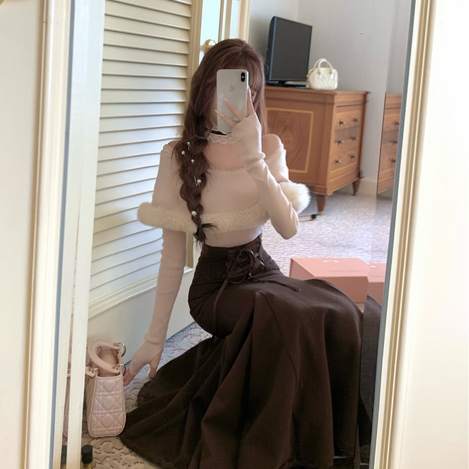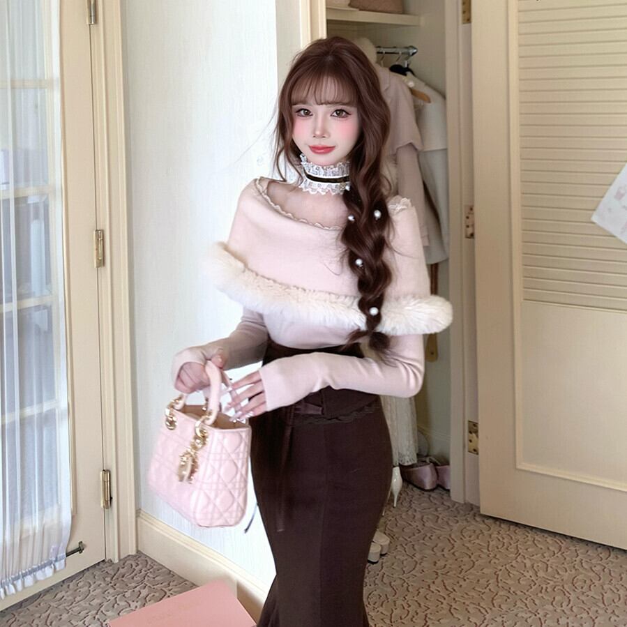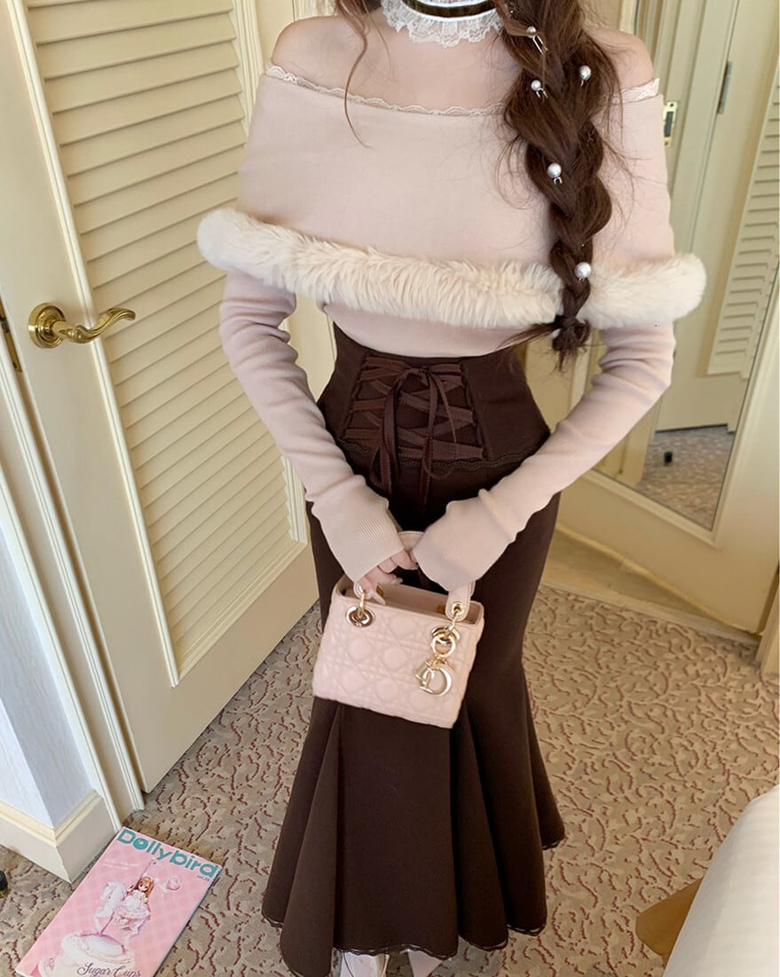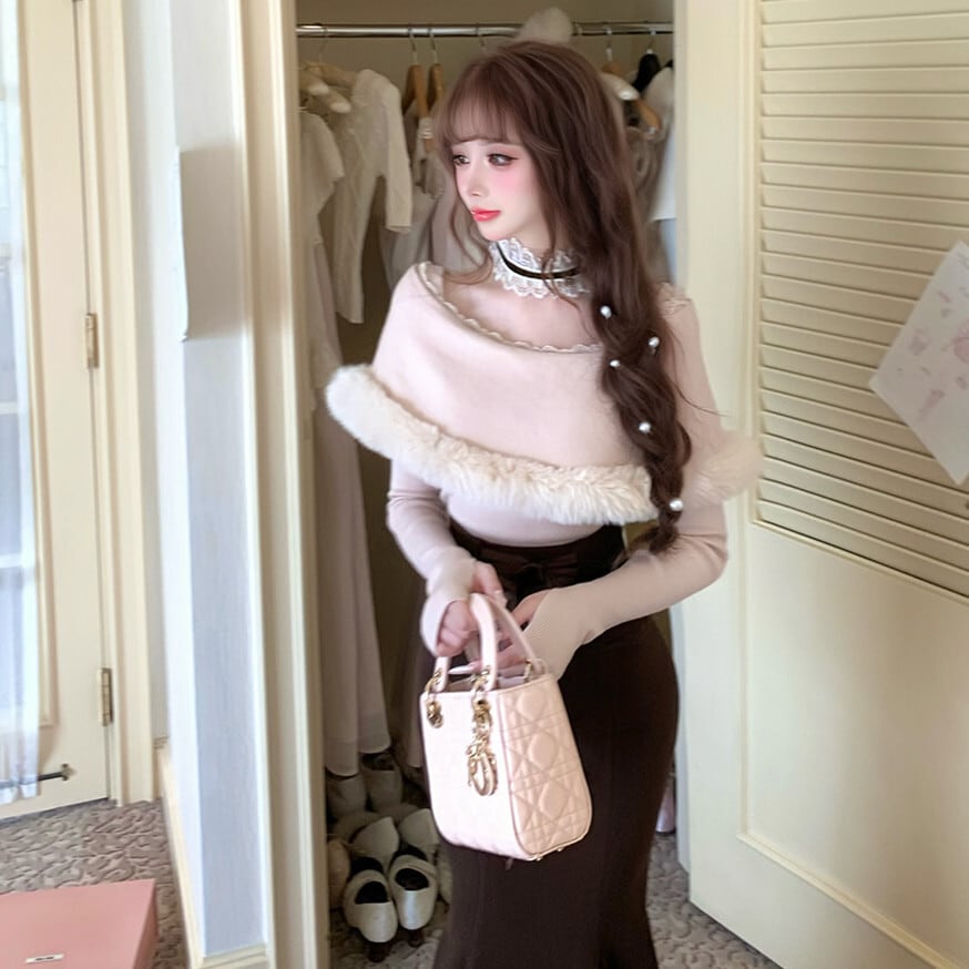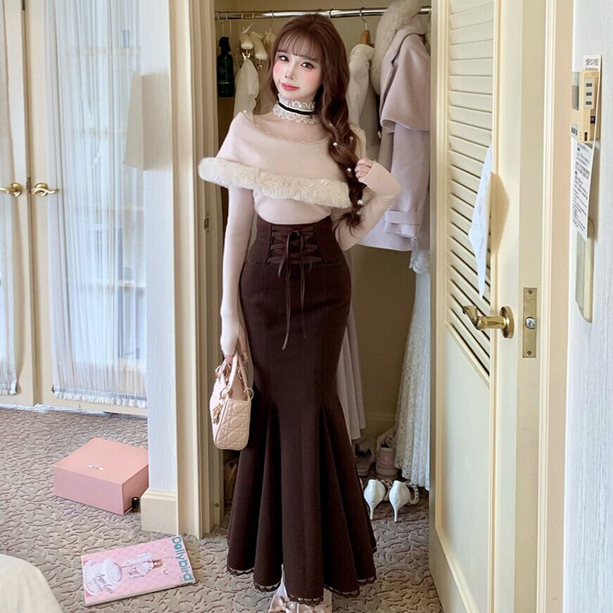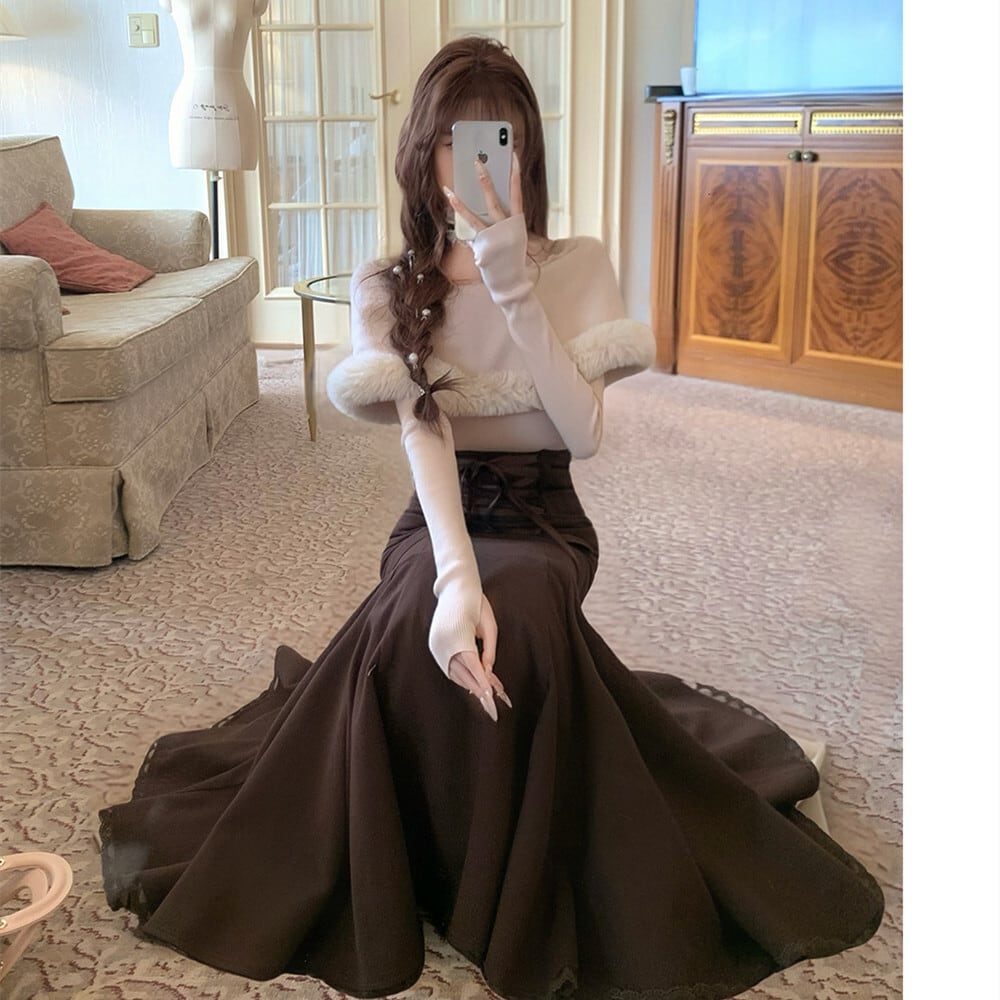 【set】ファー付きケープライクニットトップス×マーメイドスカートセット N3493