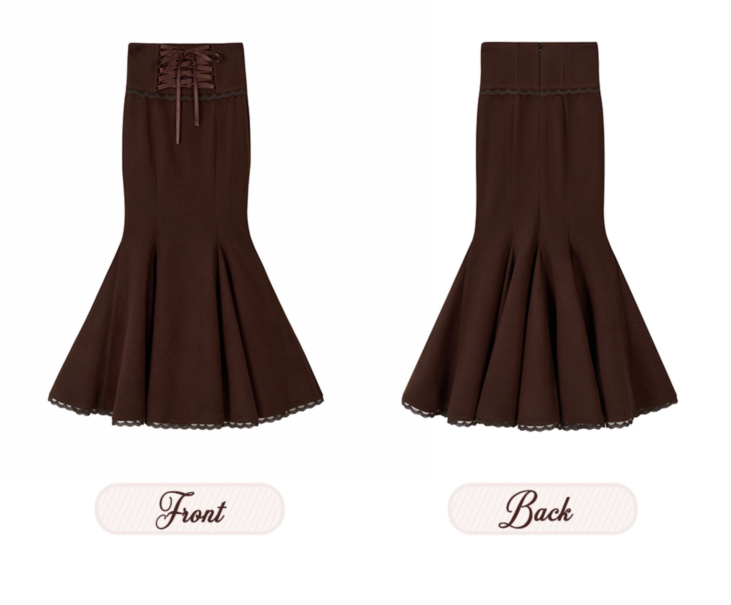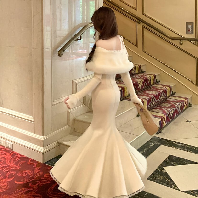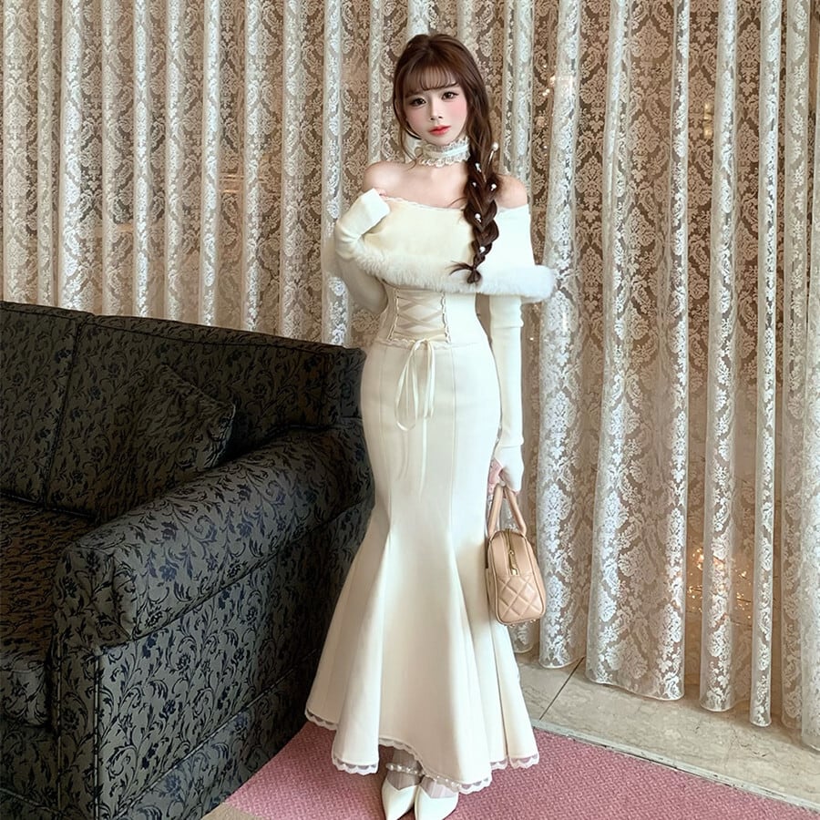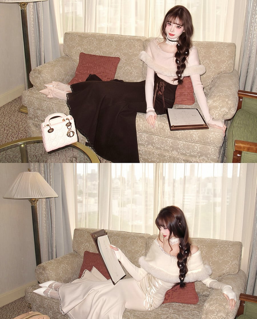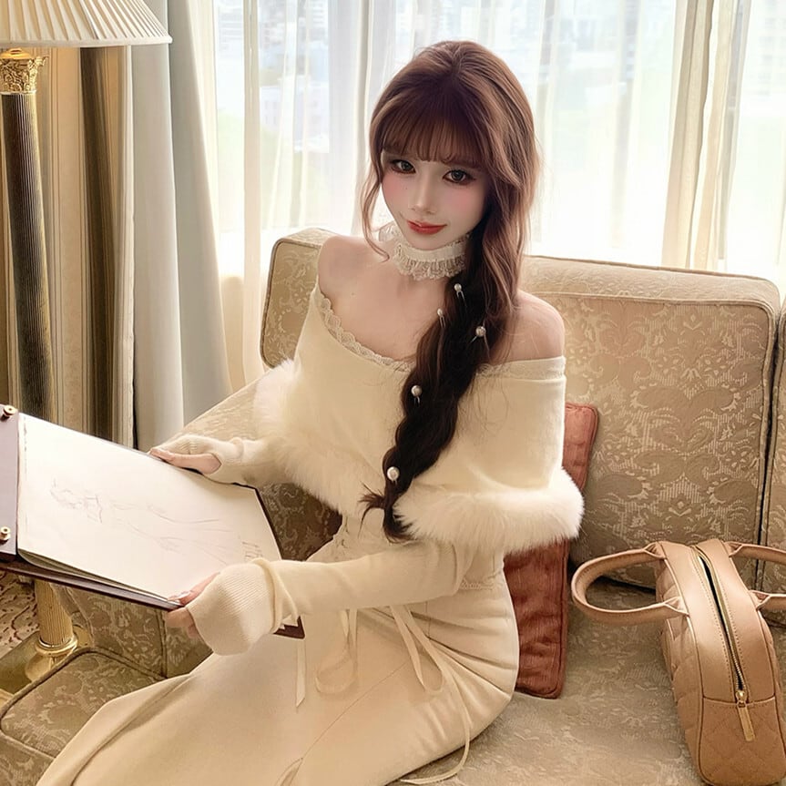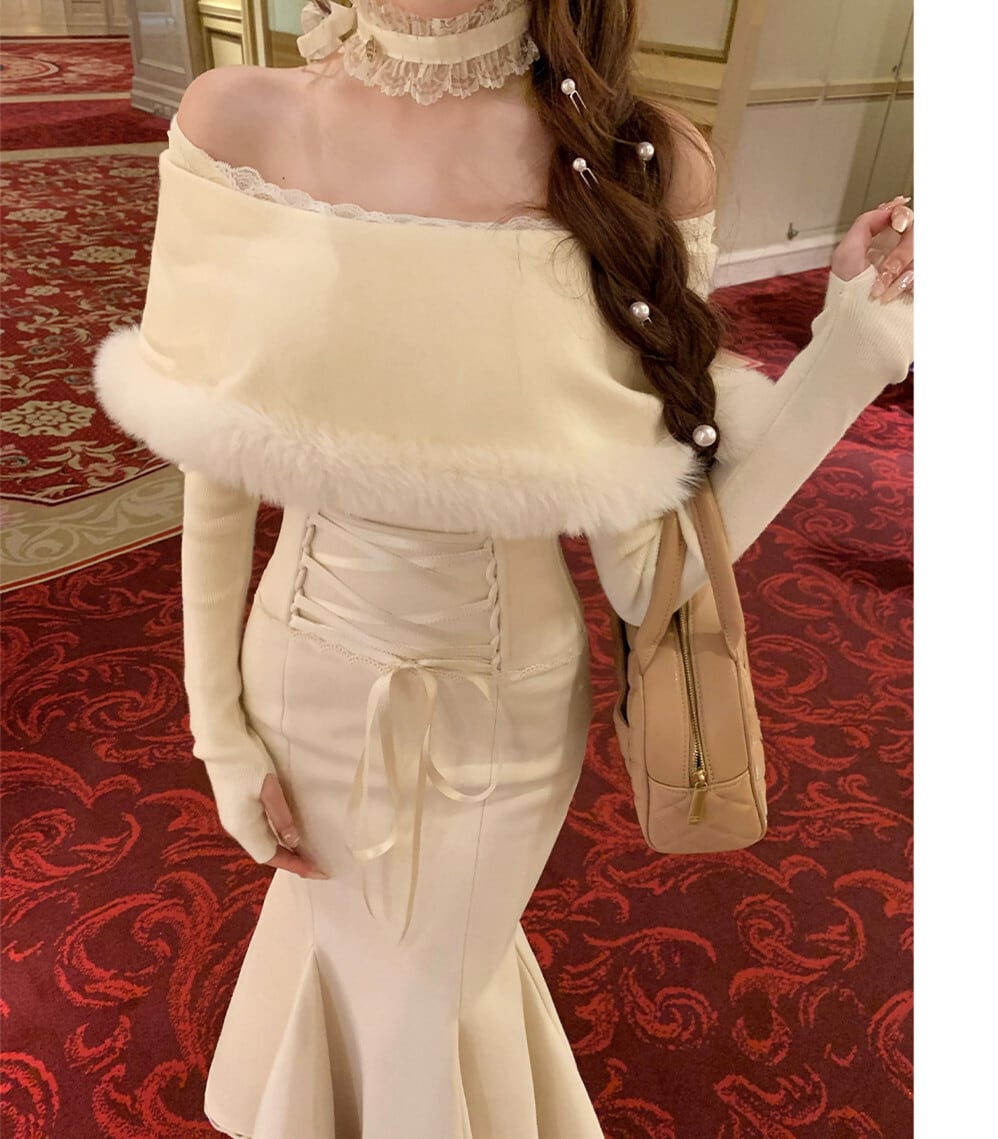 【set】ファー付きケープライクニットトップス×マーメイドスカートセット N3493