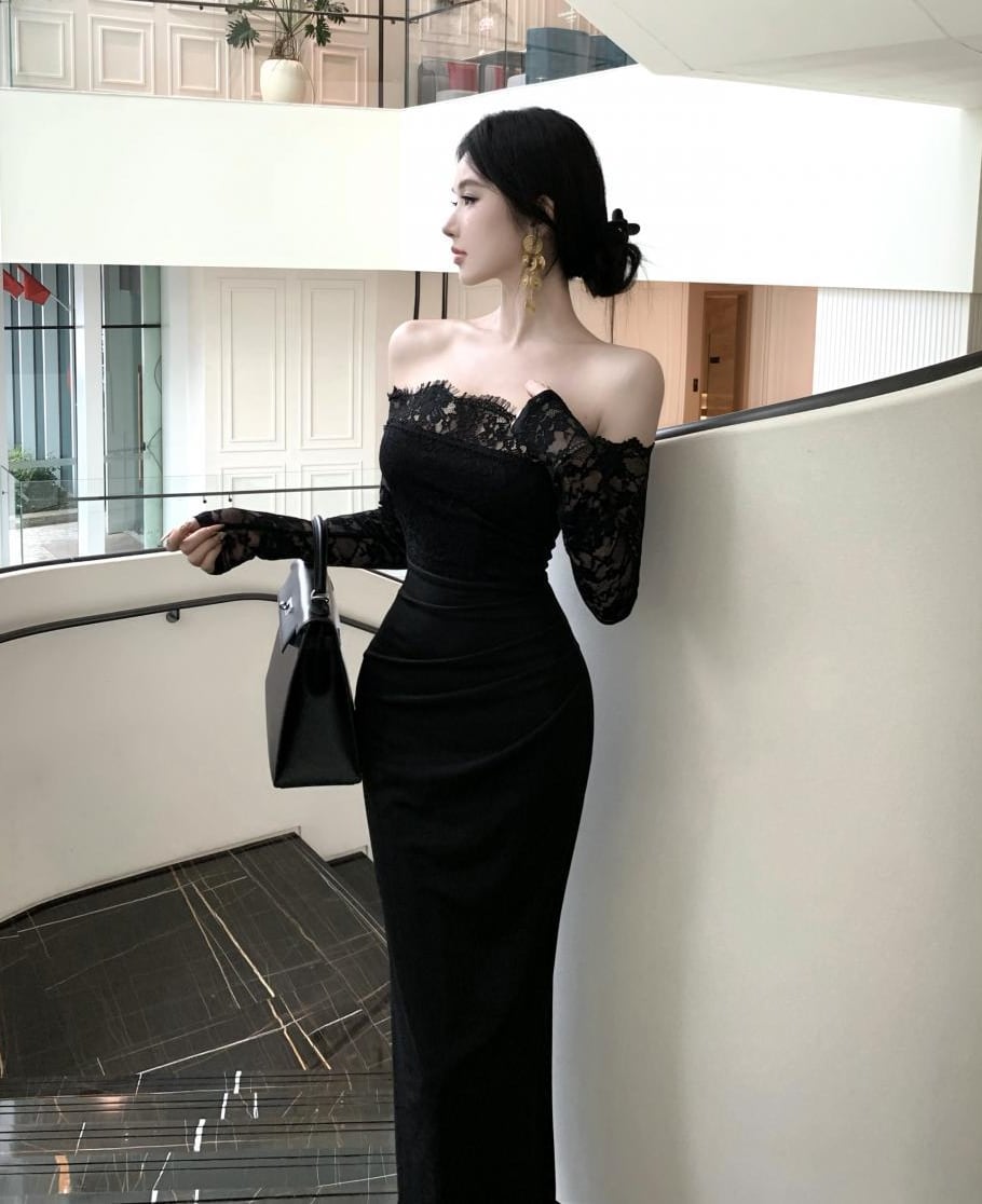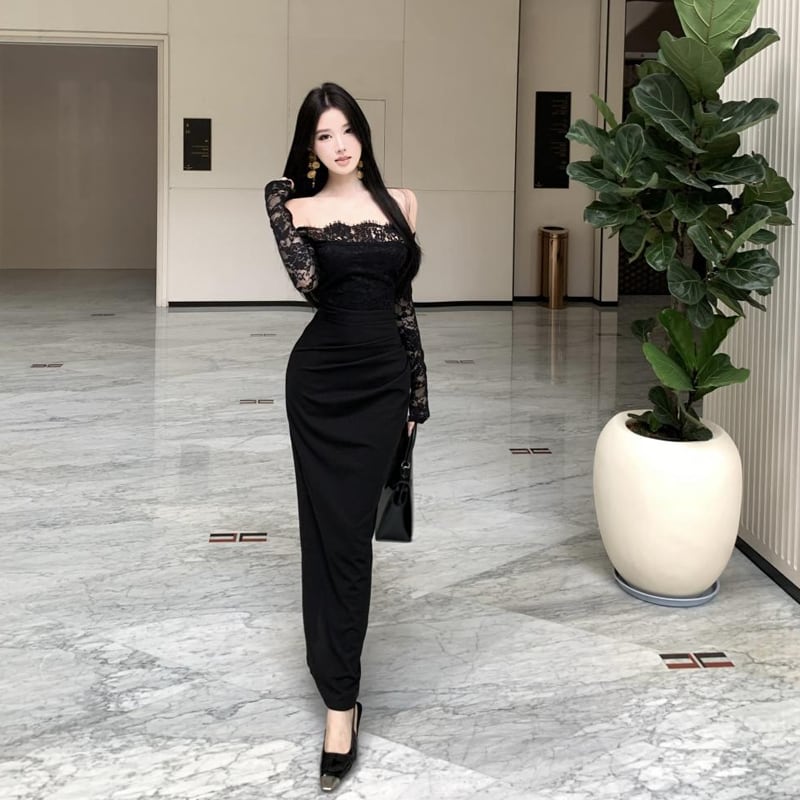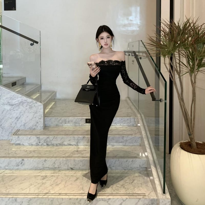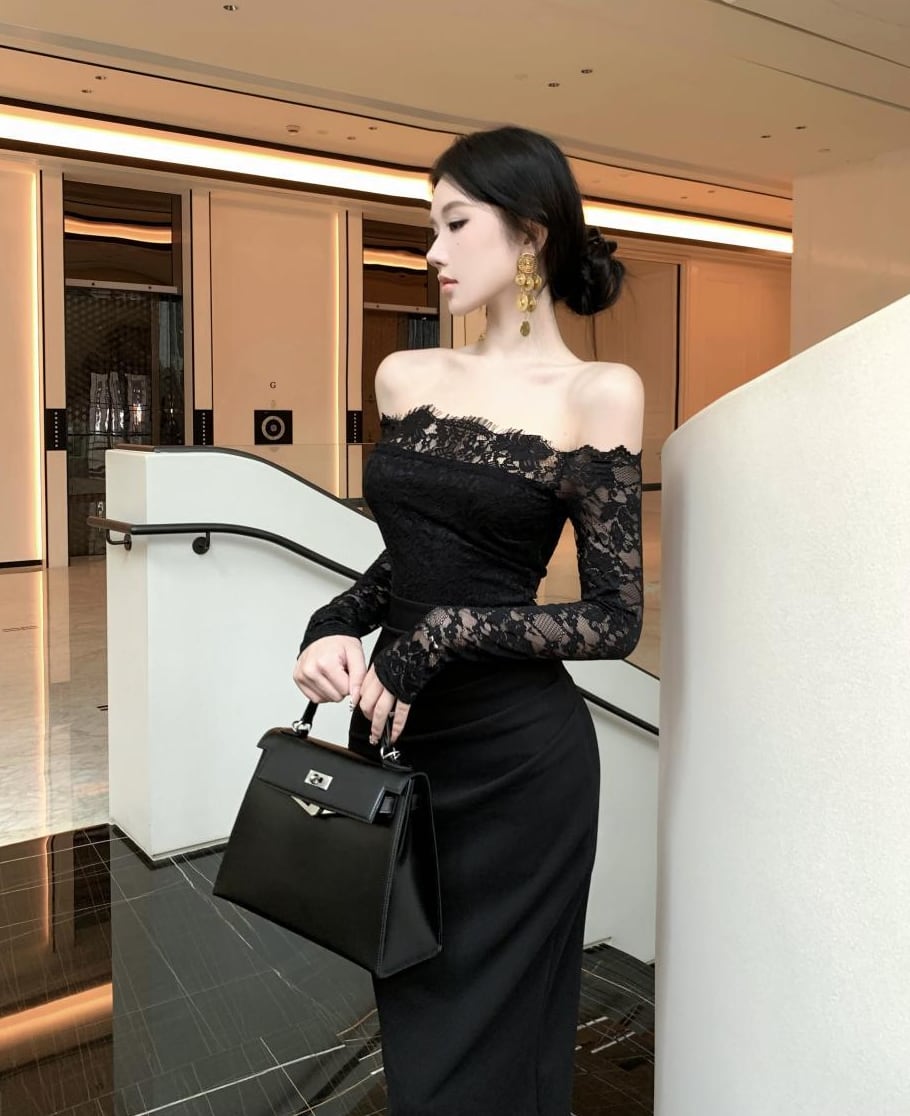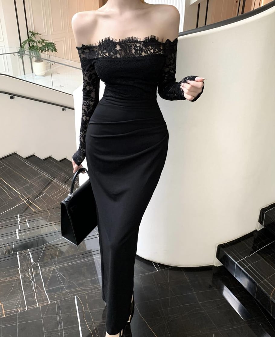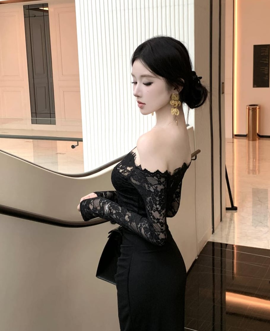 【dress】オフショルダーレースドッキングワンピース Q7421