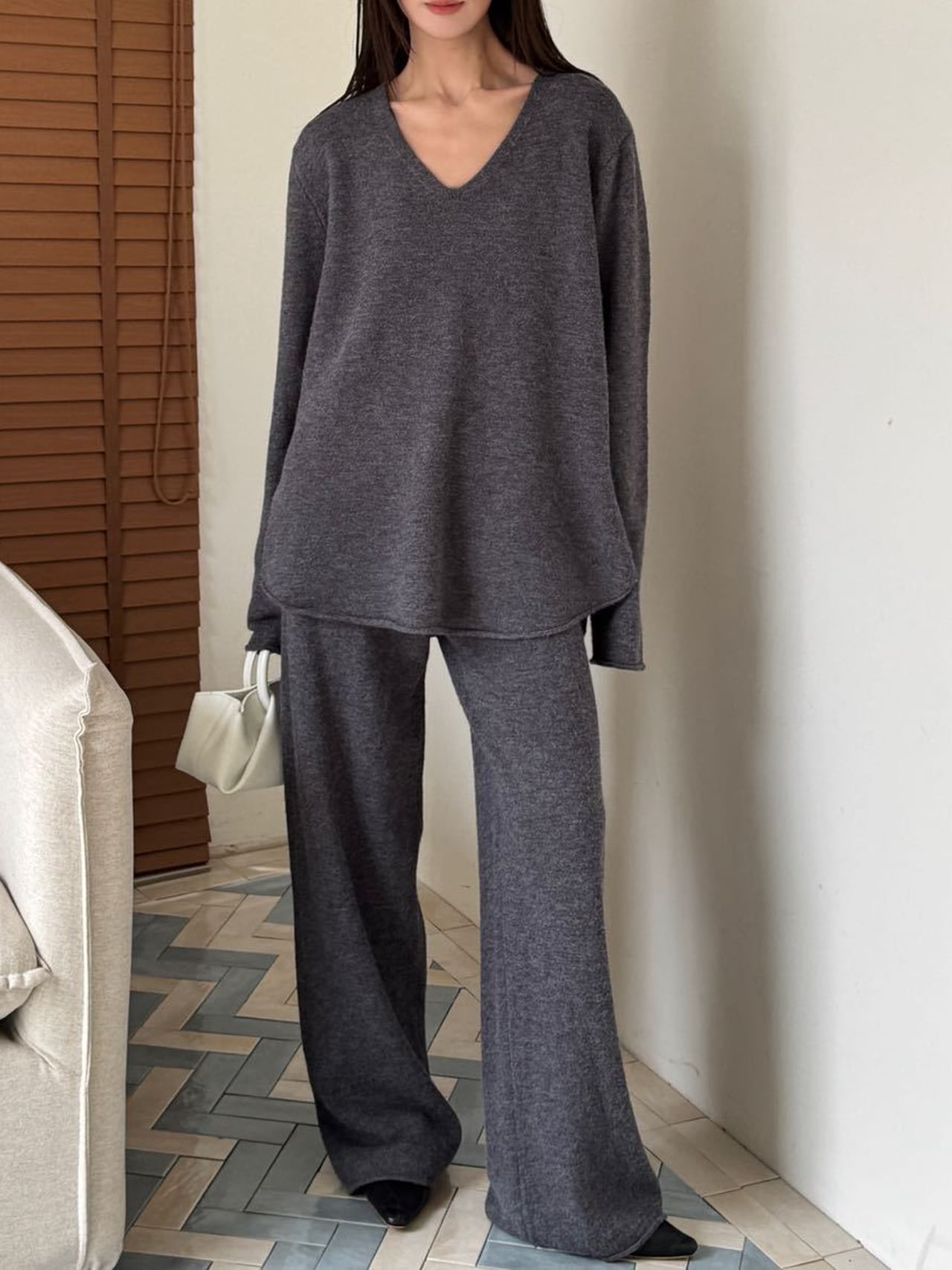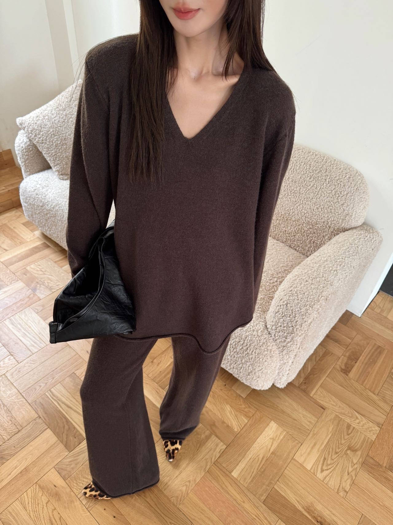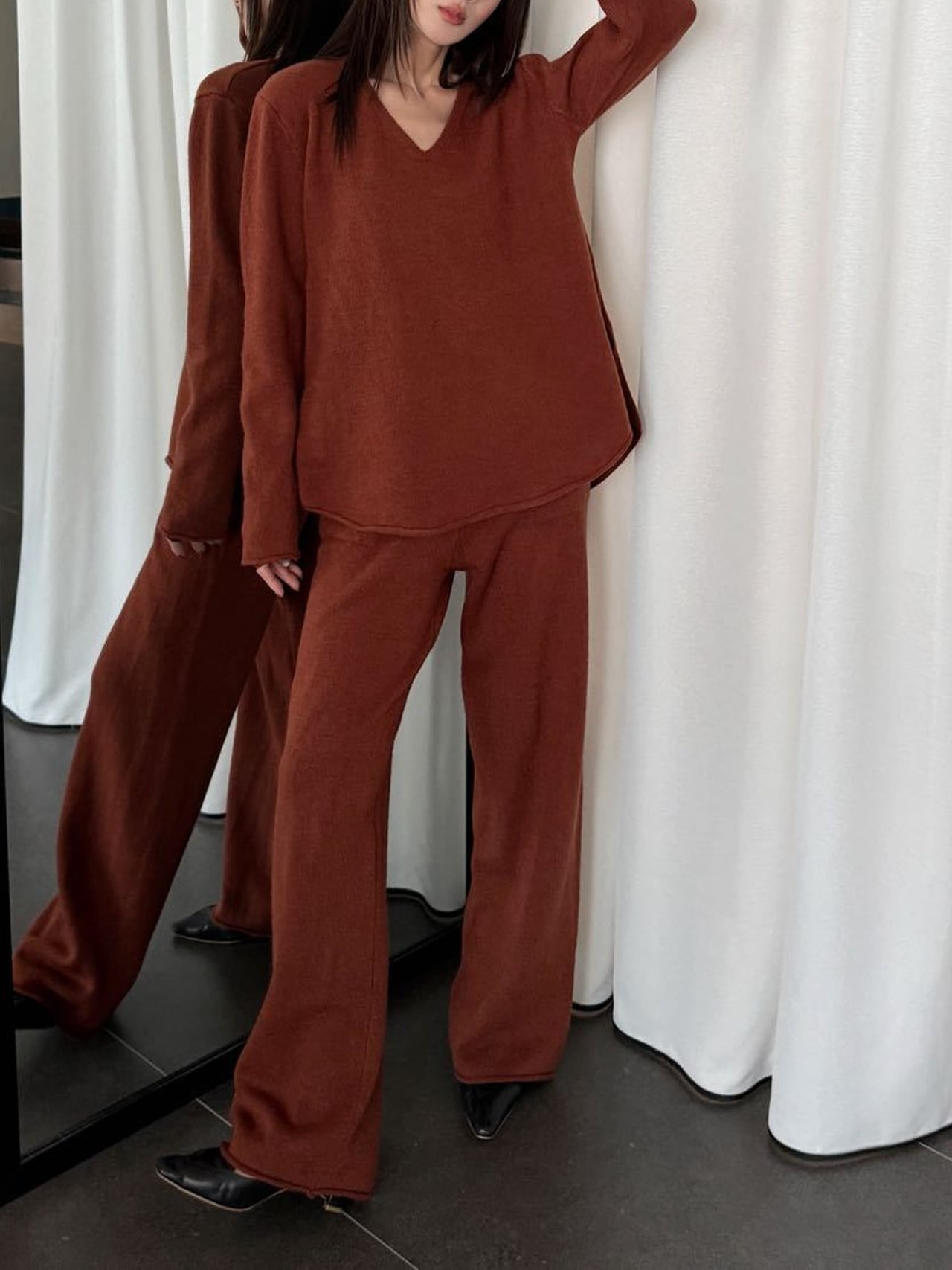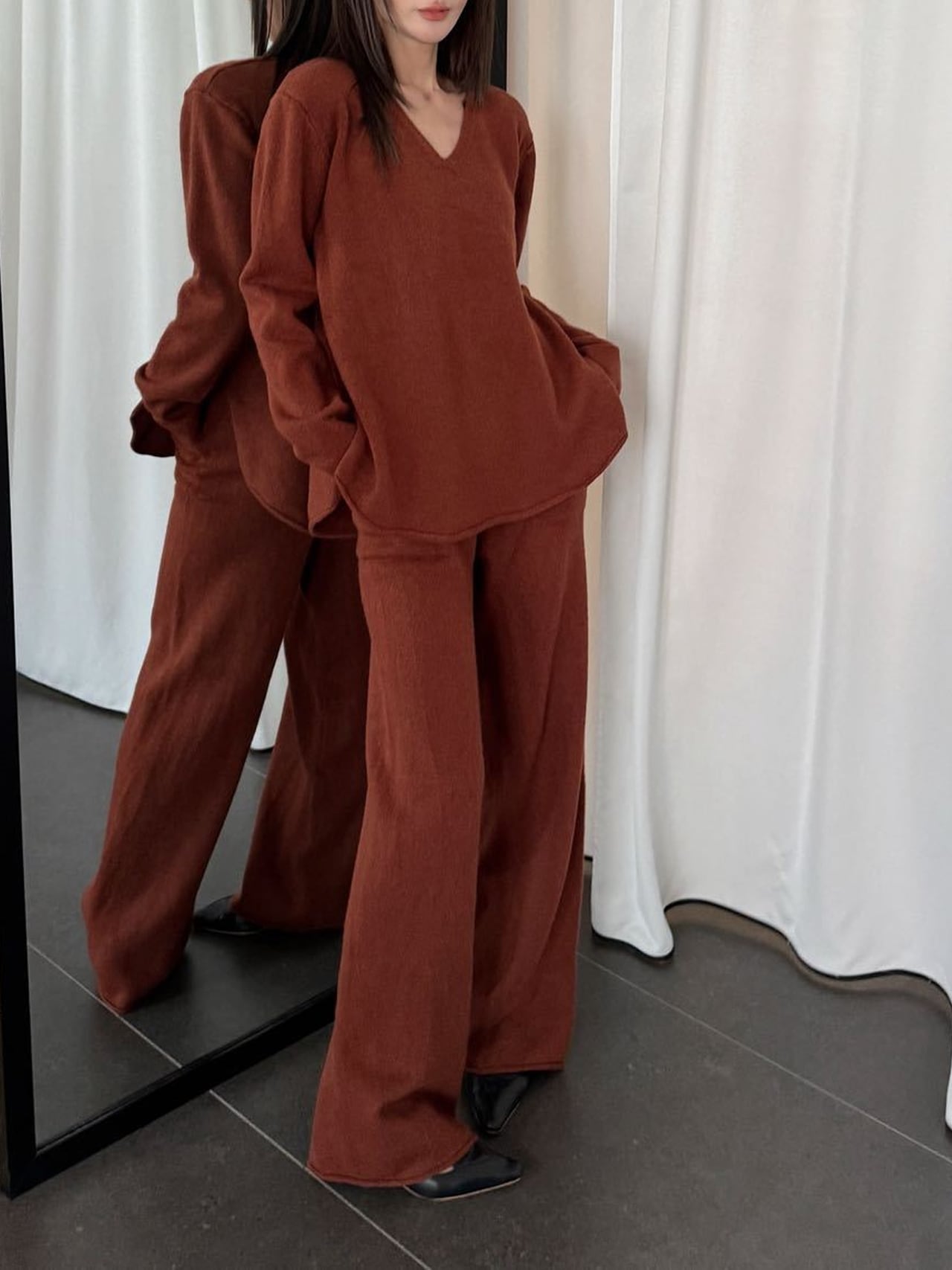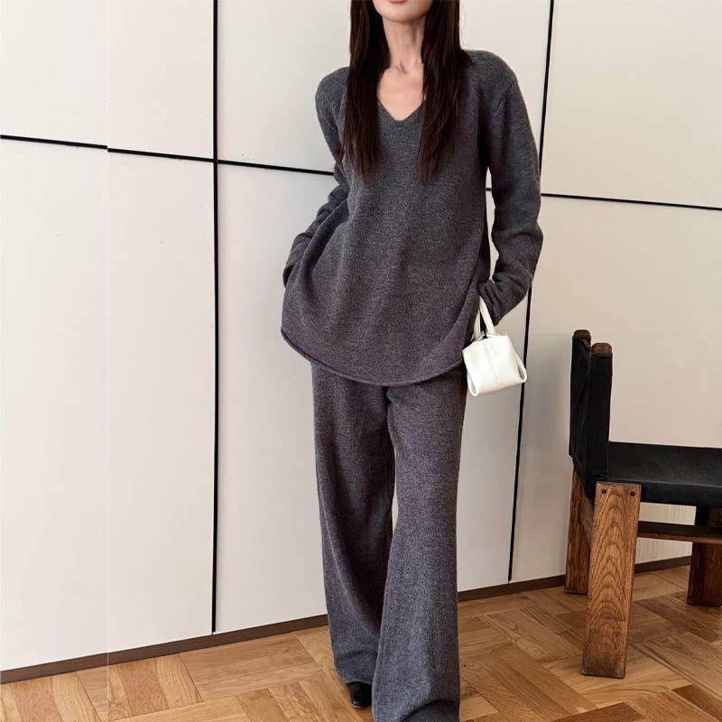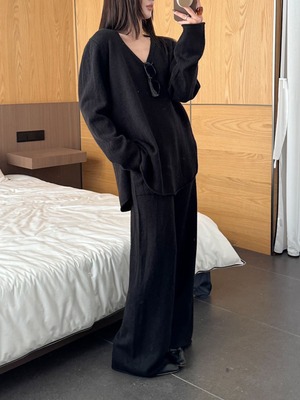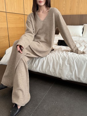 【set】Vネックニットトップス×ワイドパンツセット Q7430