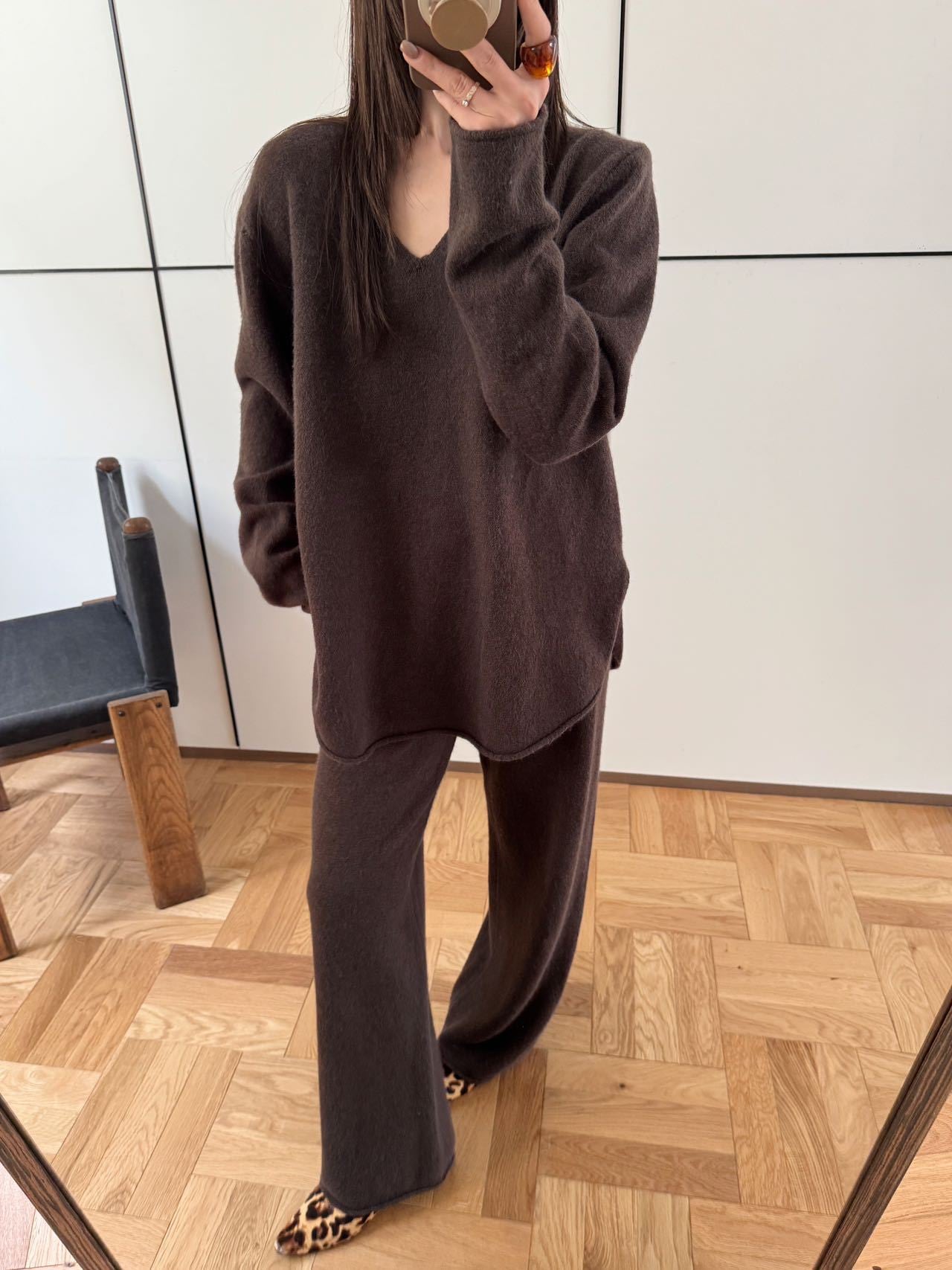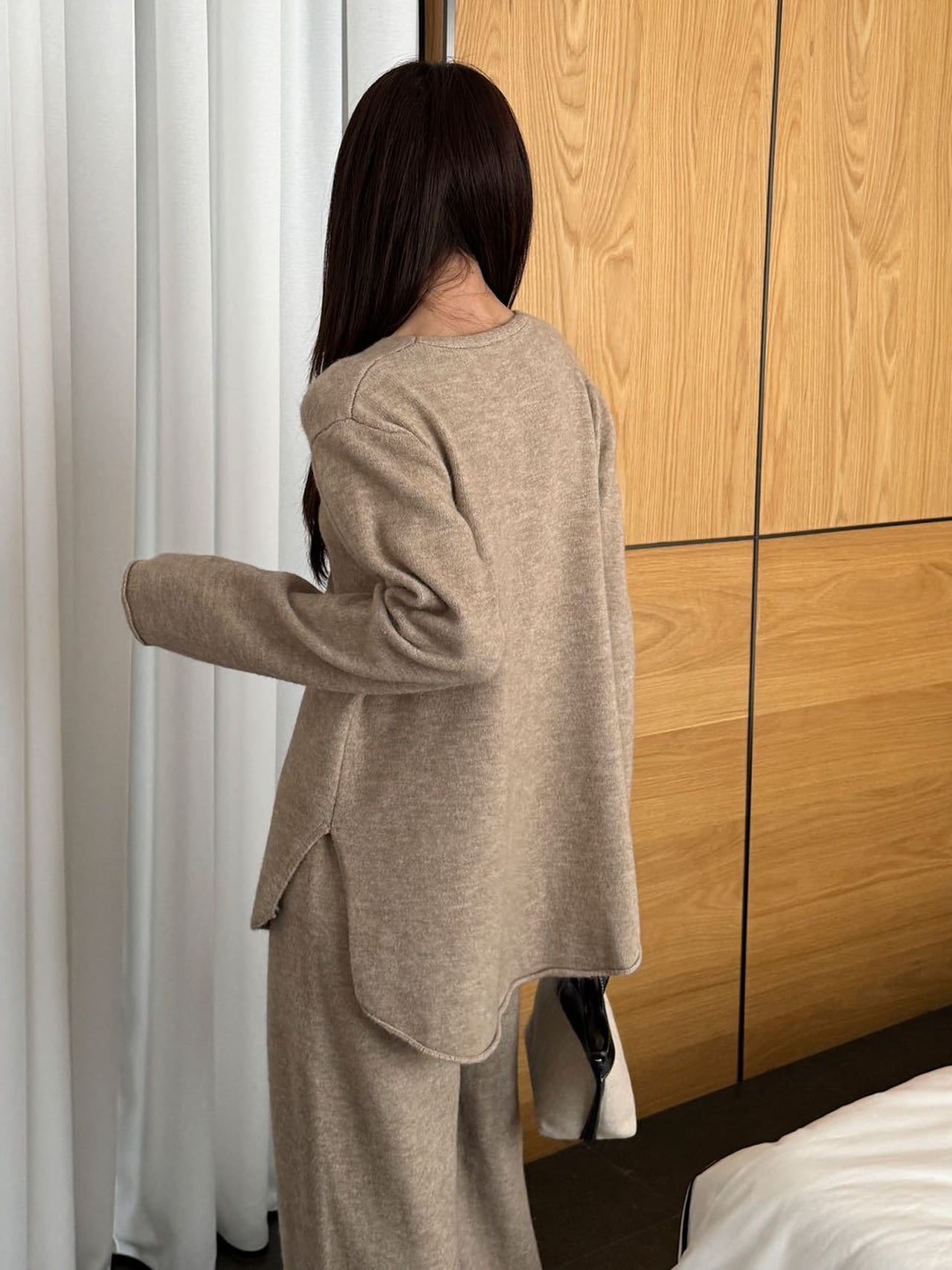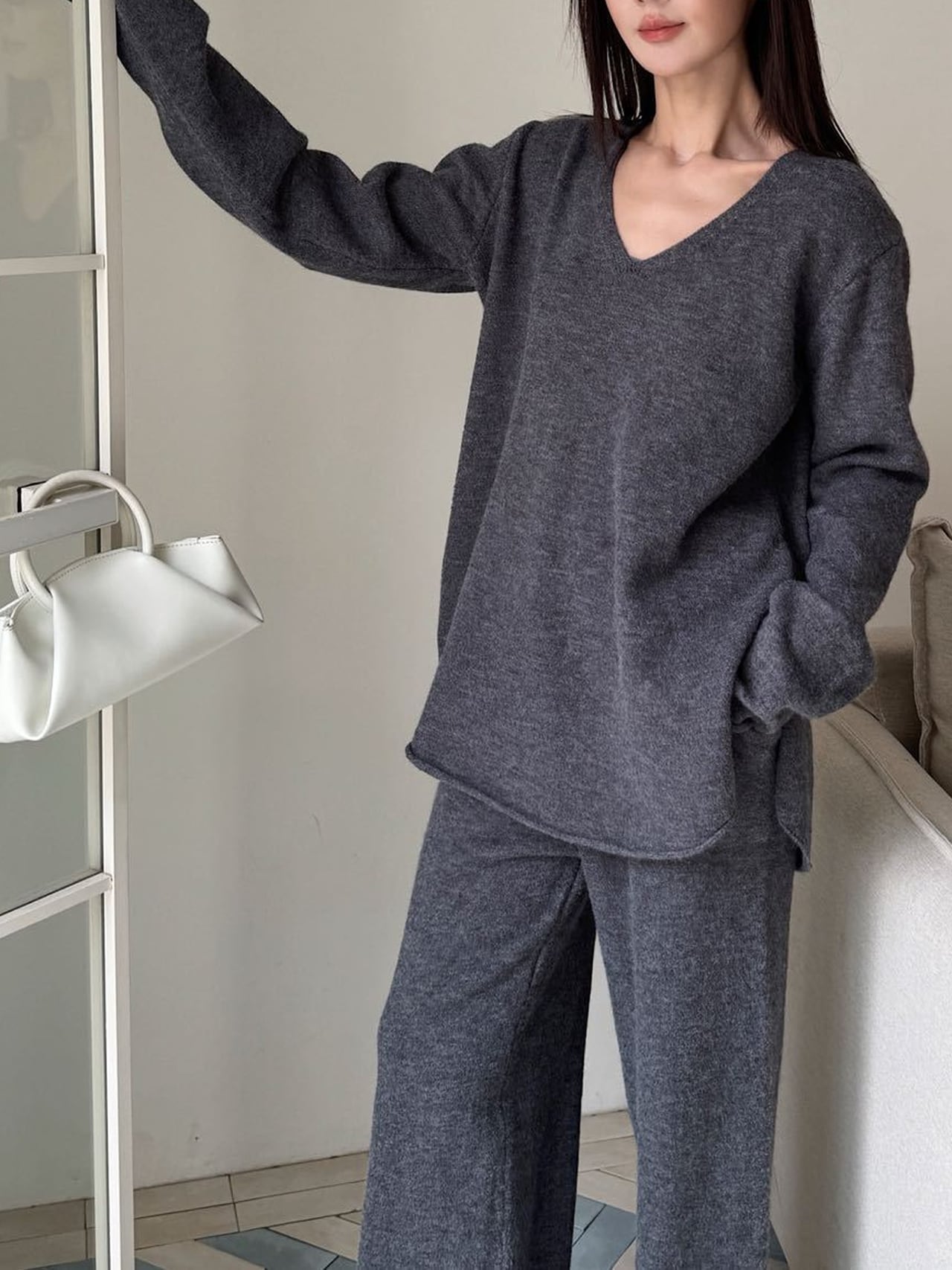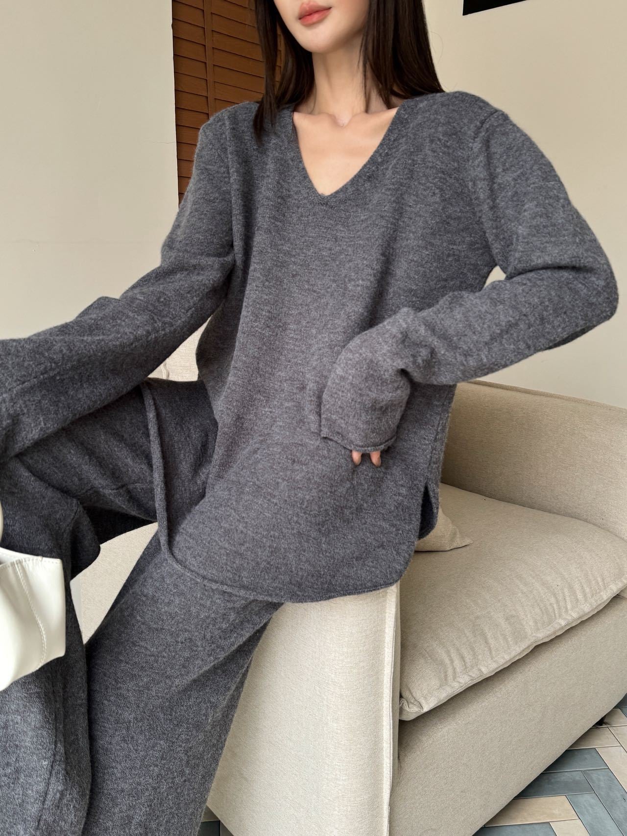 【set】Vネックニットトップス×ワイドパンツセット Q7430