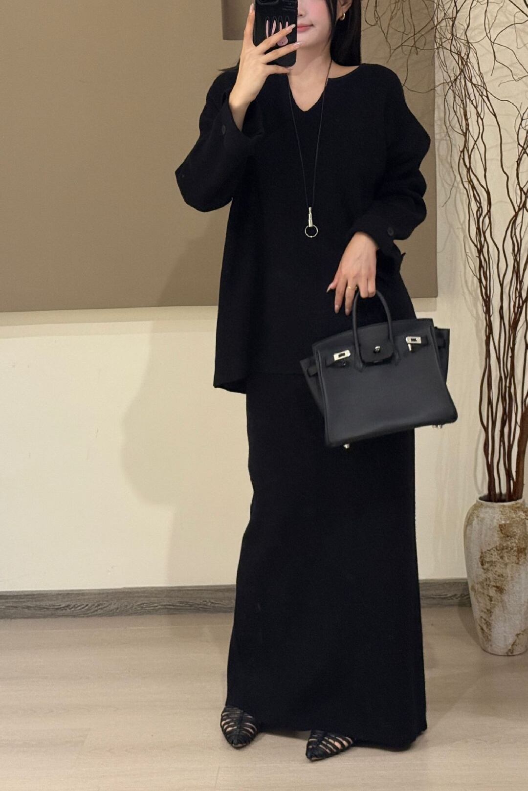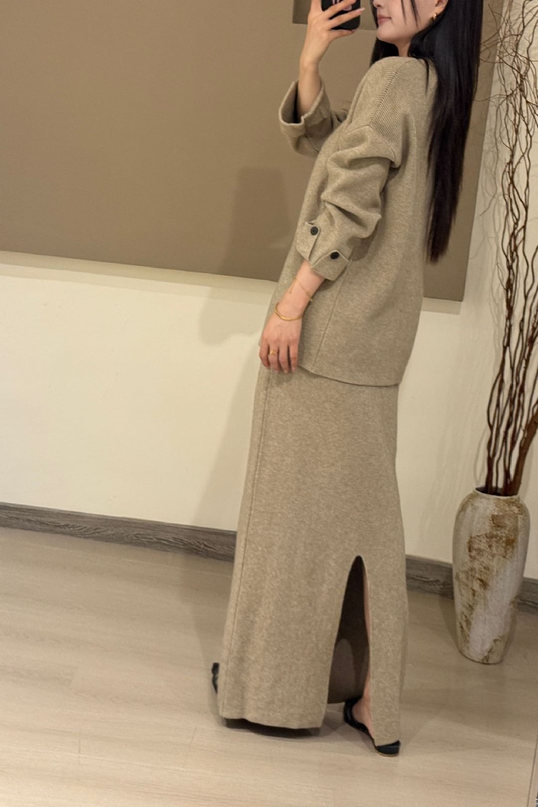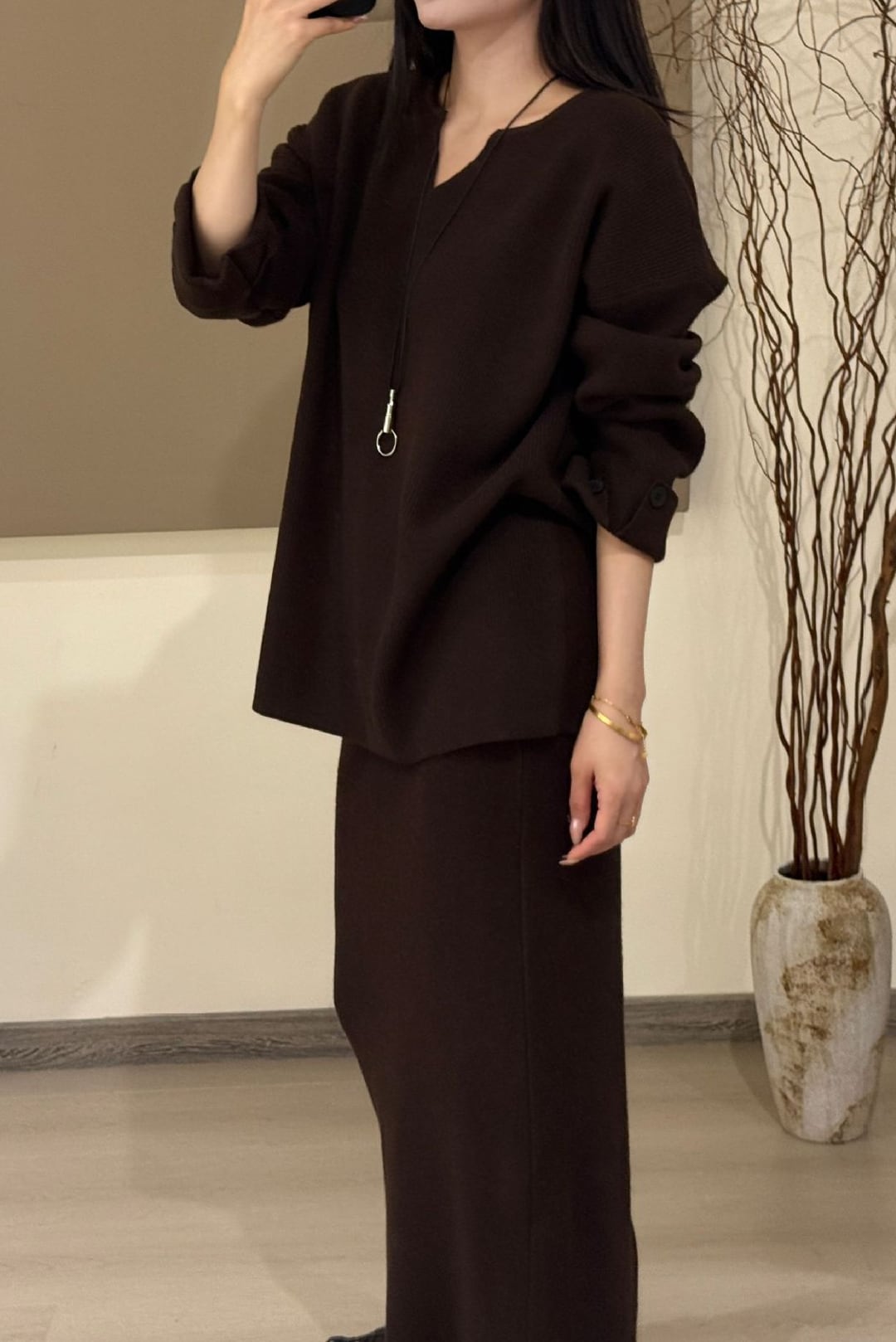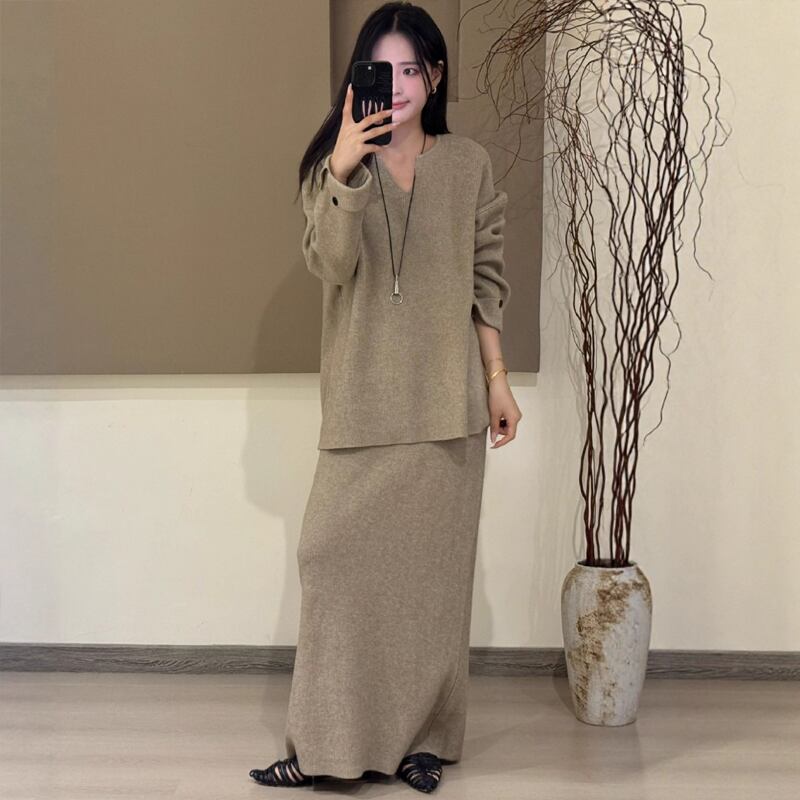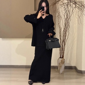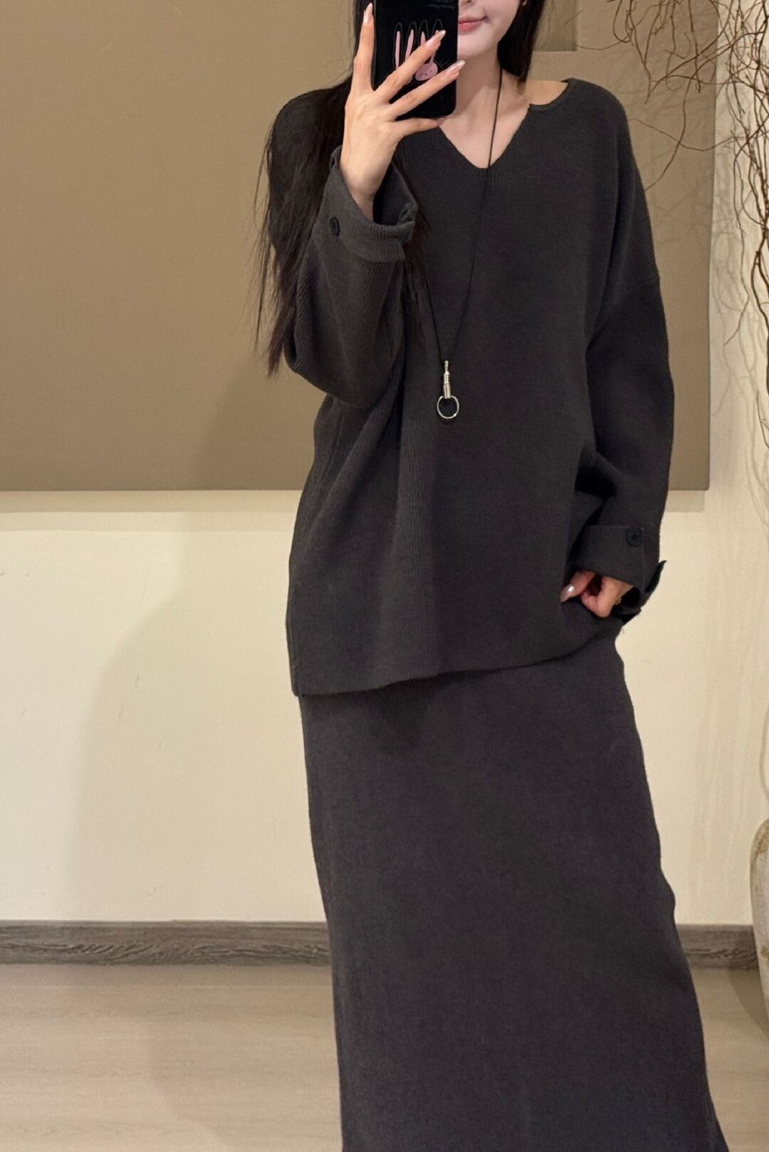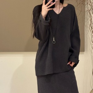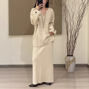 【set】Vネックニットトップス×ロングスカートセット Q7439