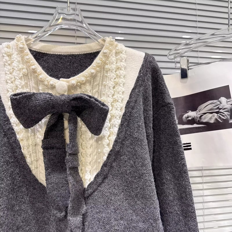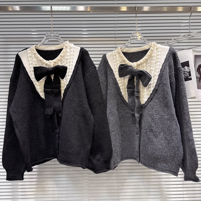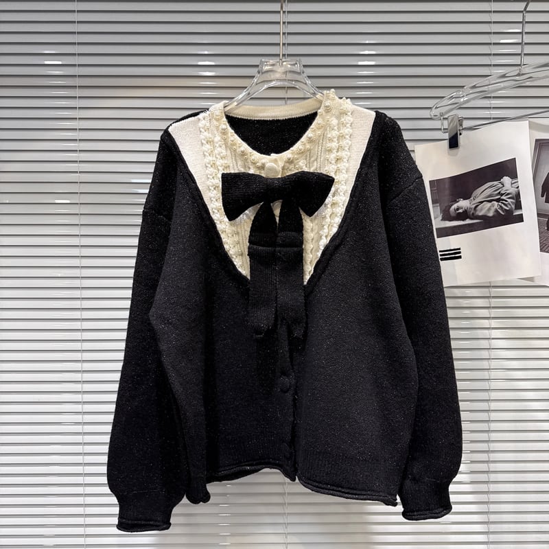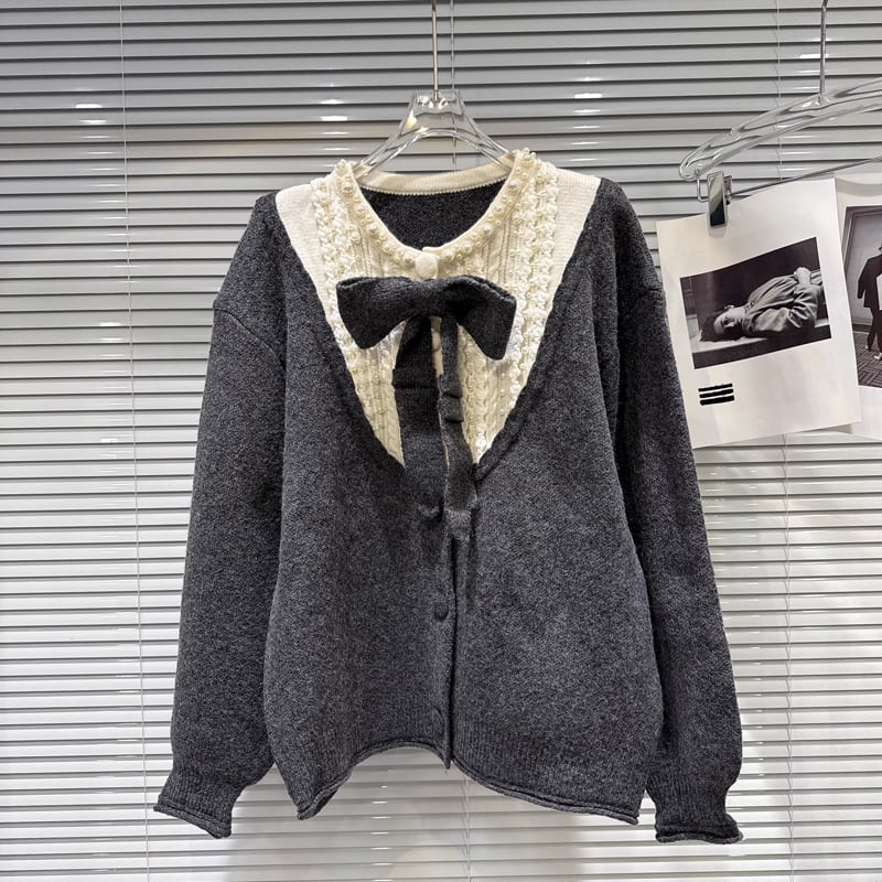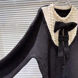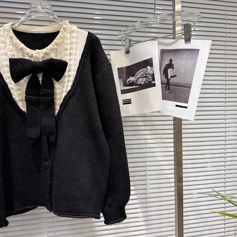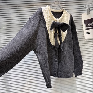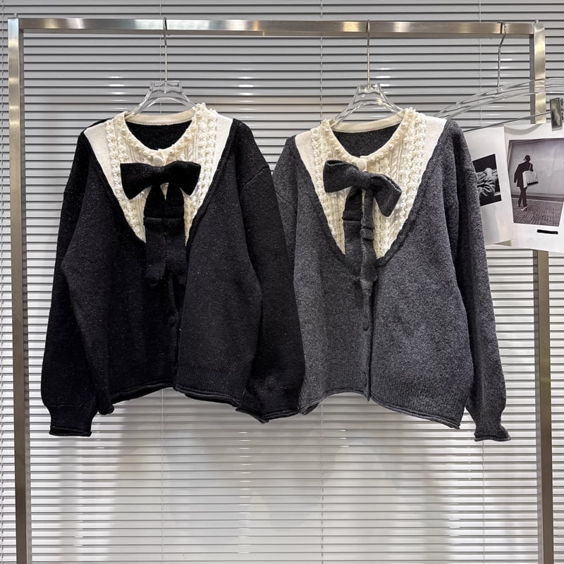 【outer】リボン付きフェイクレイヤードニットカーディガン Q7444