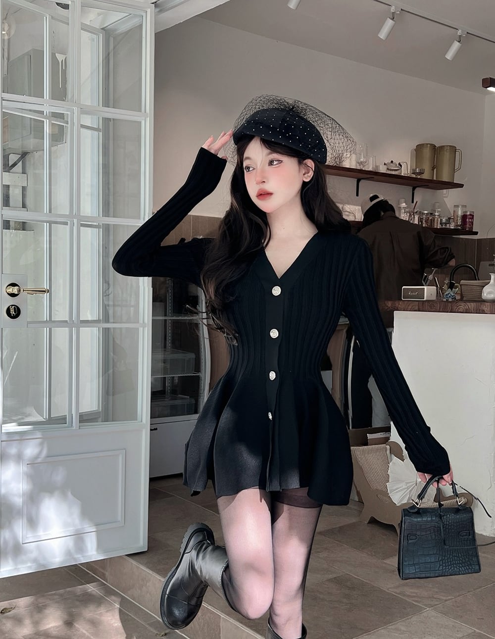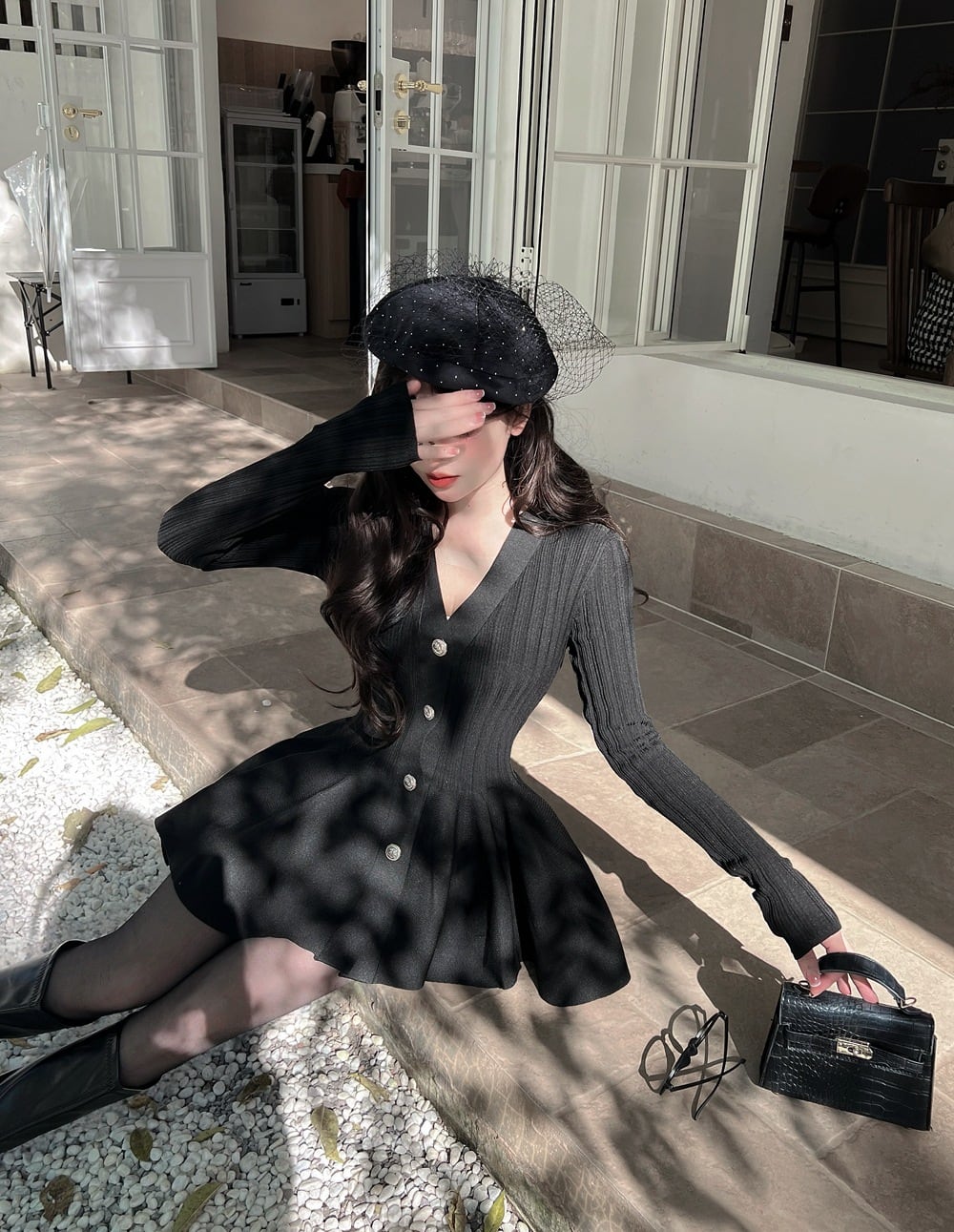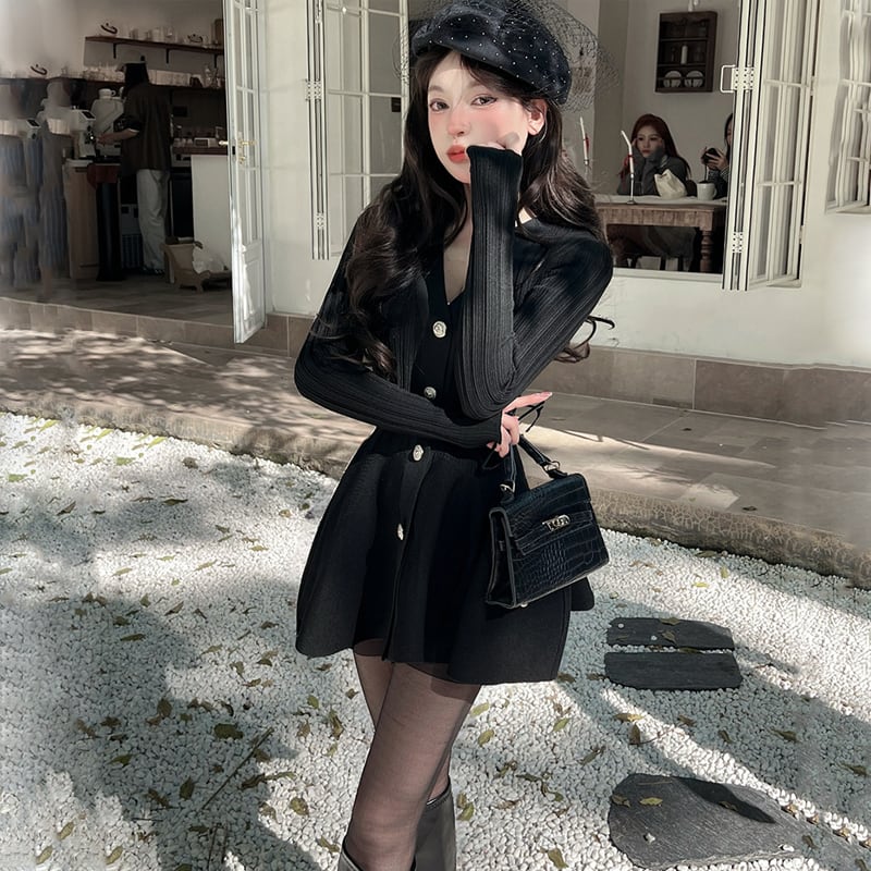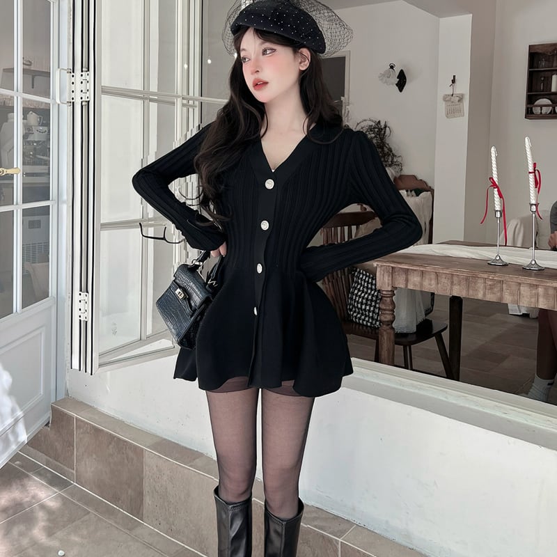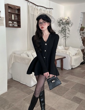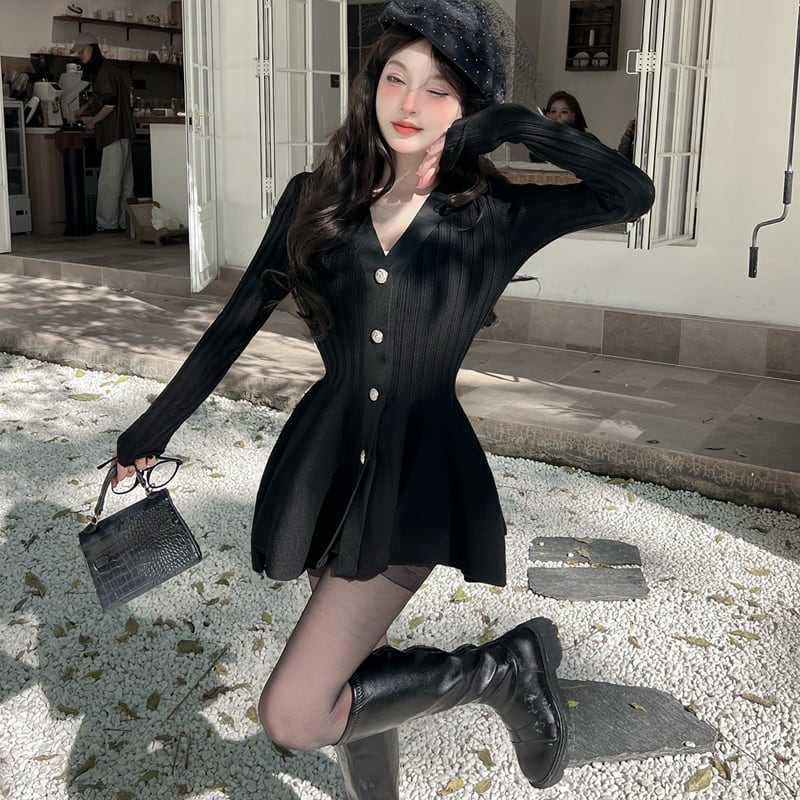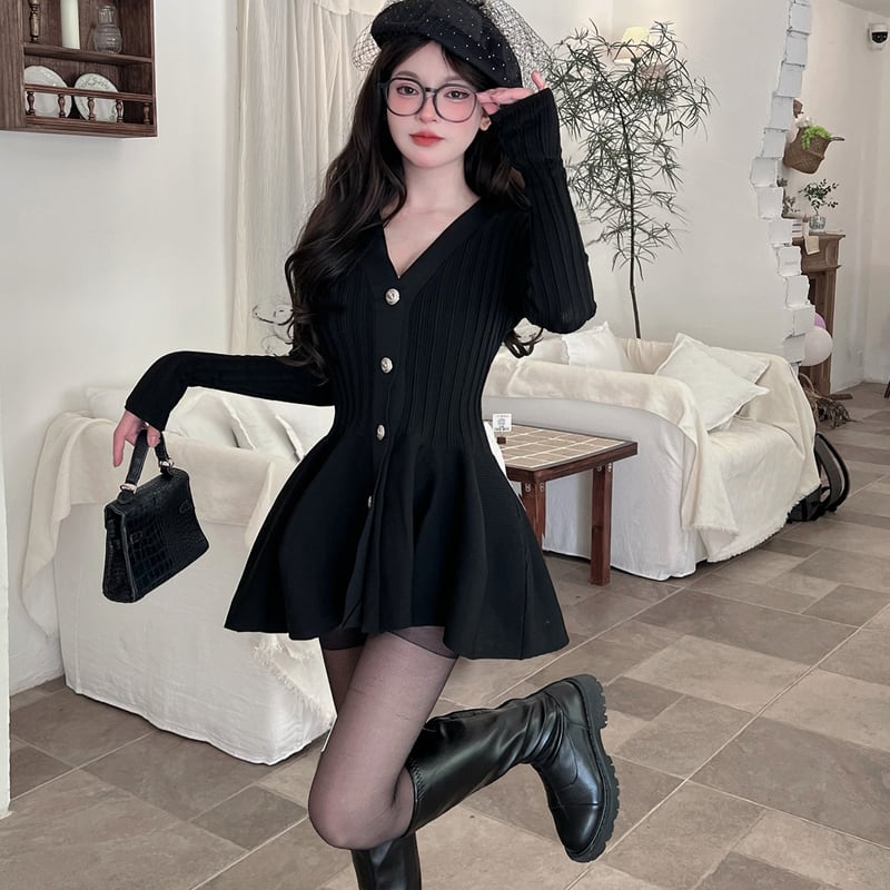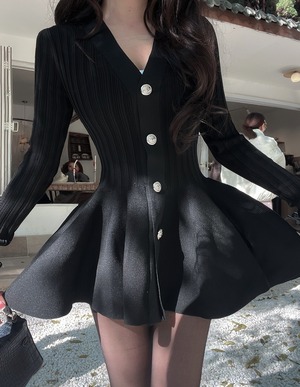 【dress】Vネックフレアニットワンピース Q7459