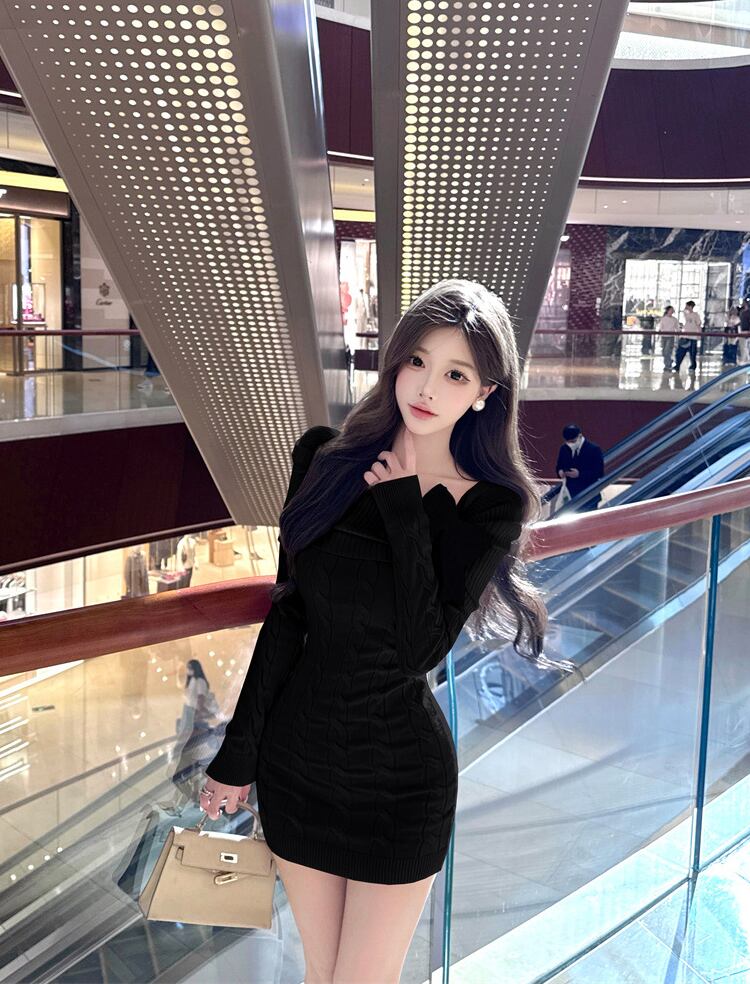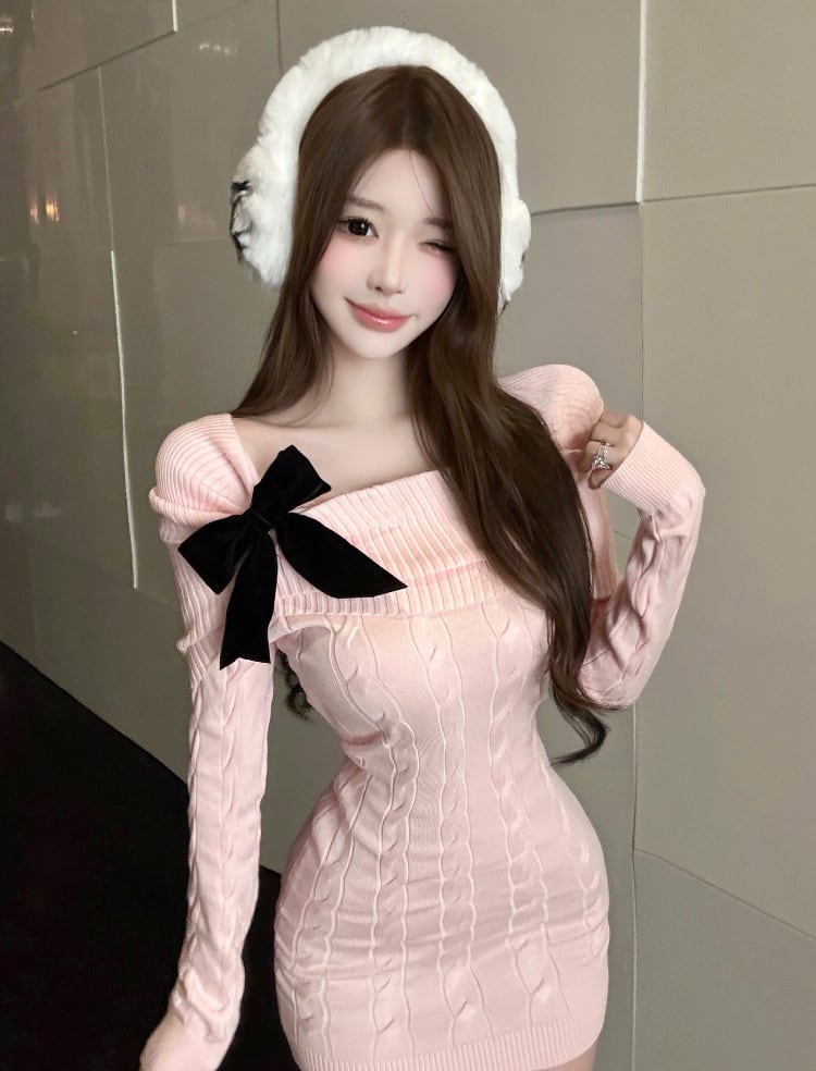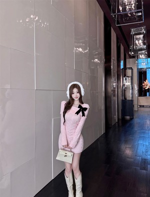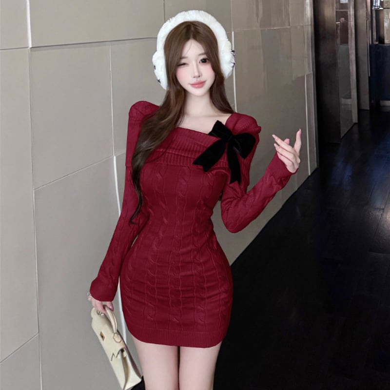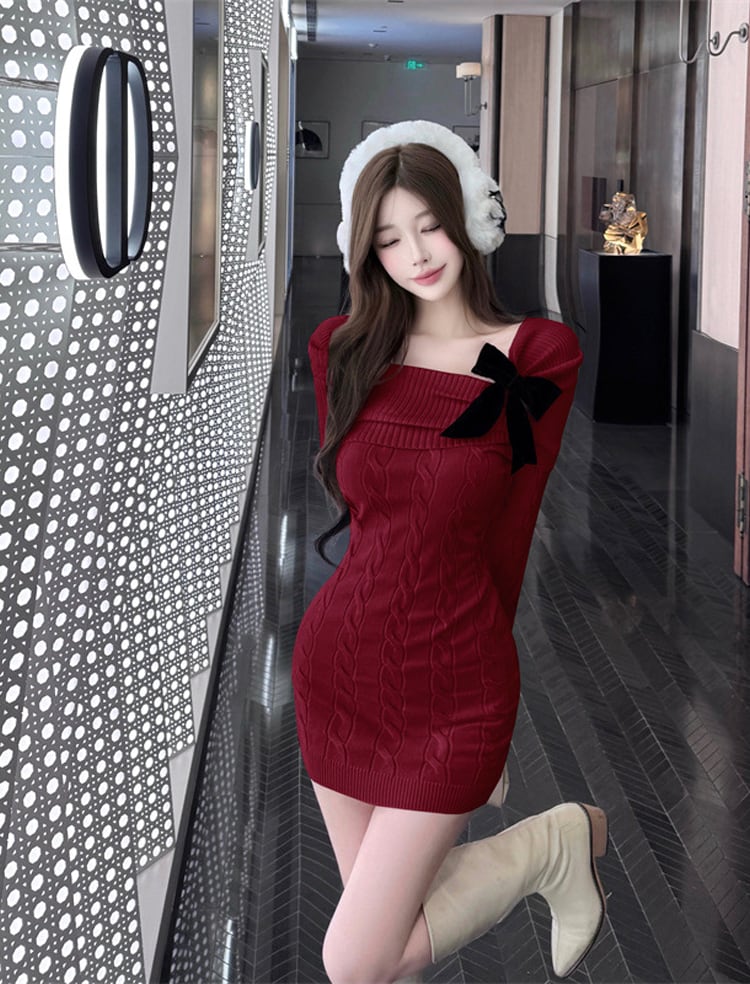 【dress】リボン付きスクエアネックニットワンピース Q7461