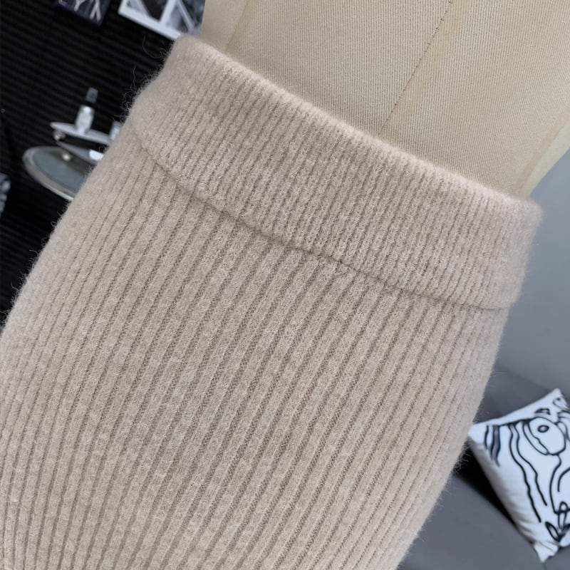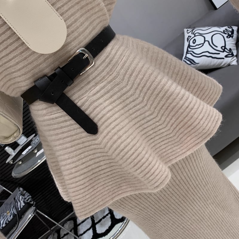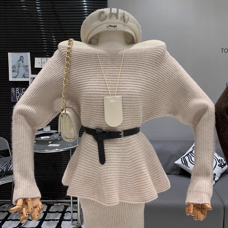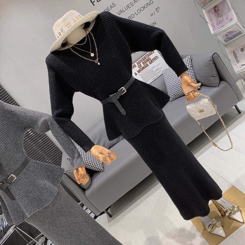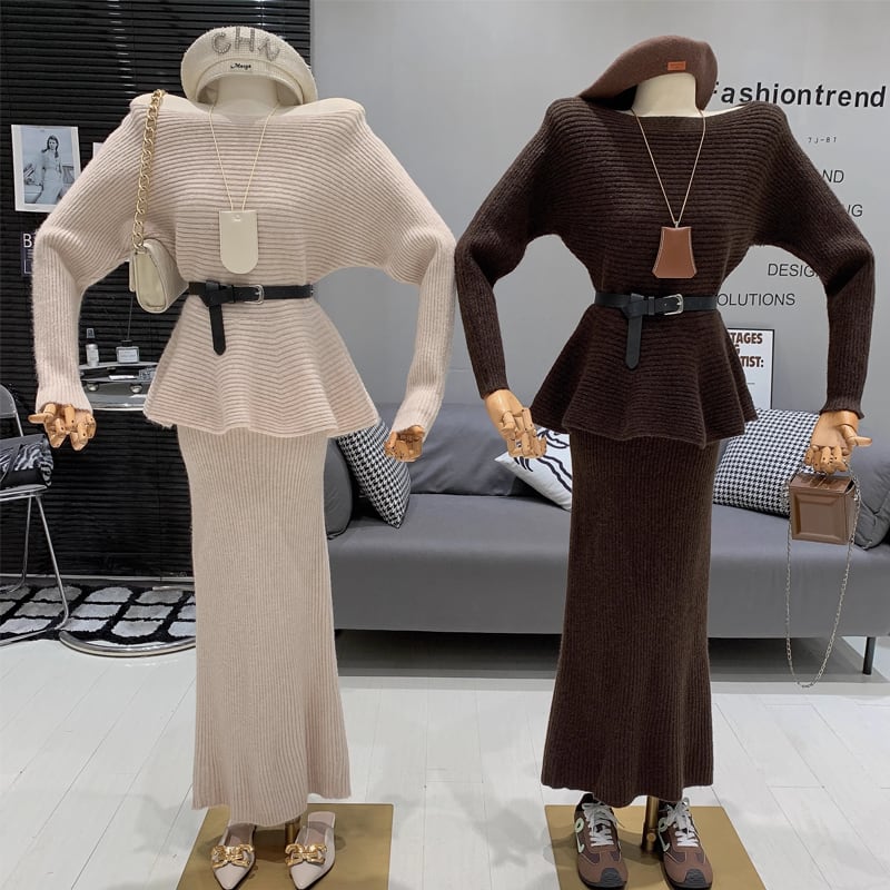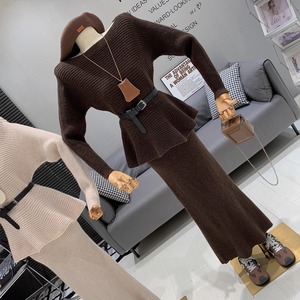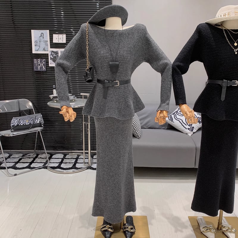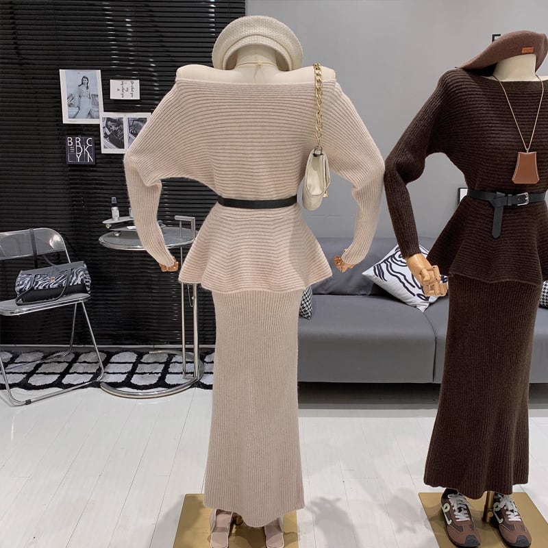 【set】ベルト付きオフショルダーニットトップス×ロングスカートセット Q7464
