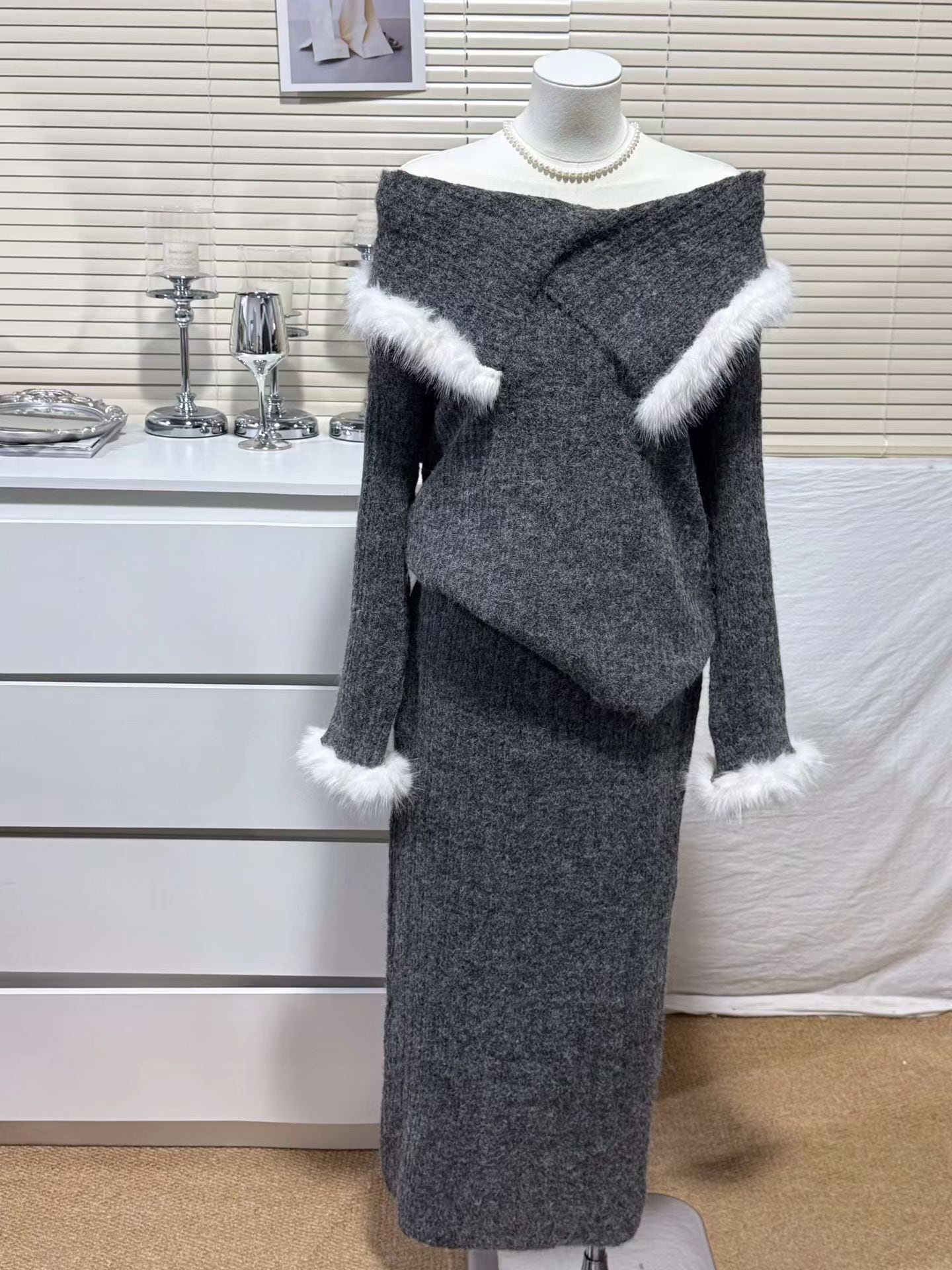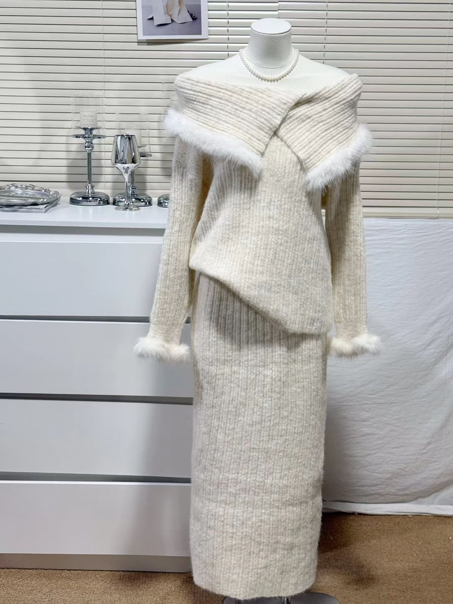 【set】ファー付きオフショルダーニットトップス×ロングスカートセット Q7477