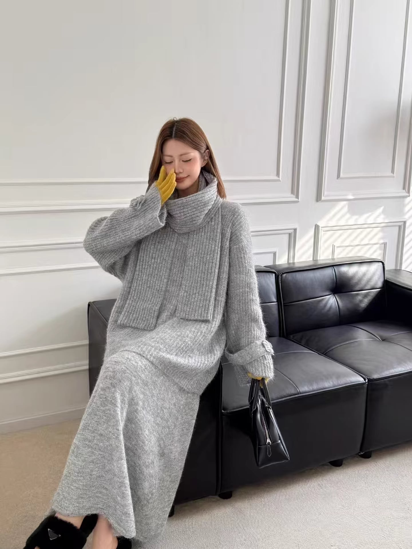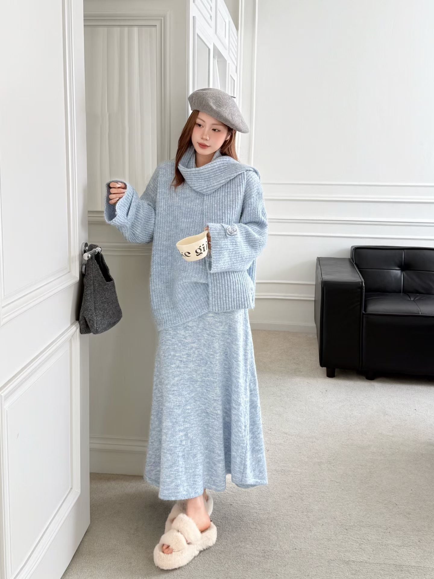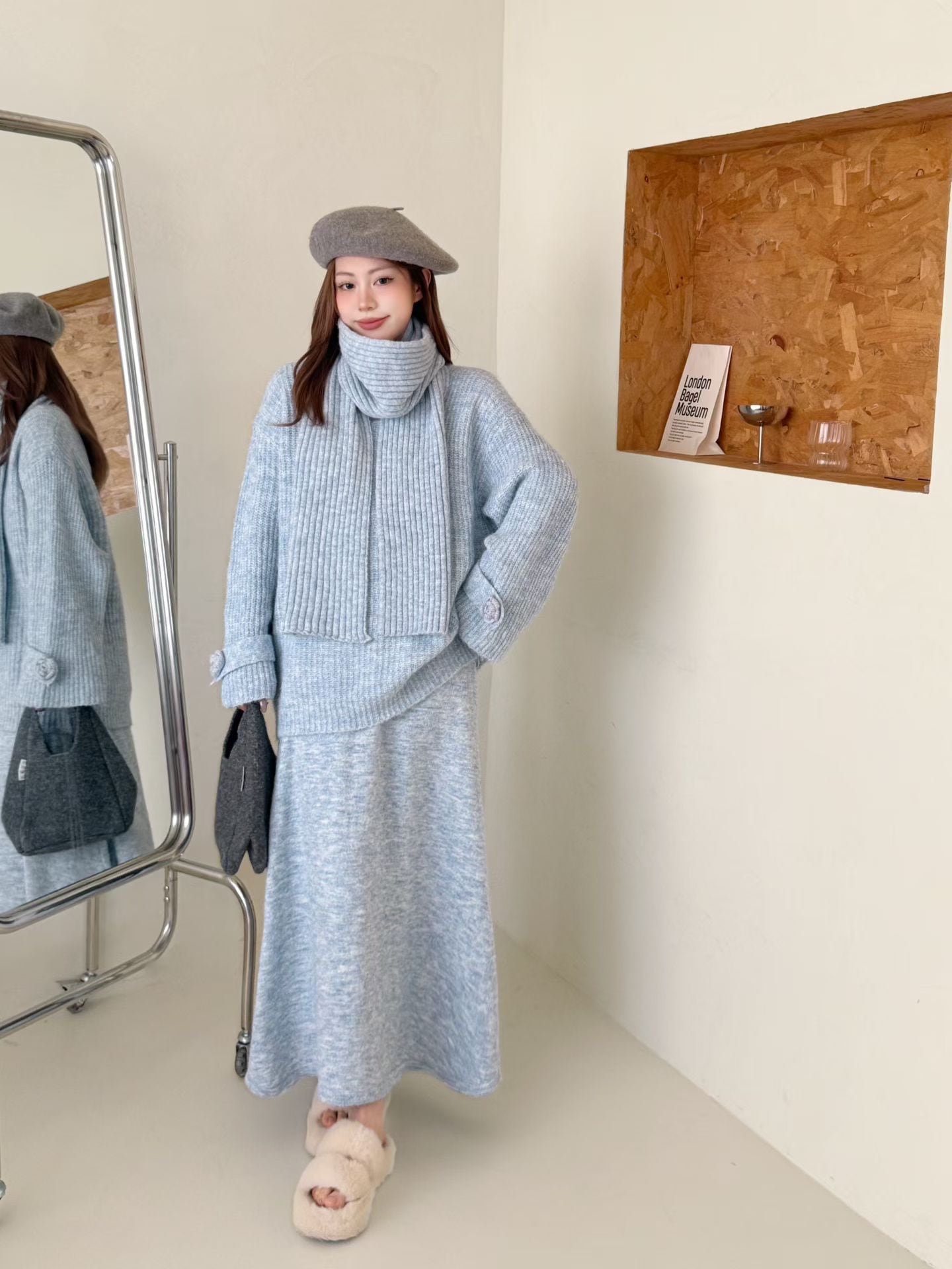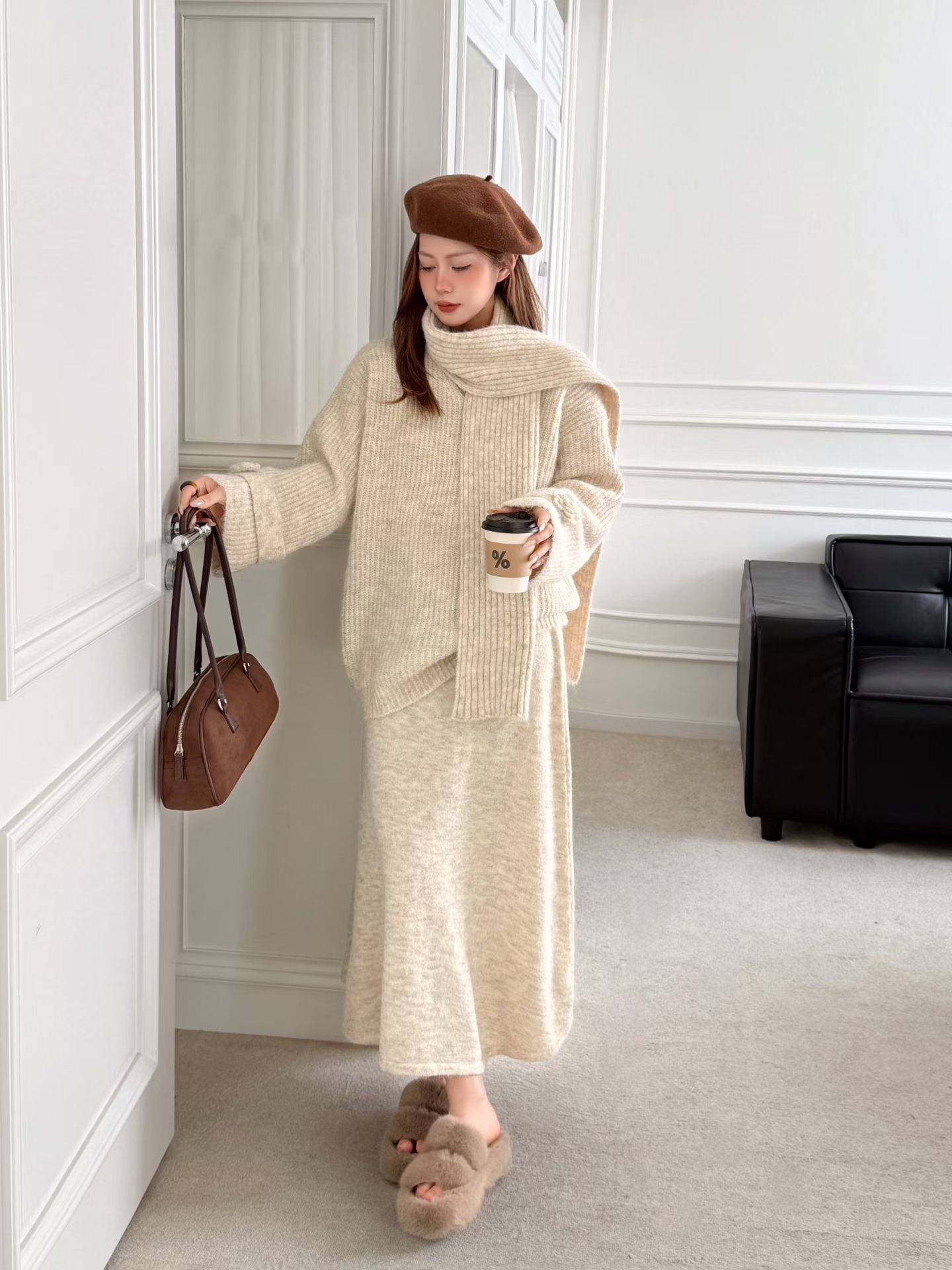 【set】マフラー×ニットトップス×ロングスカートセット Q7478