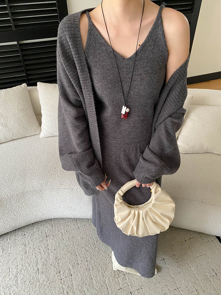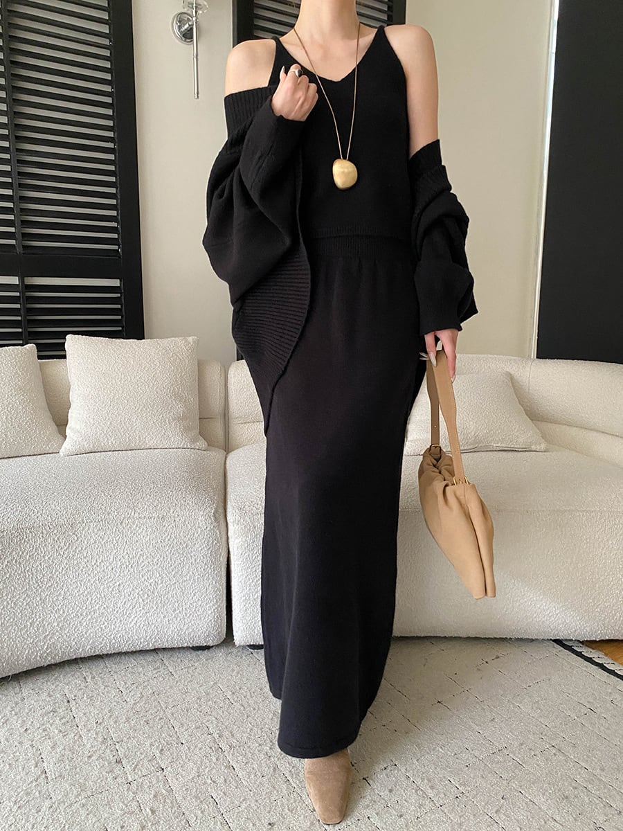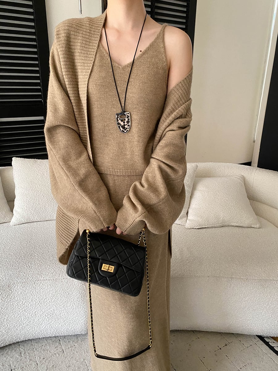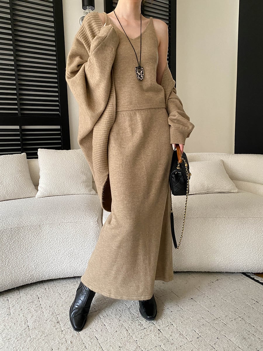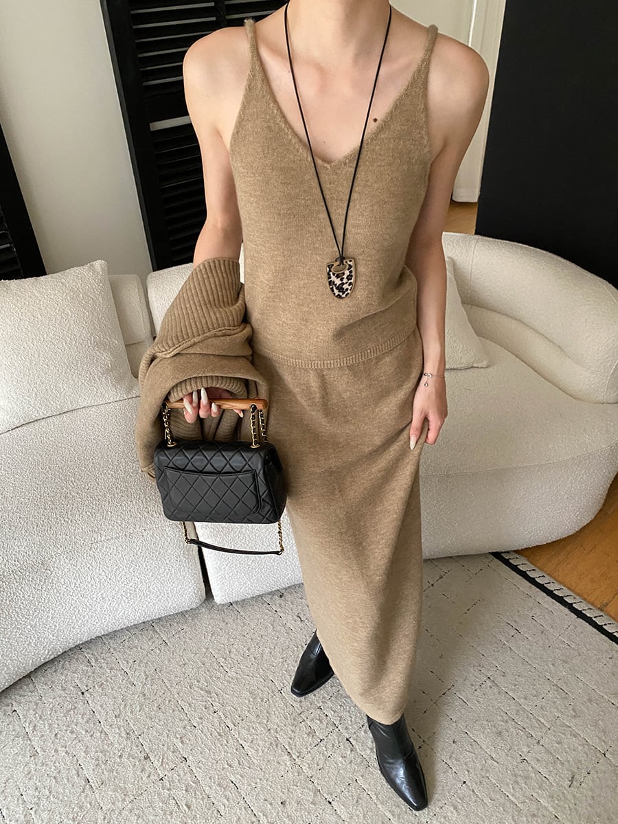 【set】ニットキャミ×カーディガン×ロングスカート3点セット Q7487