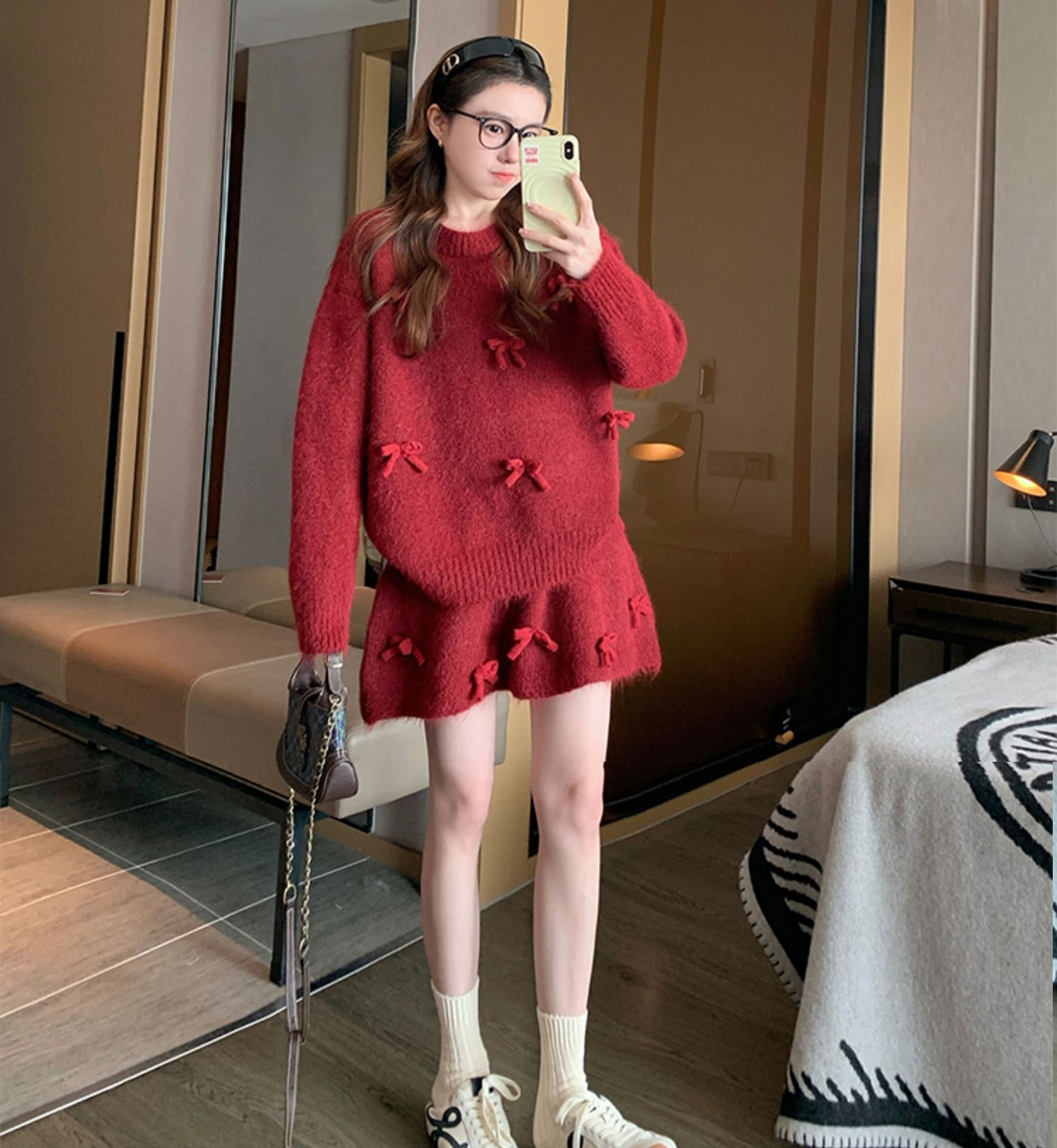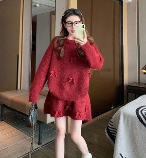【set】リボン付きニットトップス×ミニスカートセット Q7504