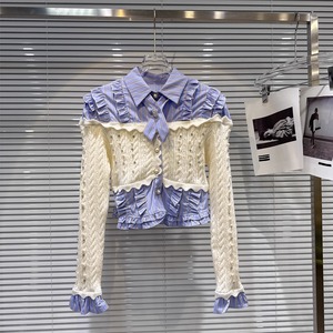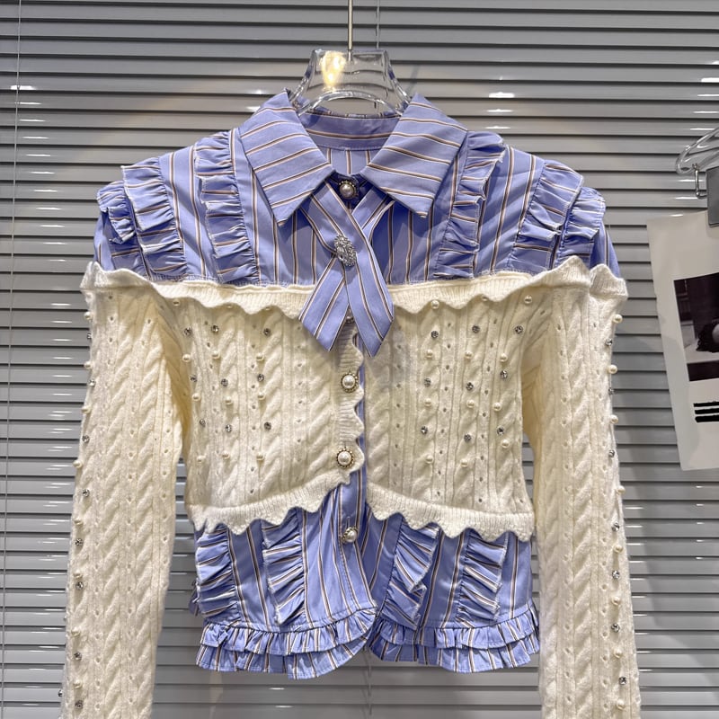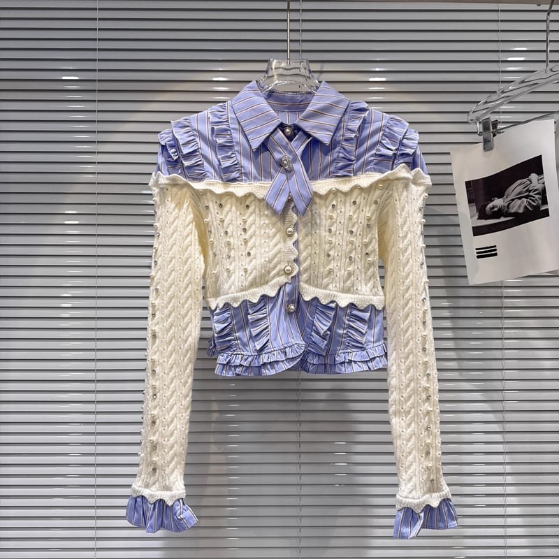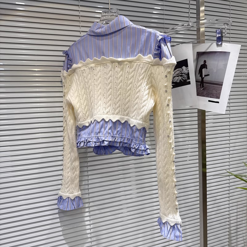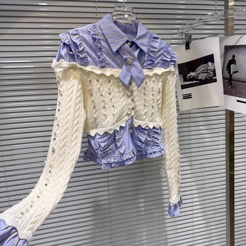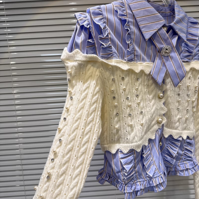 【tops】パール付きニットドッキングシャツ Q7541