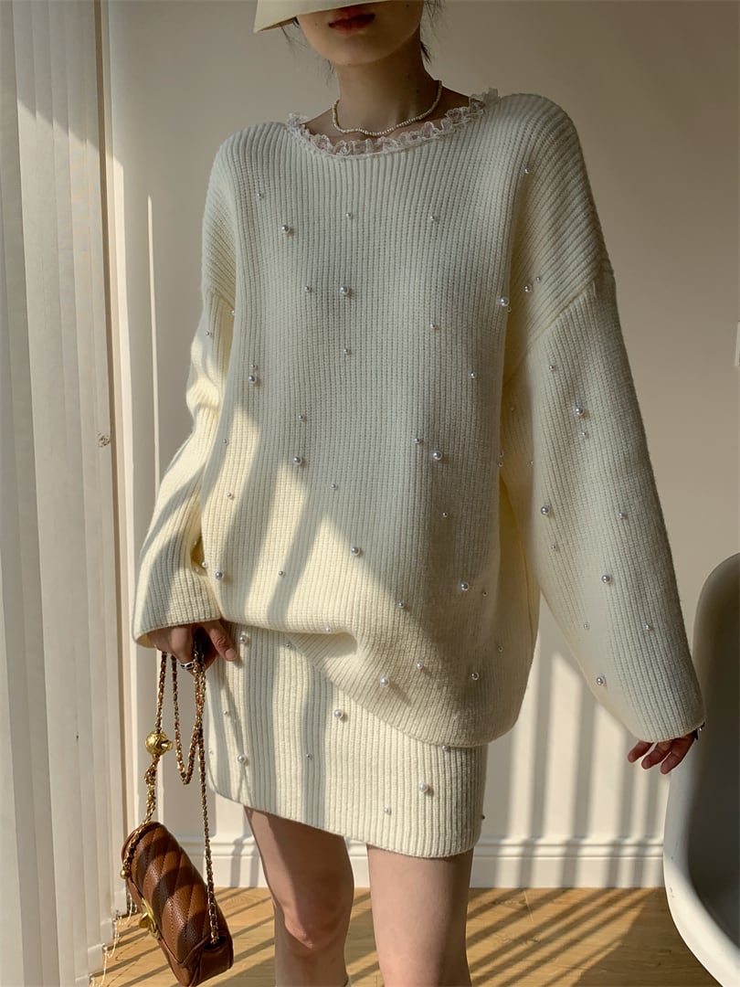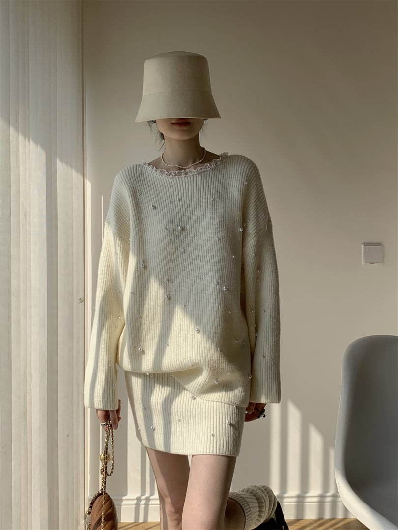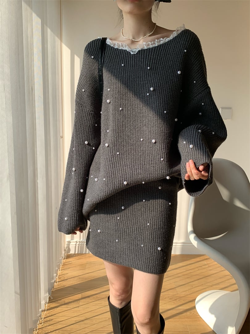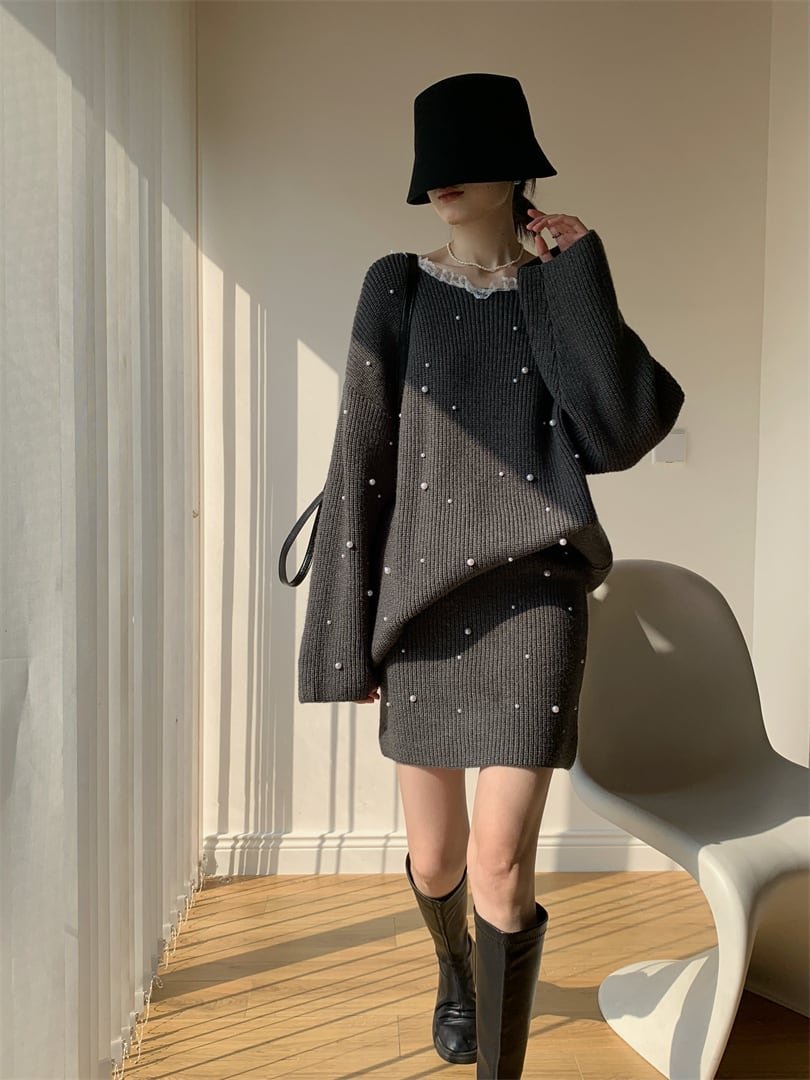 【set】パール付きニットトップス×ミニスカートセット Q7544