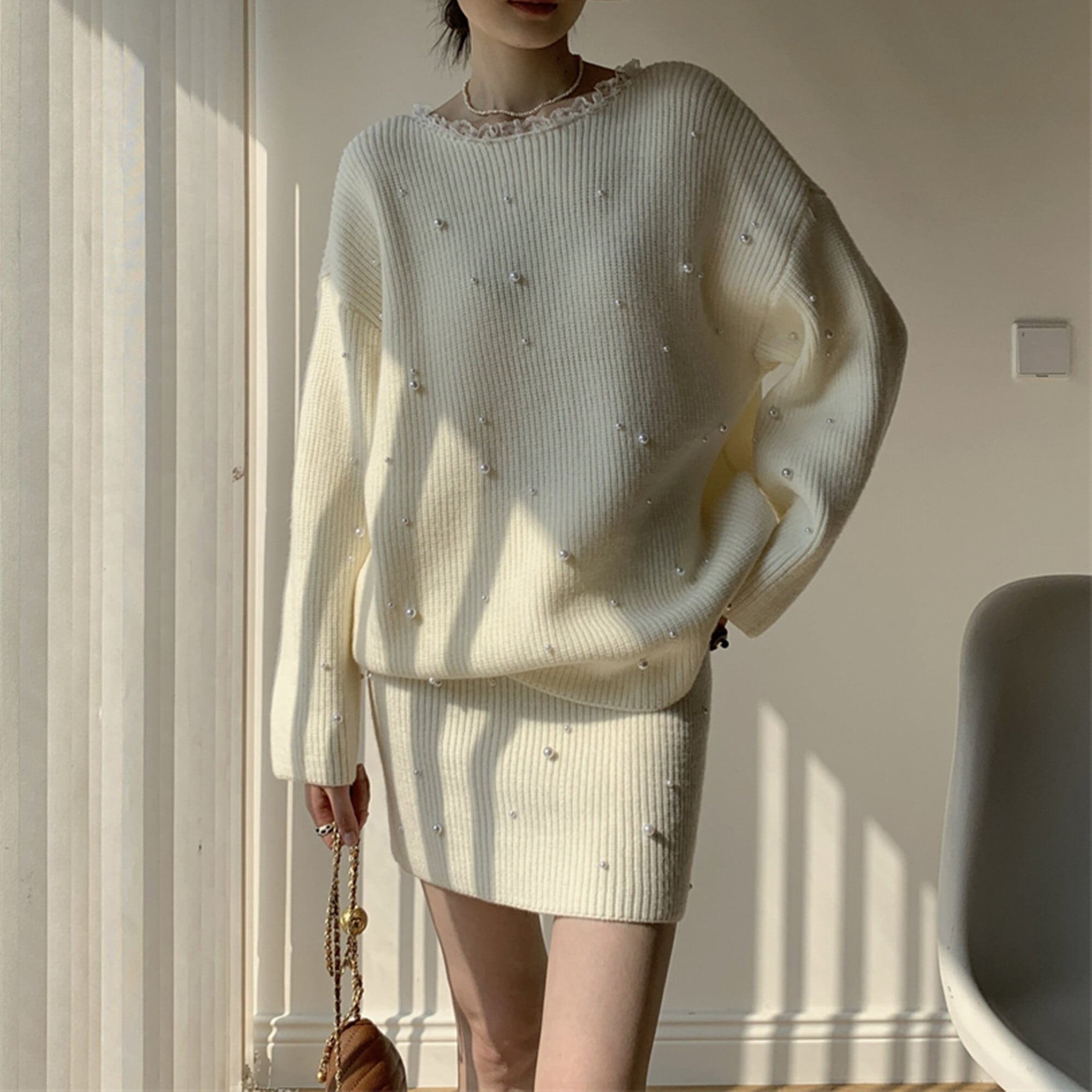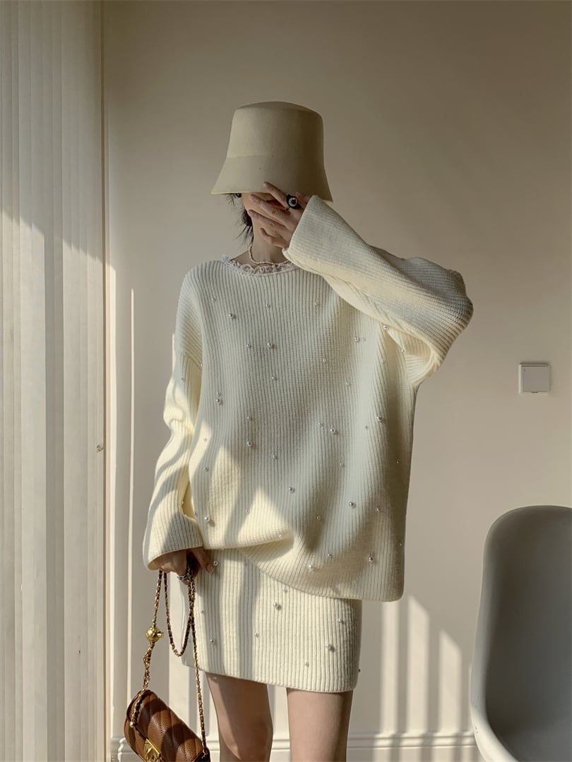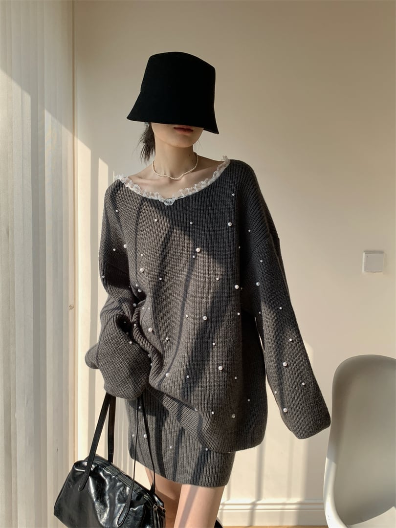 【set】パール付きニットトップス×ミニスカートセット Q7544