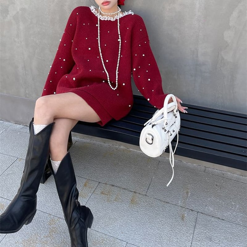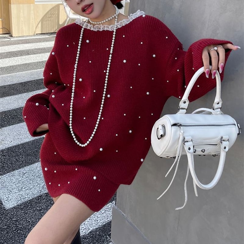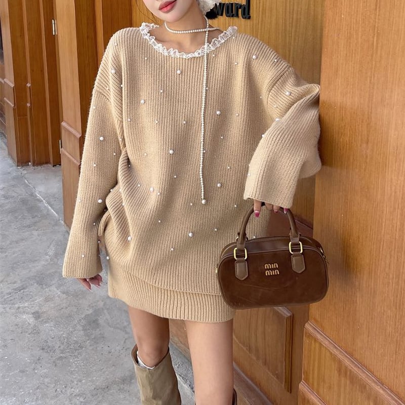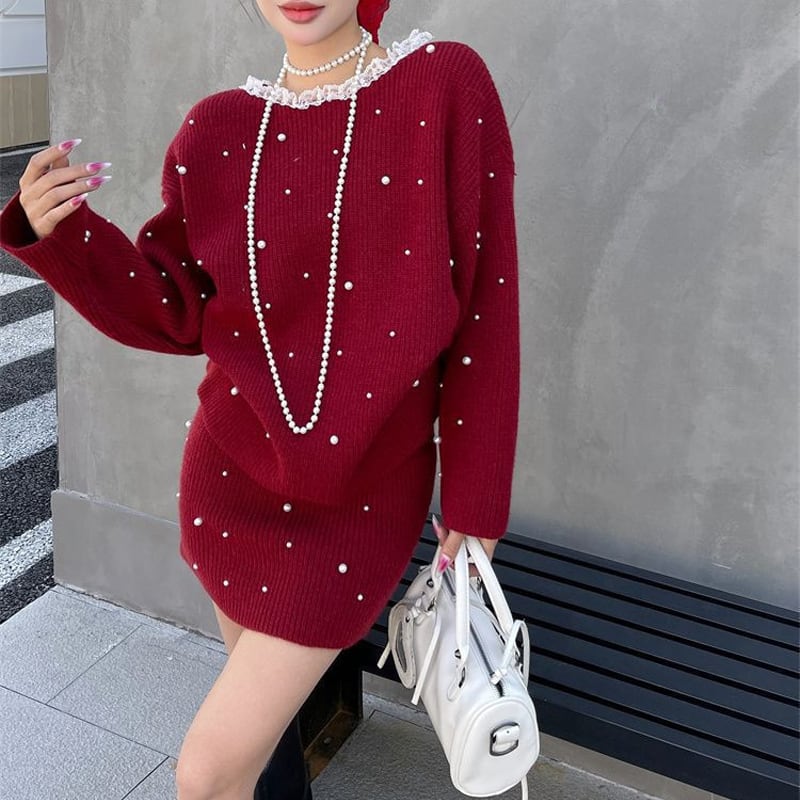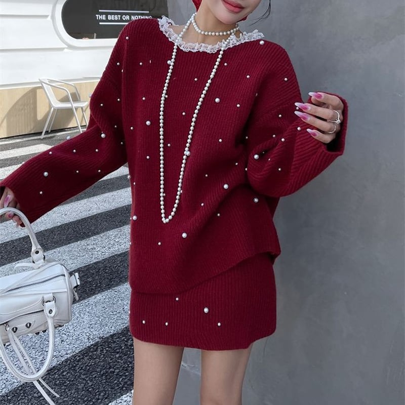 【set】パール付きレースネックニットトップス×ミニスカートセット Q7544