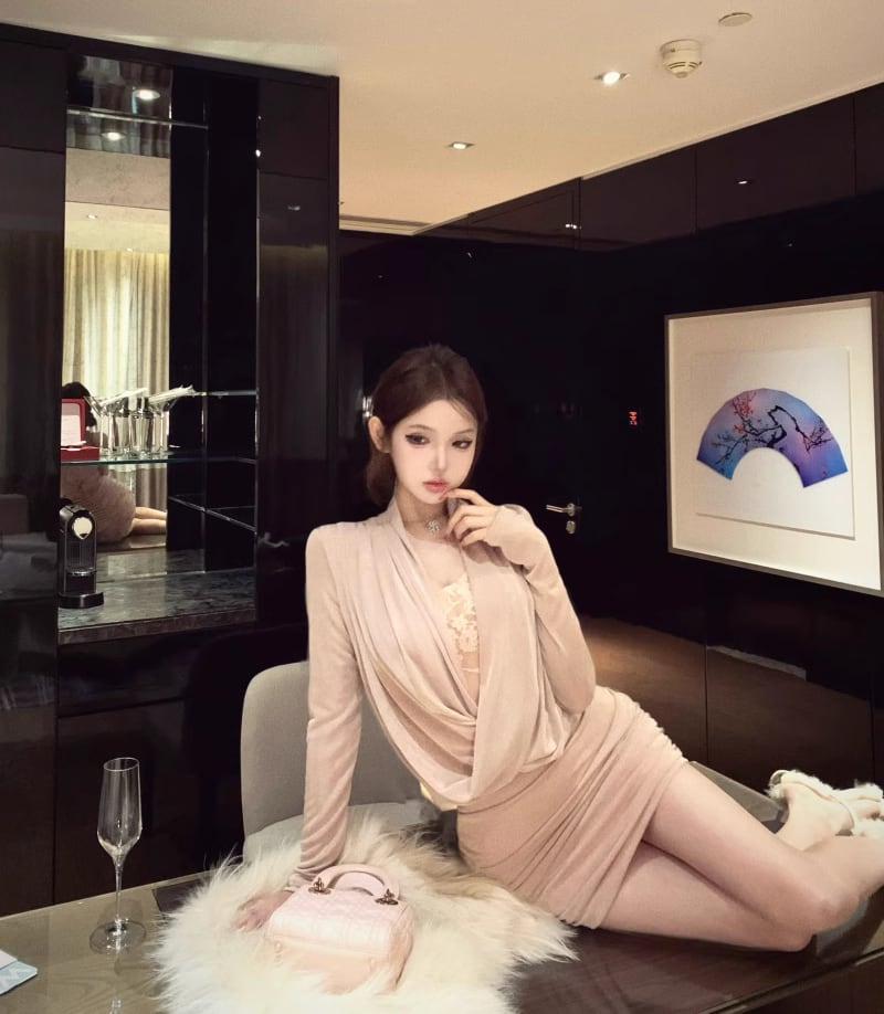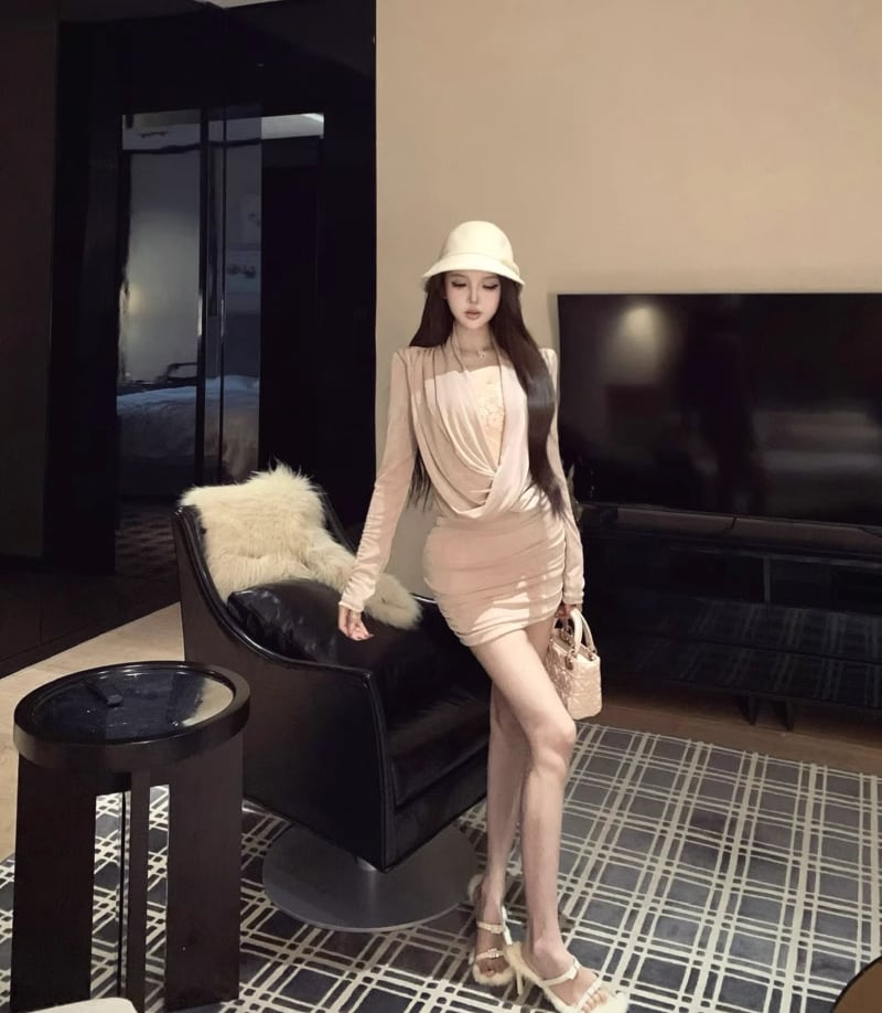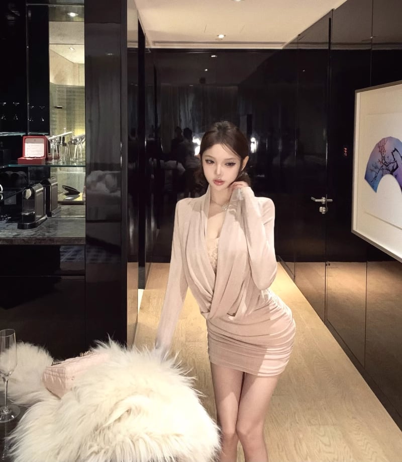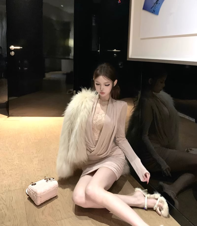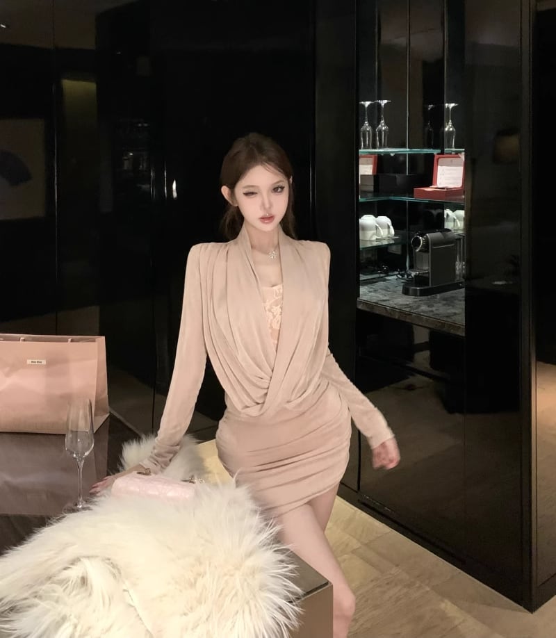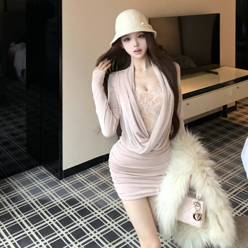【dress】レースドッキングドレープドネックタイトワンピース Q7546