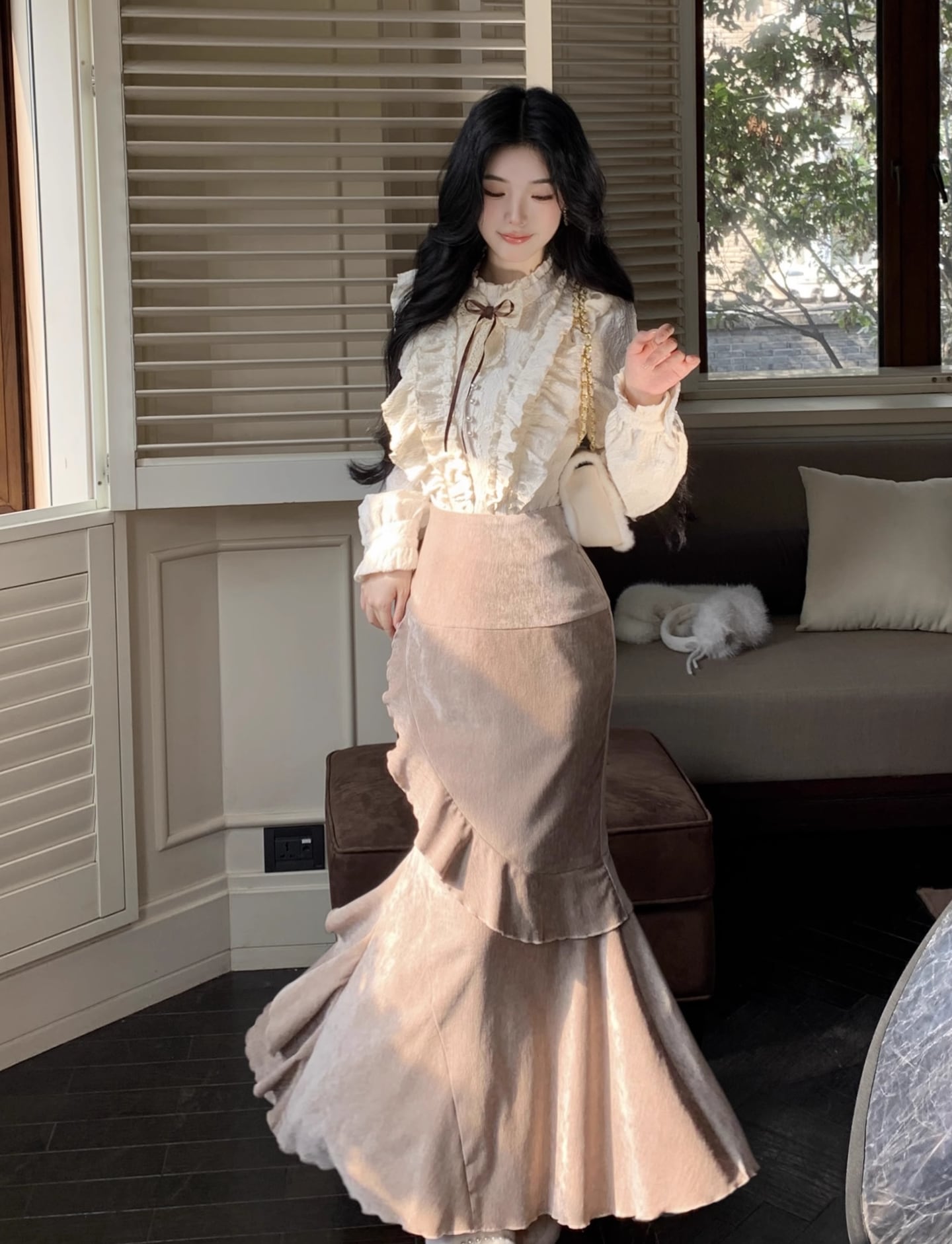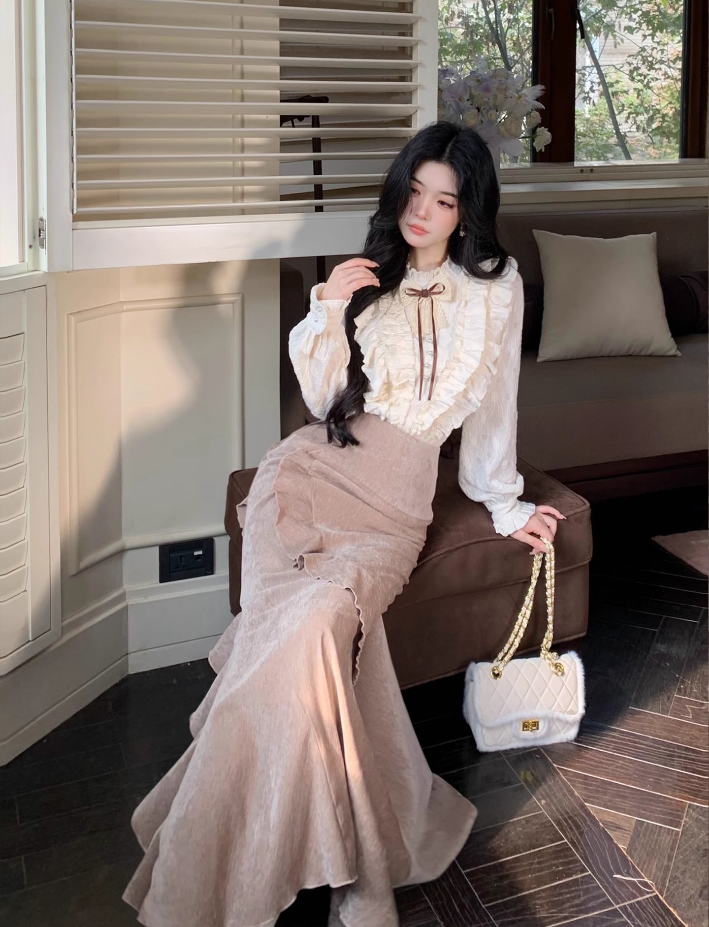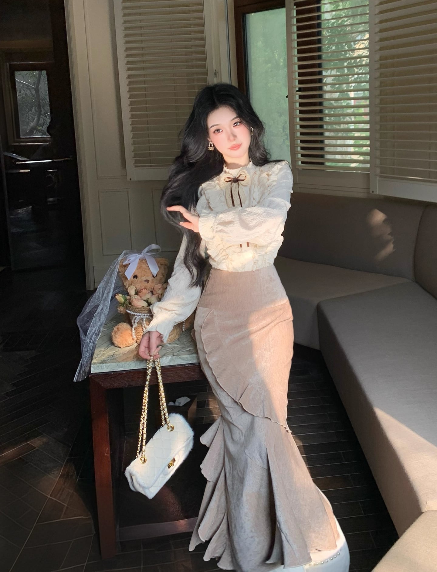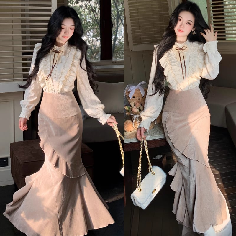 【set】ギャザーフリルシャツ×イレヘムマーメイドスカートセット Q7552