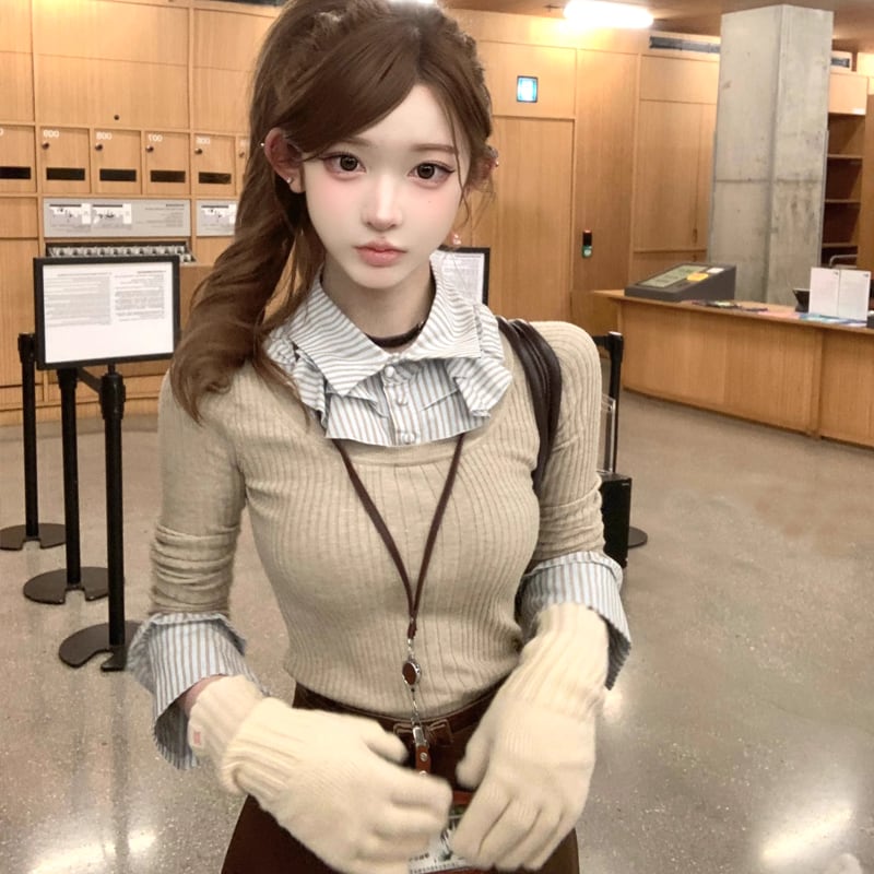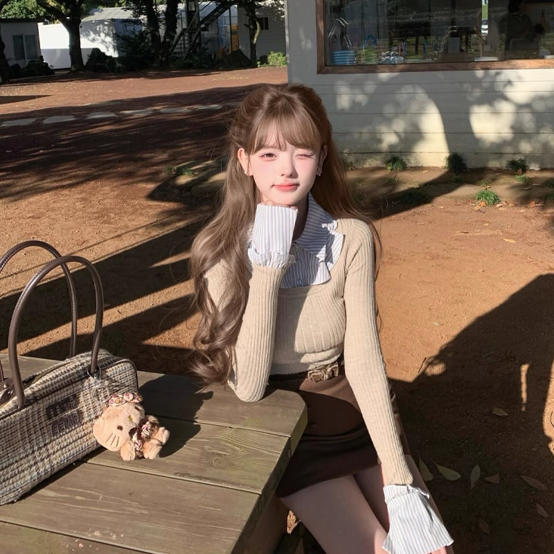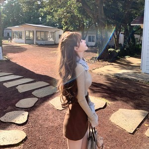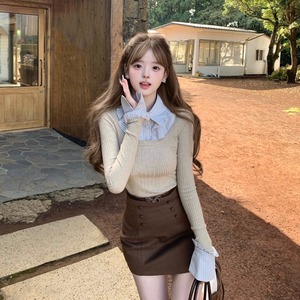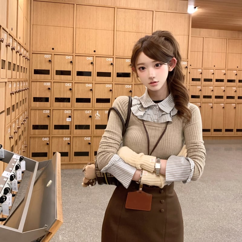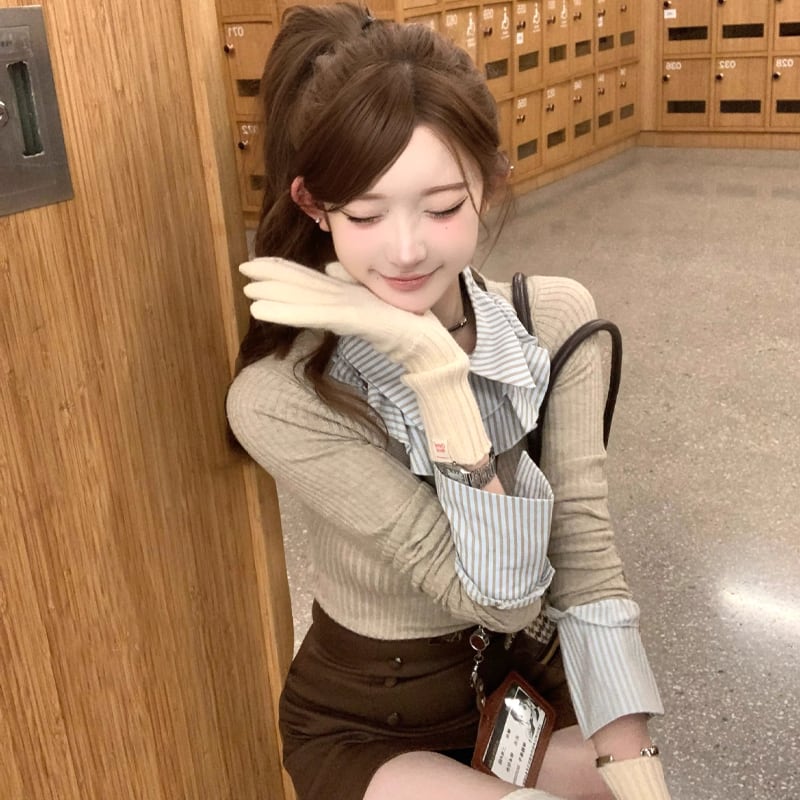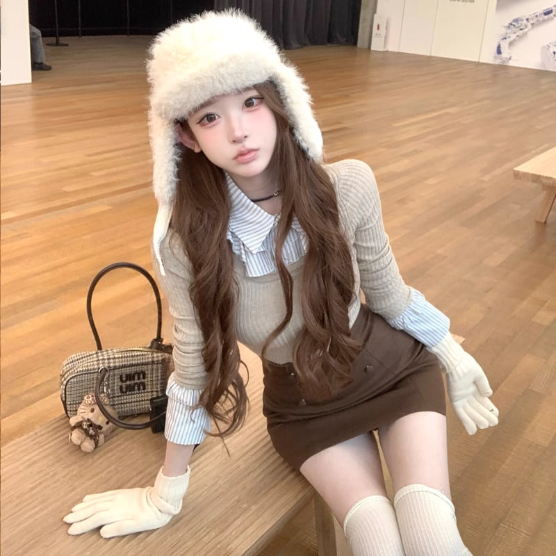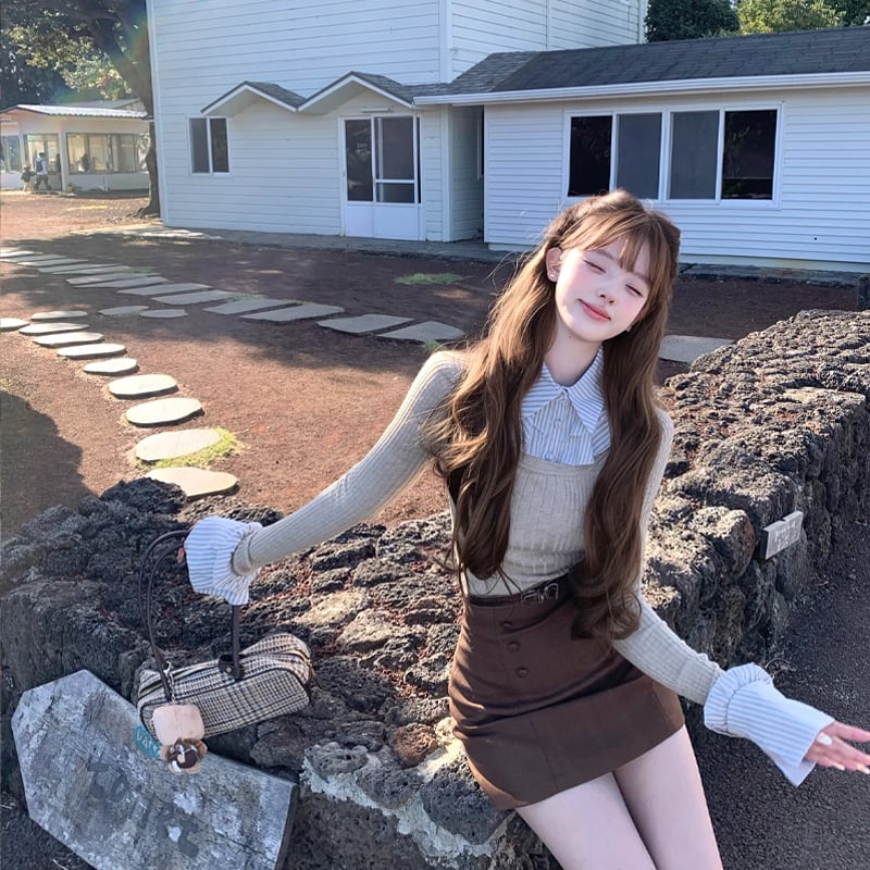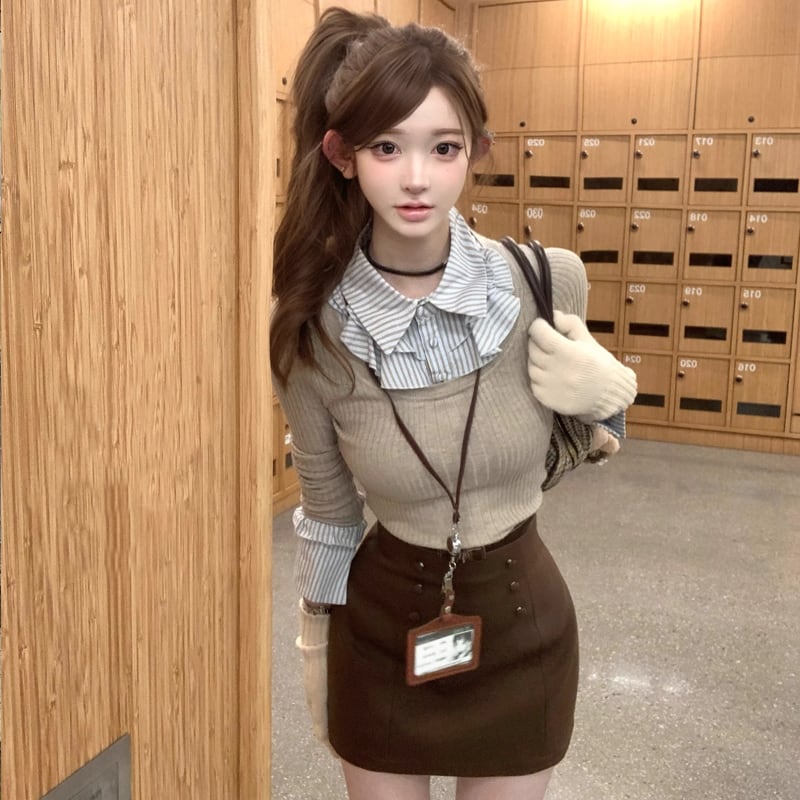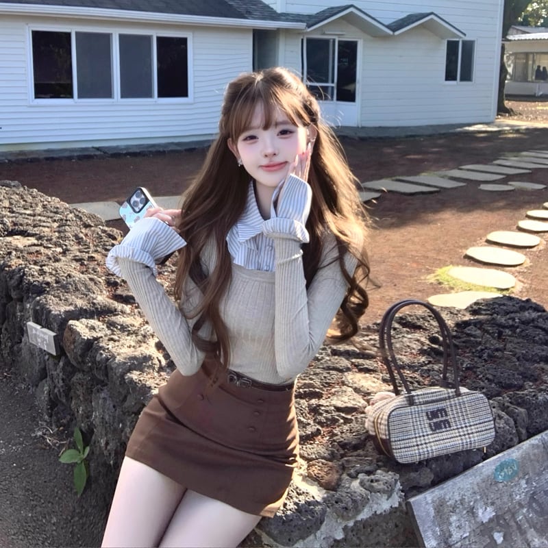 【set】フェイクレイヤードトップス×タイトスカートセット Q7553