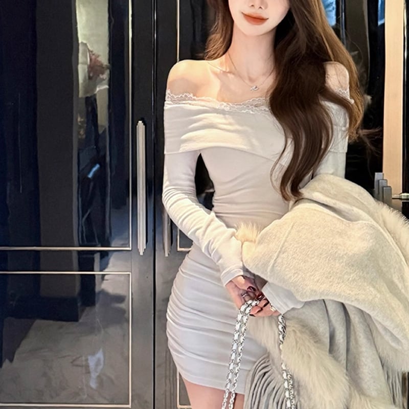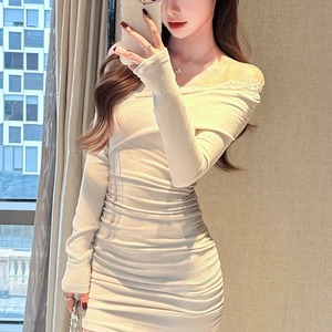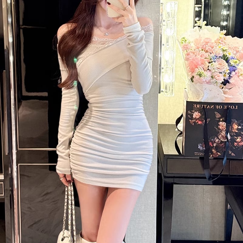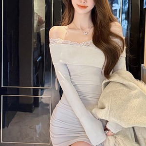 【dress】オフショルダーレースドッキングワンピース Q7555