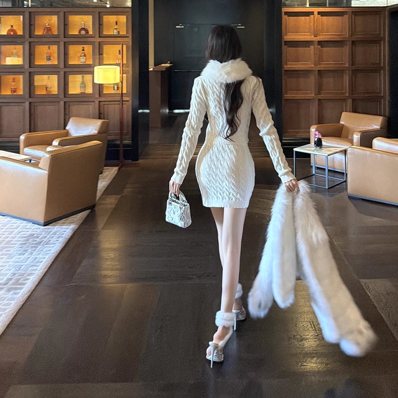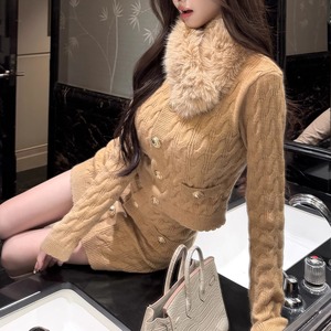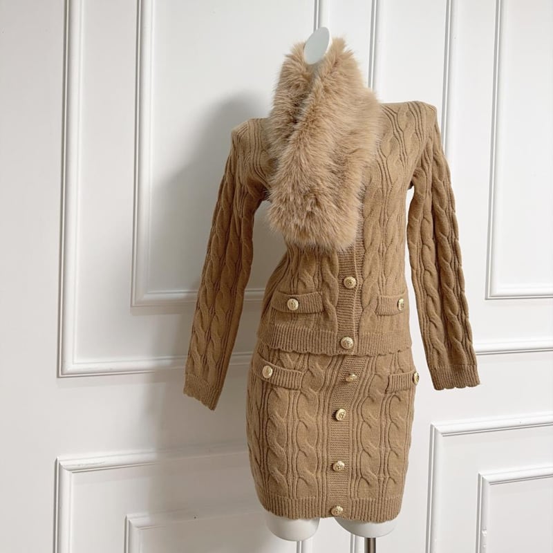 【set】ファースカーフ付きニットトップス×ストレートスカートセット Q7560