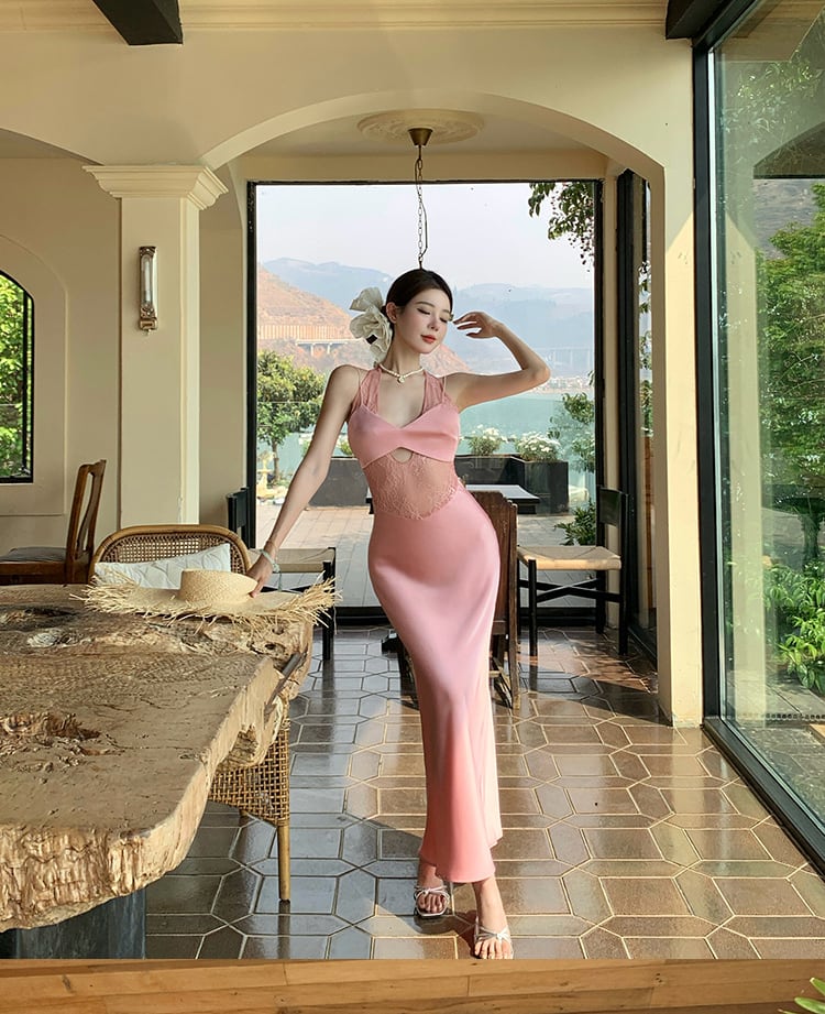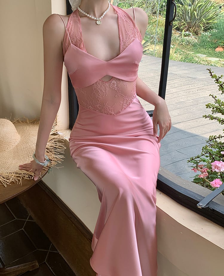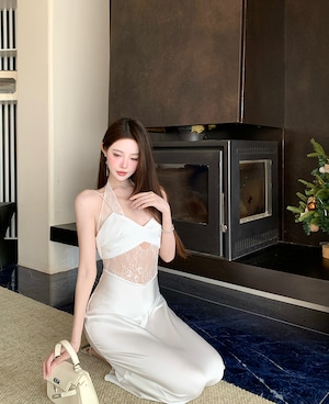 【dress】レースドッキングロングホルターネックワンピース Q7581