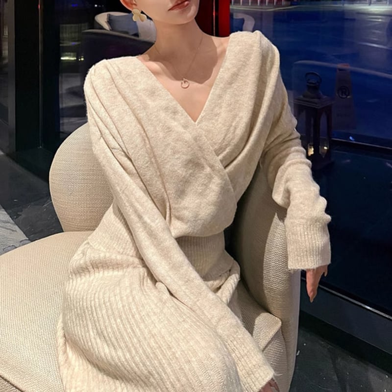 【set】クロスネックニットトップス×ワイドパンツセット Q7598