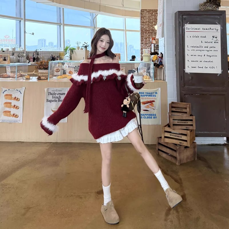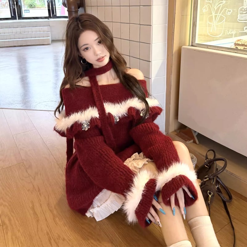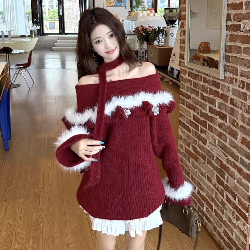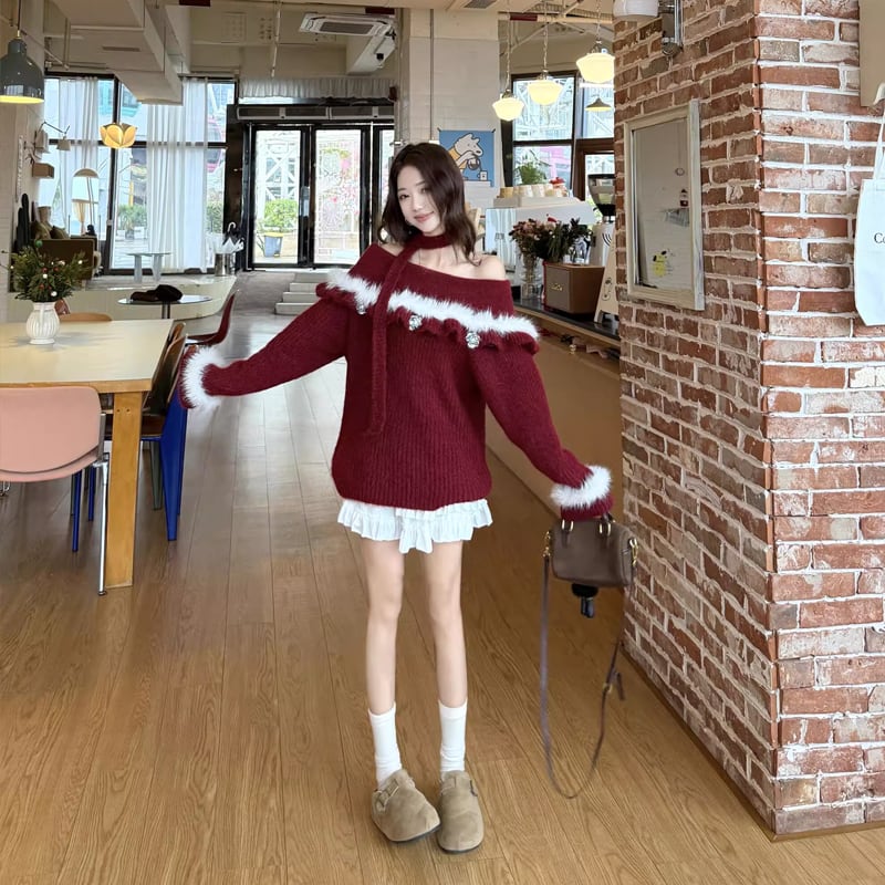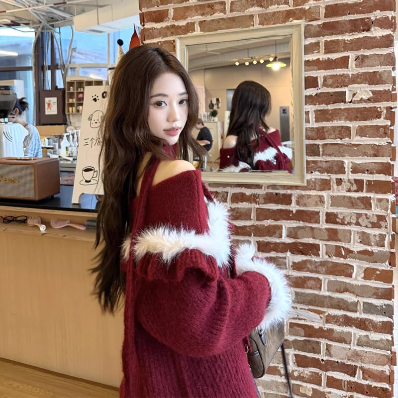 【tops】オフショルダーファードッキングニットトップス Q7599