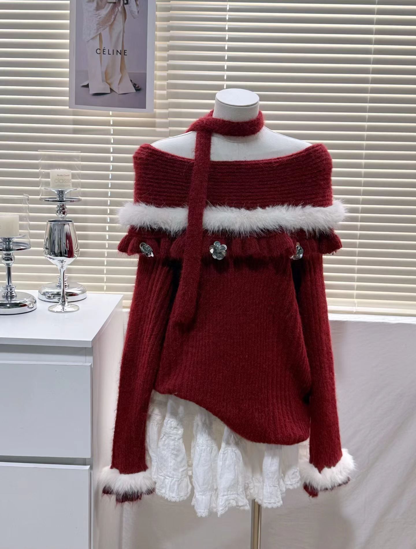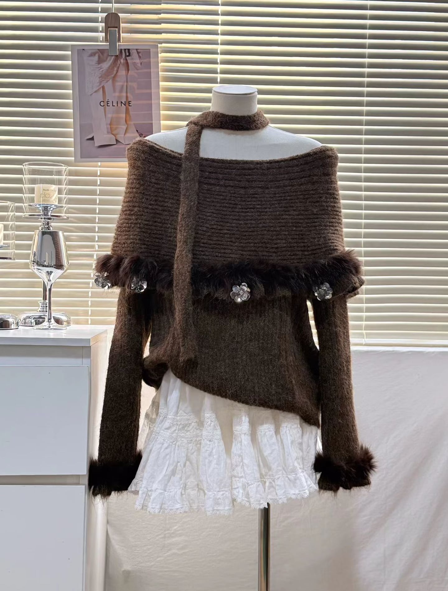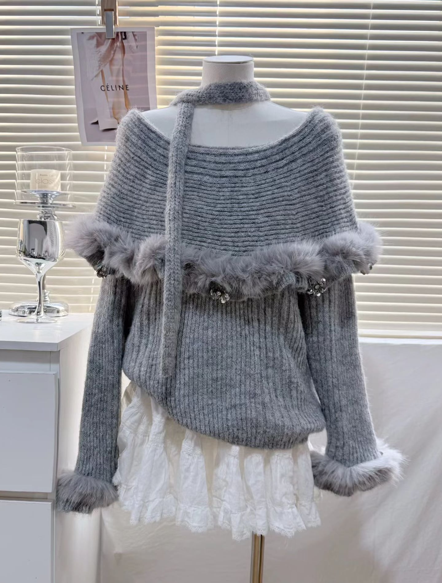 【tops】オフショルダーファードッキングニットトップス Q7599