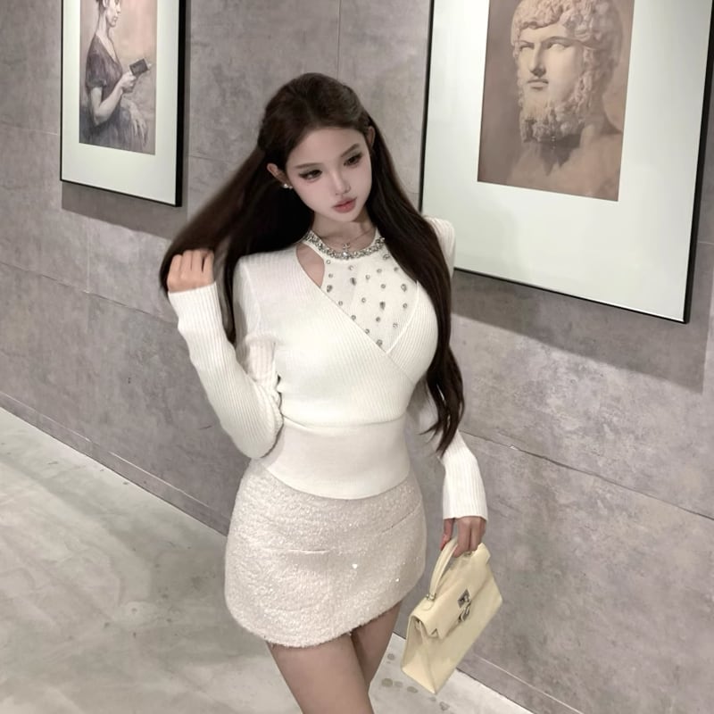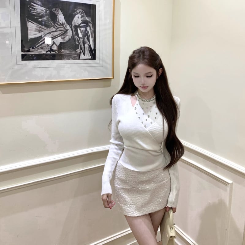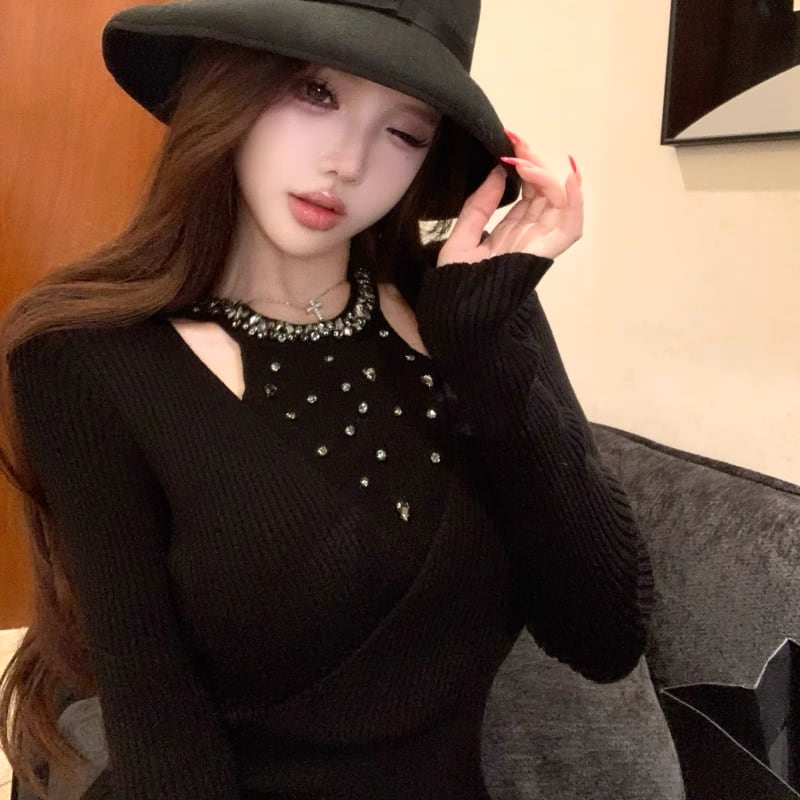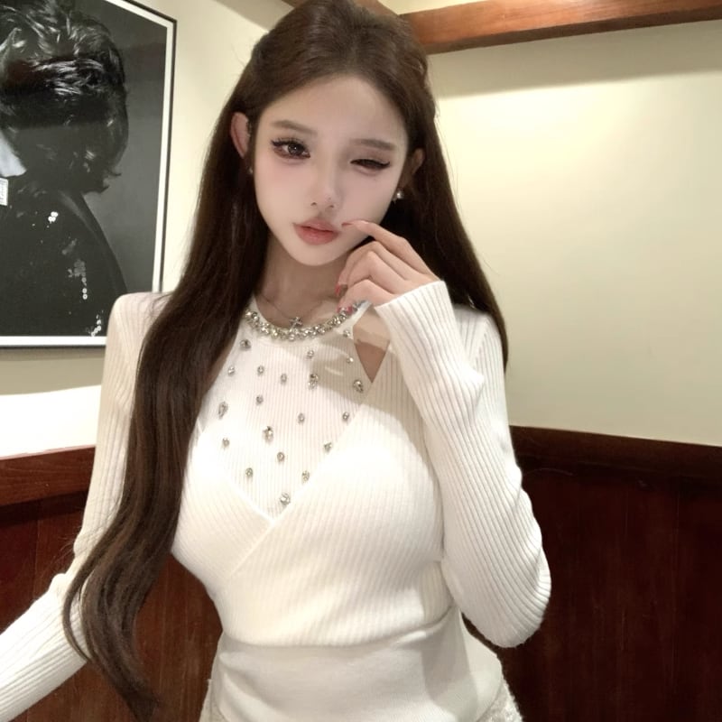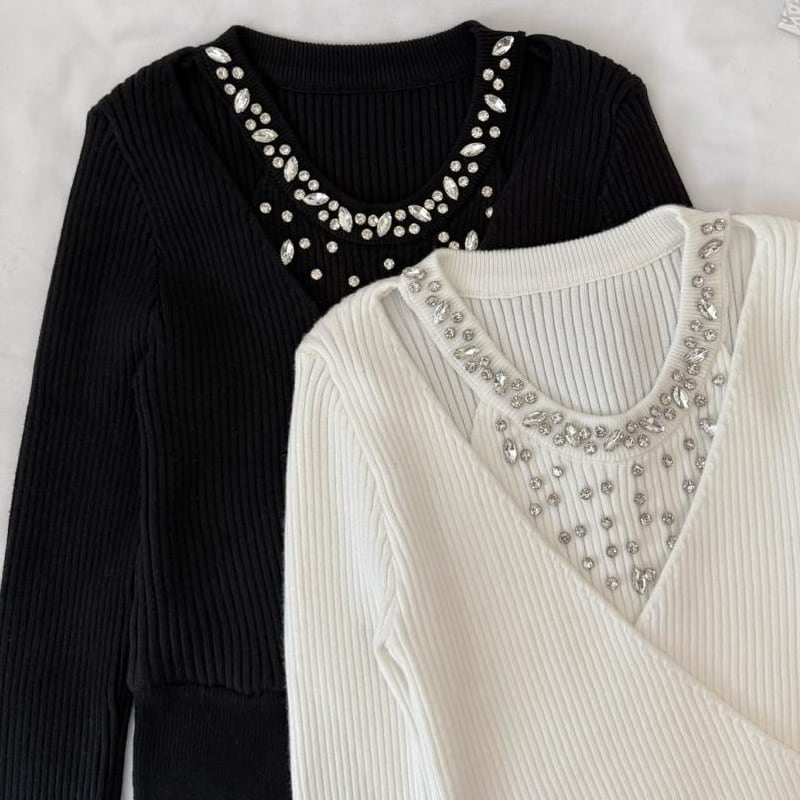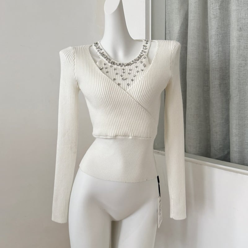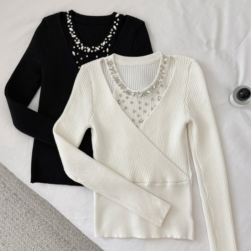 【tops】ラインストーン付きニットトップス Q7614