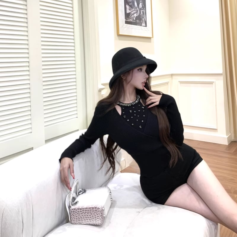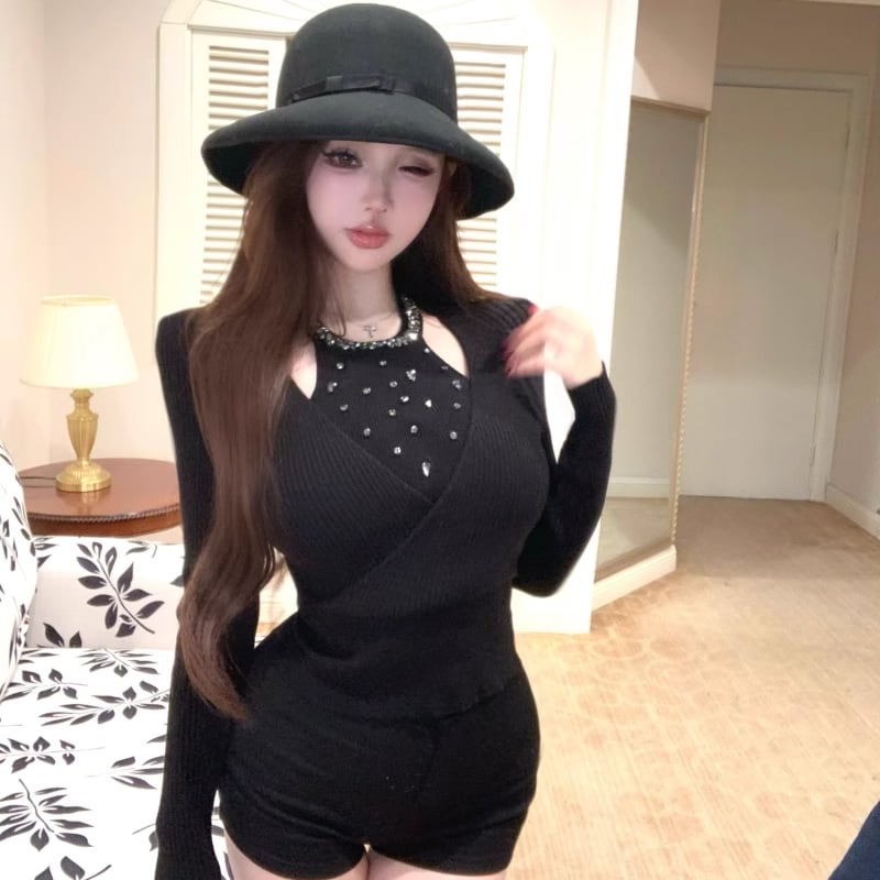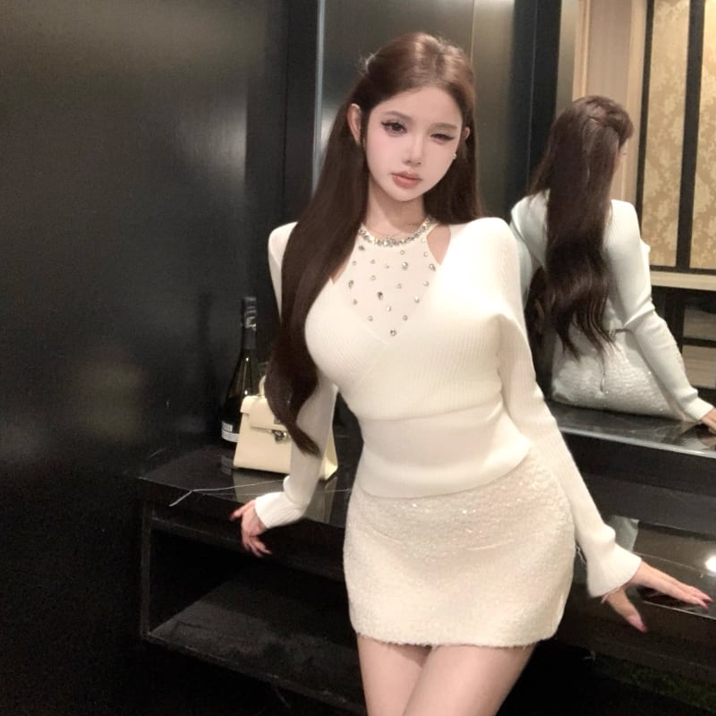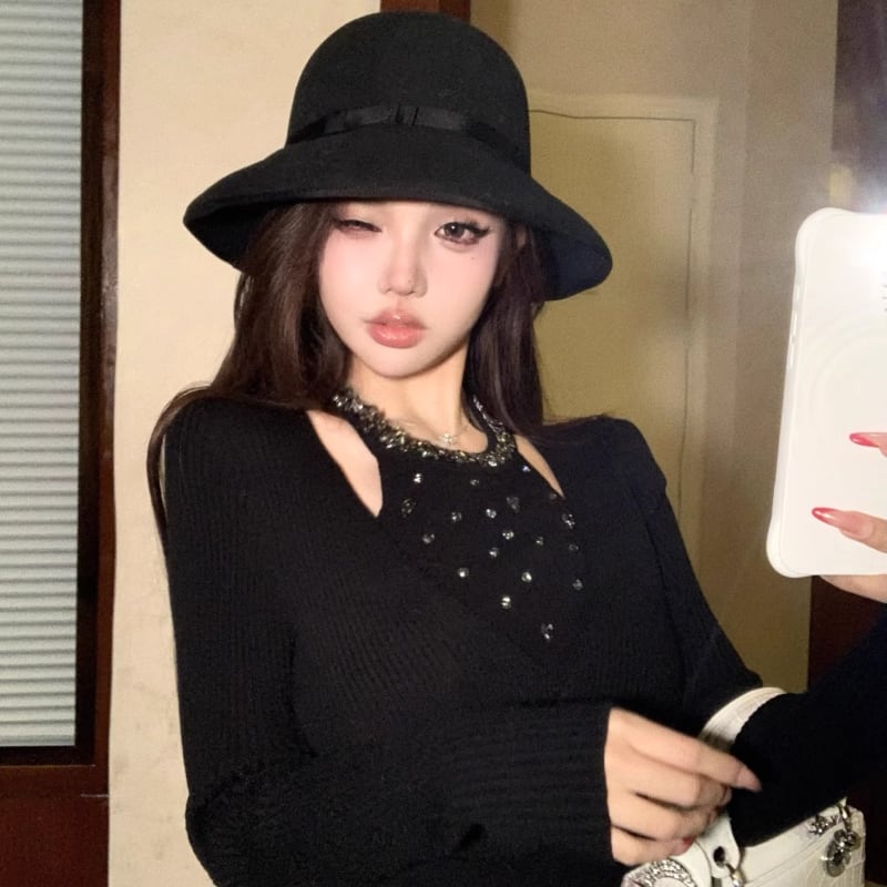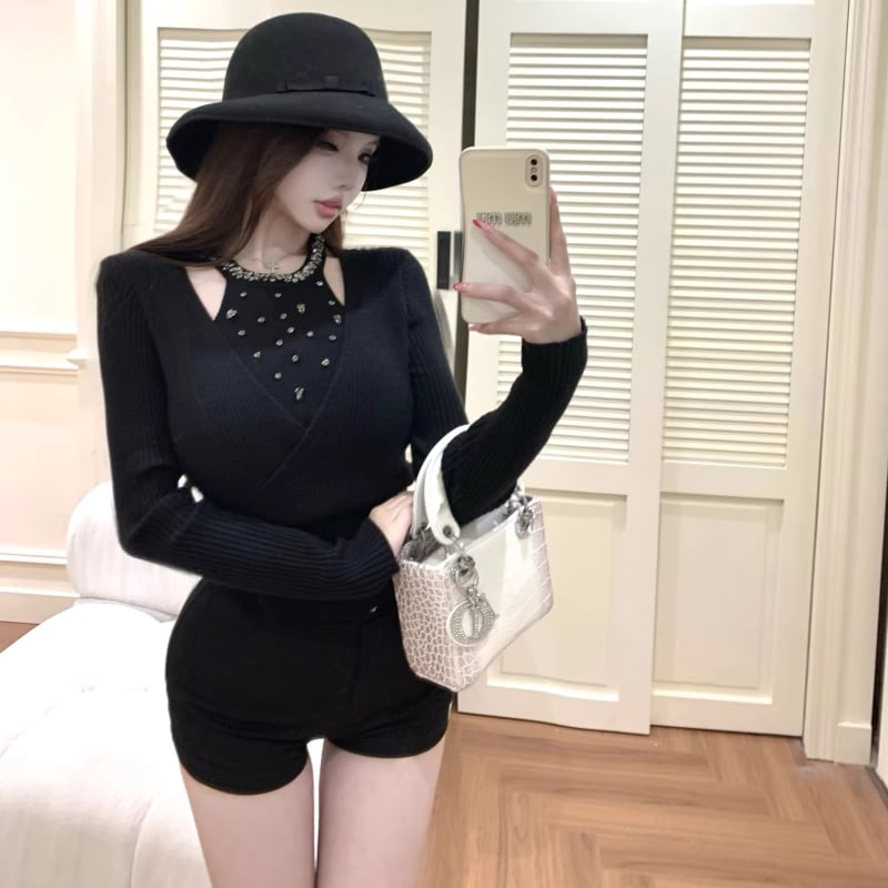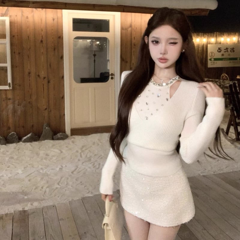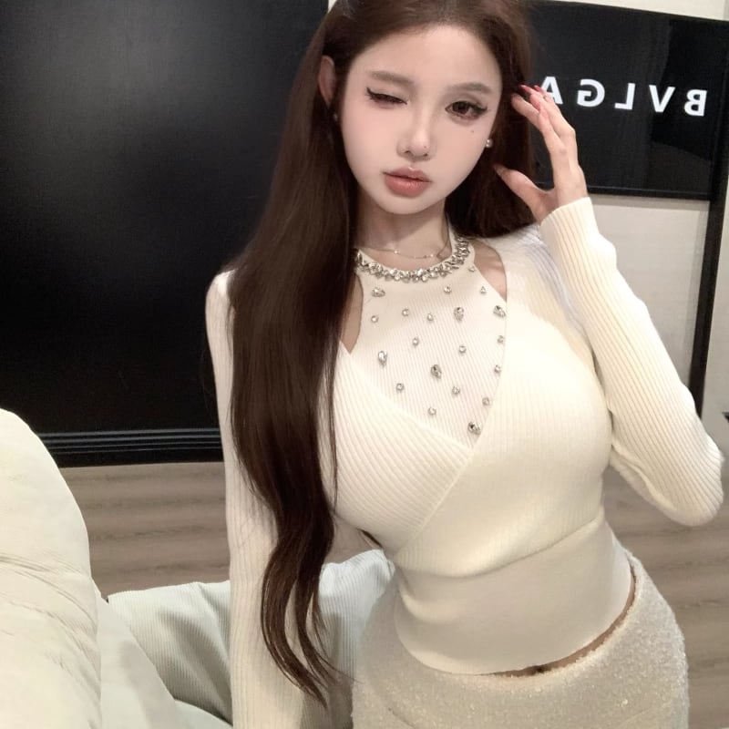 【tops】ラインストーン付きニットトップス Q7614