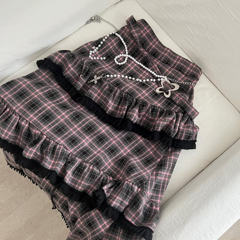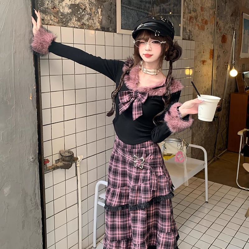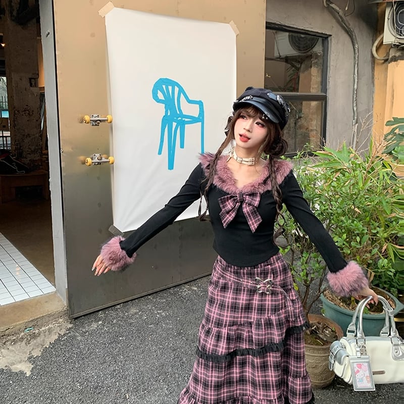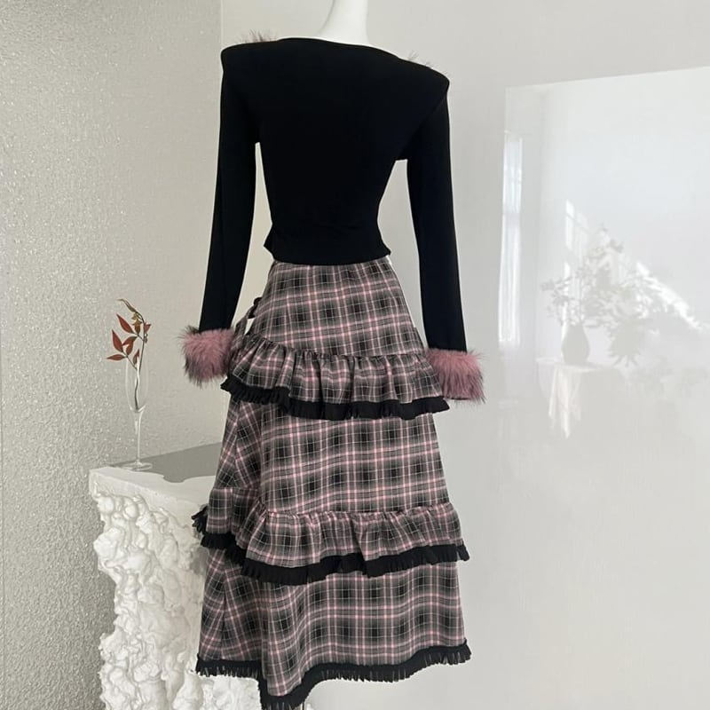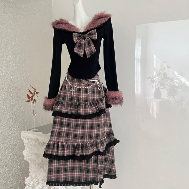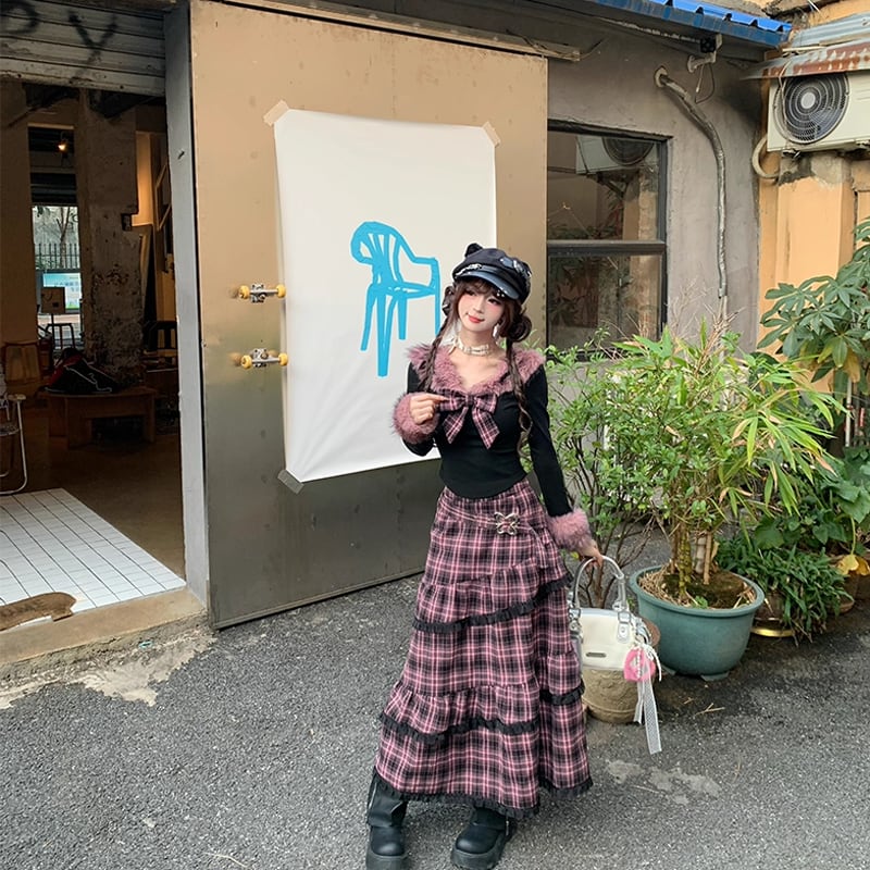 【set】リボン付きファードッキングトップス×ロングティアードスカートセット Q7623