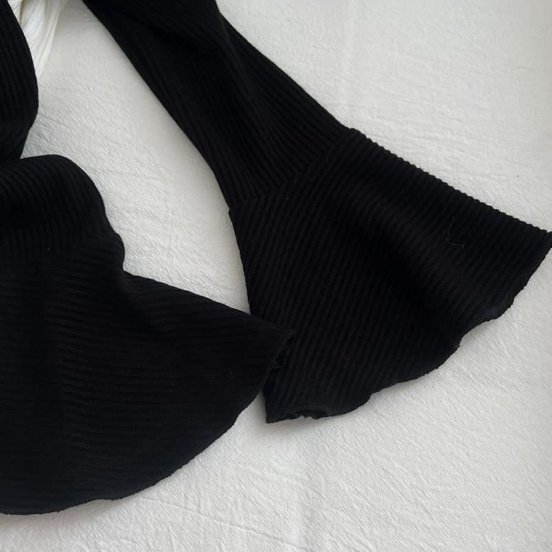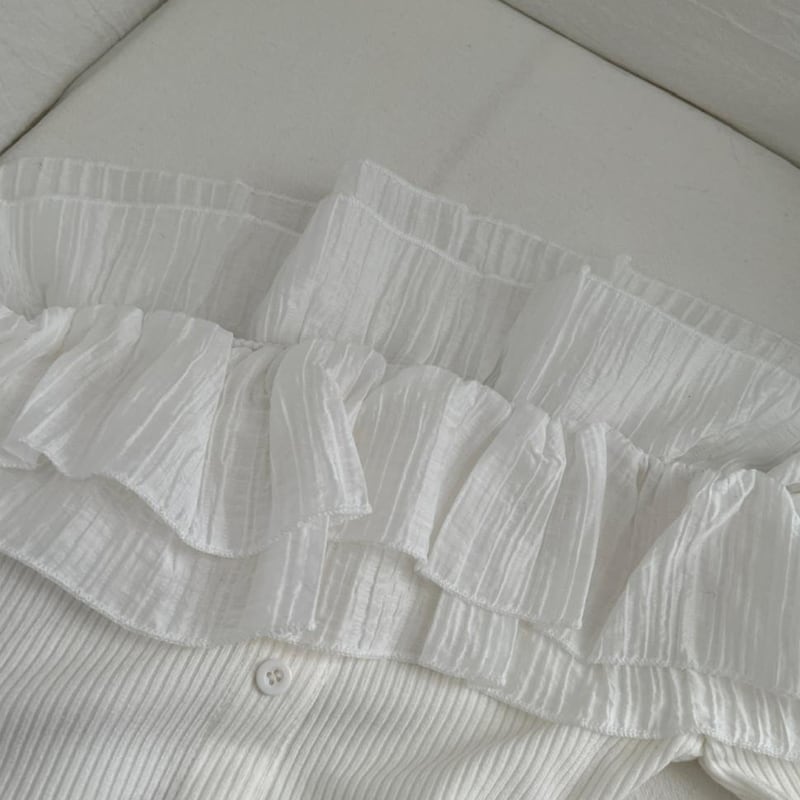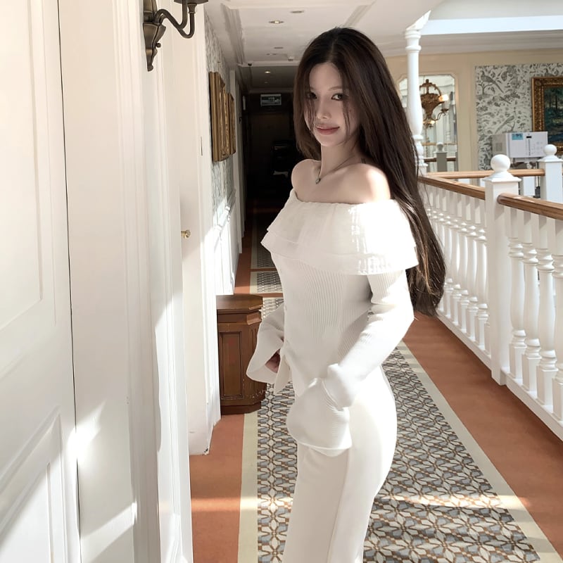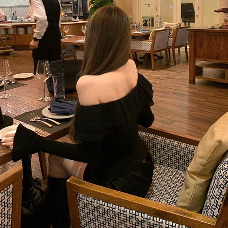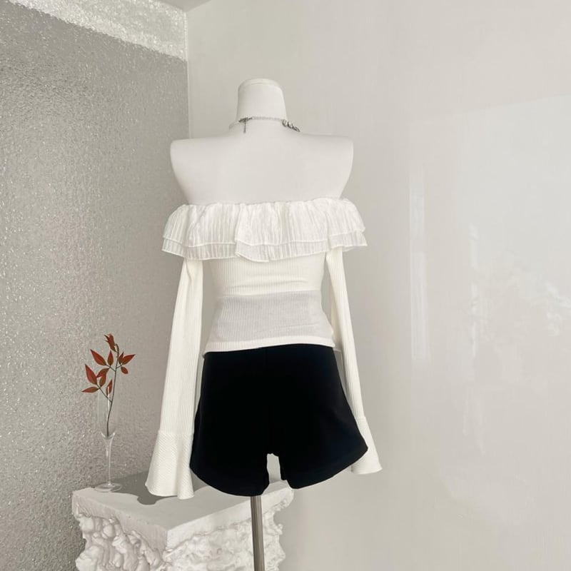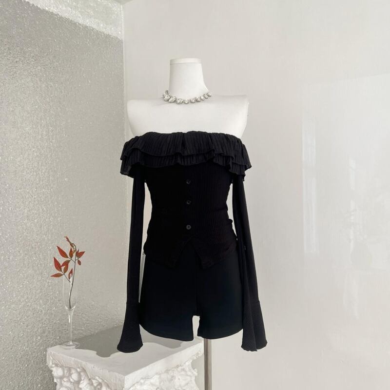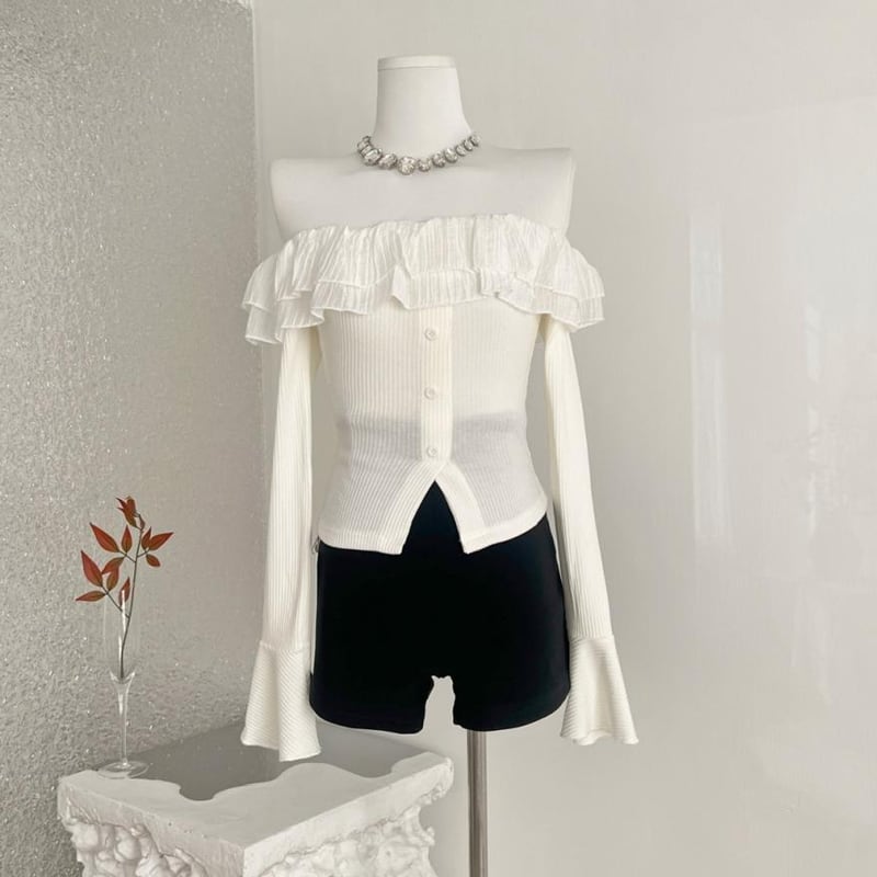 【tops】オフショルダーチュールドッキングニットトップス Q7626
